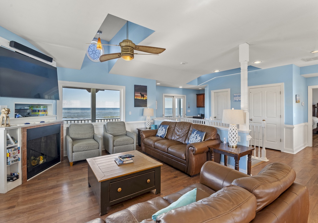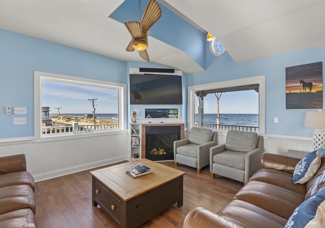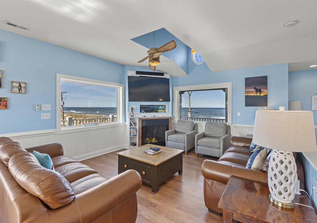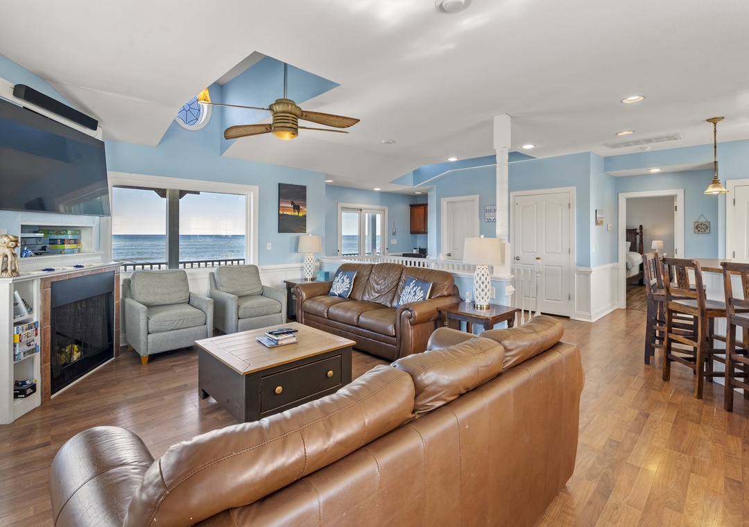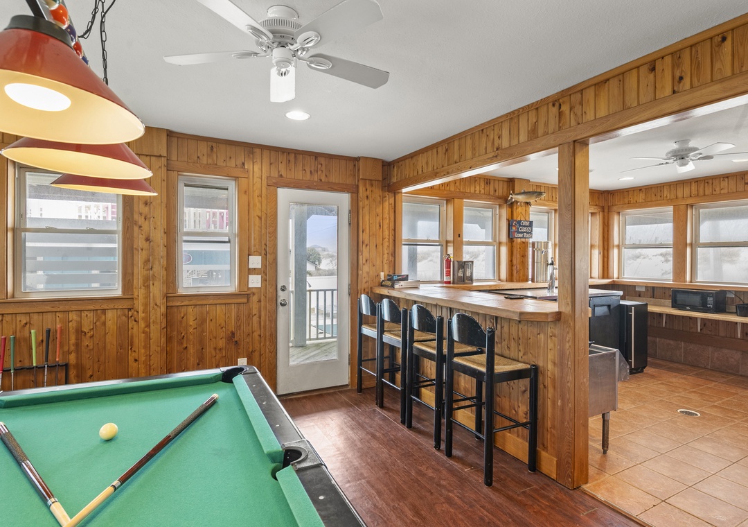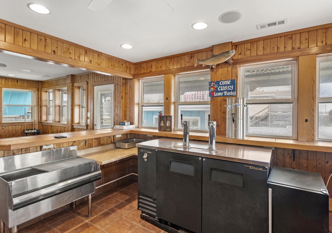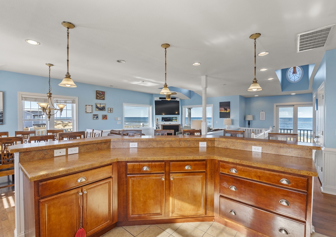 Inside, the delights continue with surprising ways to relax and have fun with family and friends. On the ground floor, choose between a game of pool in the rec room or a movie night in the media room with a 75" screen and tiered, theater-style seating. Open up the windows in the sports bar to serve drinks tiki-style. It's equipped with a commercial fridge, ice maker, sink and even a keg cooler for grabbing a snack or a cold one to enjoy by the pool. An elevator is ideal for guests with mobility issues and makes getting luggage and groceries to the upper levels quick and easy. Gaze upon the breathtaking beauty of the Atlantic Ocean like never before with three levels of wrap-around decks, offering some of the most mesmerizing views found on the Outer Banks.