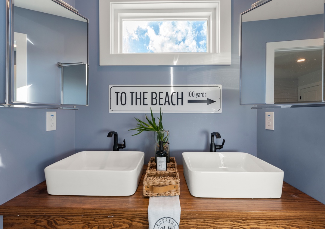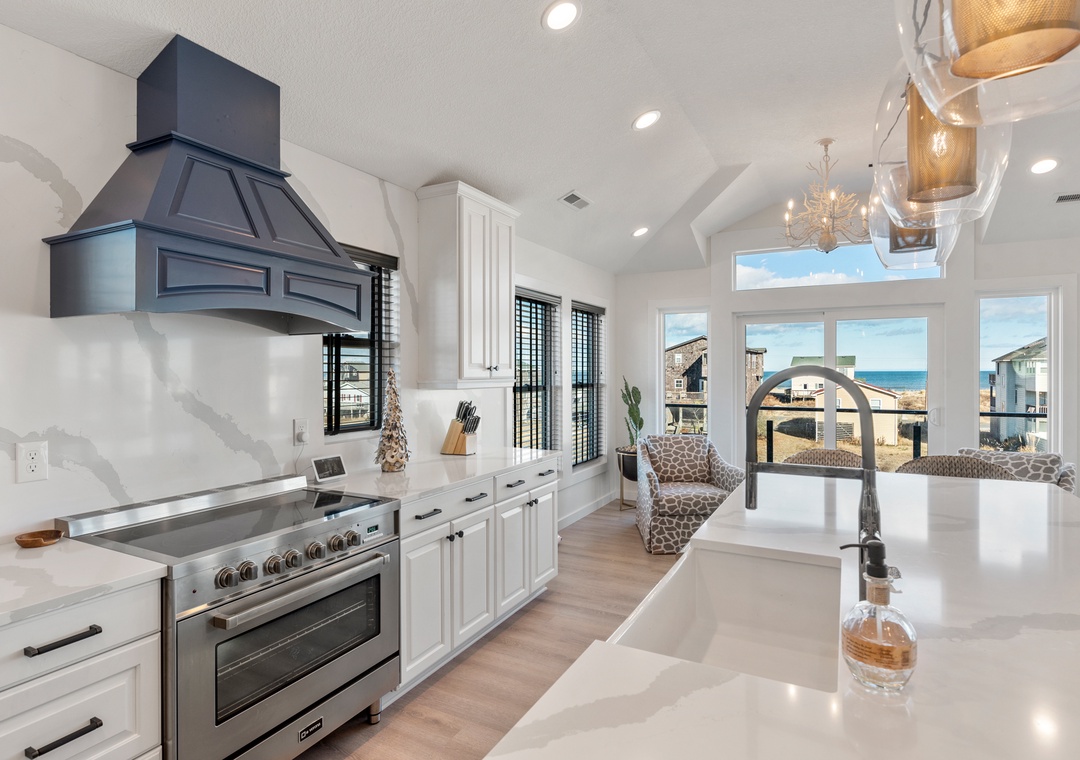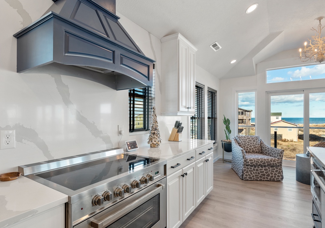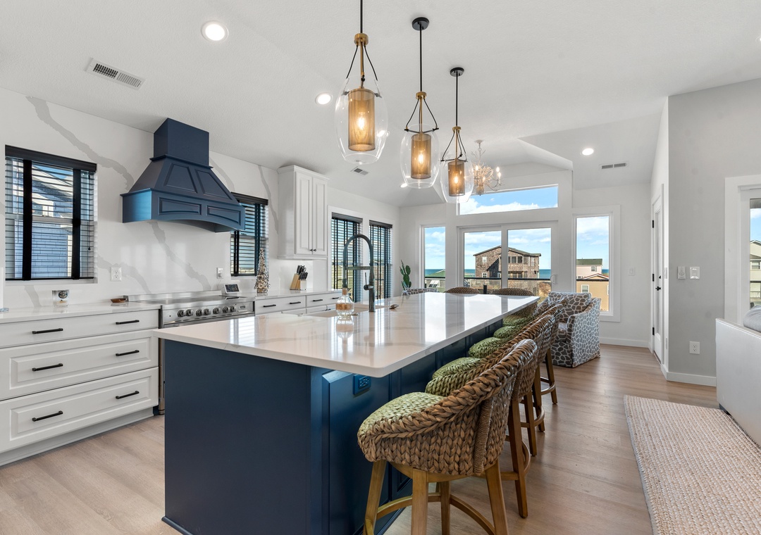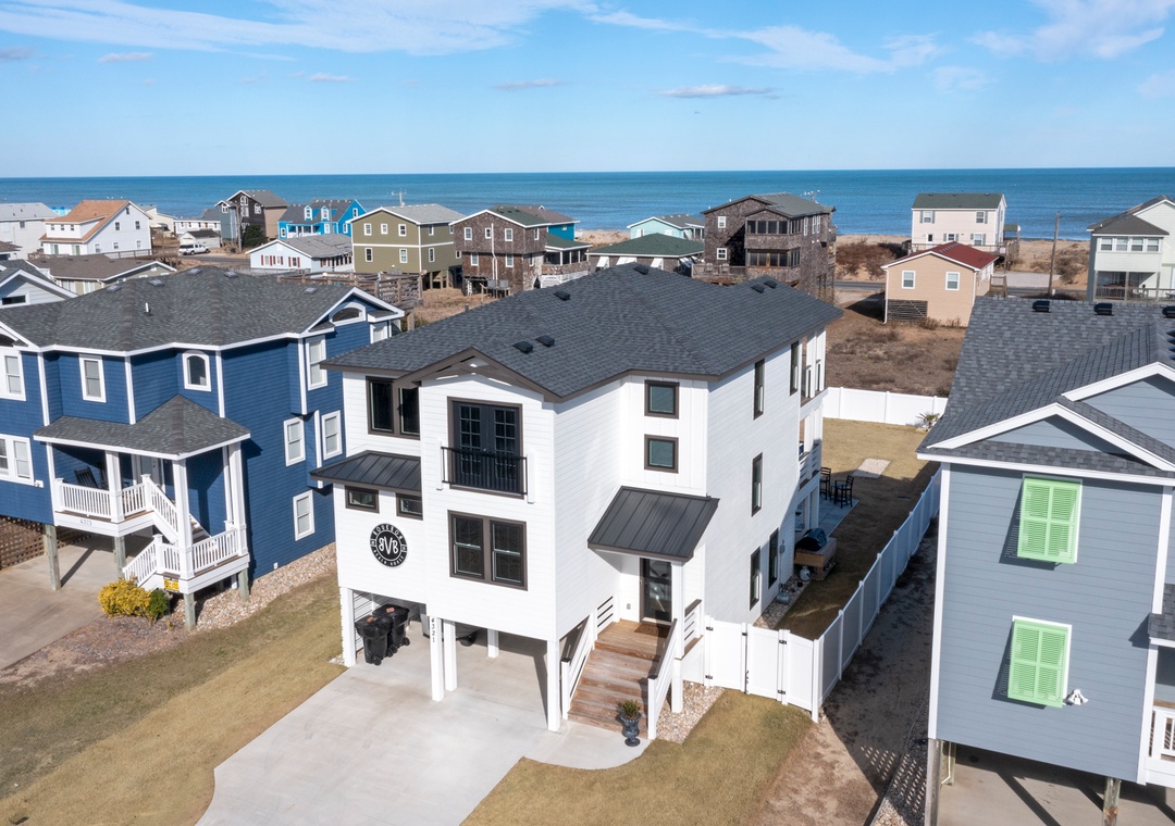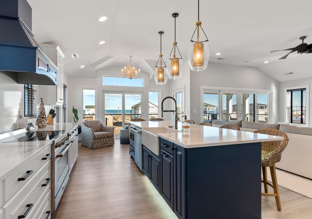 Bourbon Beach House is a newly constructed oceanside home in Kitty Hawk with upscale finishes and one-of-a-kind custom touches you won't find in your average vacation rental. The reverse floorplan features a top-level great room with gorgeous hardwood floors, a shiplap fireplace and direct access to the deck for effortless indoor/outdoor living. The casual, open-concept design allows for easy flow and sightlines from the living area to the eat-in kitchen, ideal for socializing and spending quality time with family and friends. The chef in your group will appreciate the gourmet kitchen's large island and high-end appliances including a Bosch refrigerator, Viking range and microwave drawer, and even a wine fridge! The primary suite is also located on the top level and includes a spa-like private bath. Luxurious upgrades include a custom walk-in shower with three shower heads and a separate soaker tub. Three additional bedrooms are located on the mid-level, including a second ensuite with deck access, along with a spacious den that can serve as a second living area.