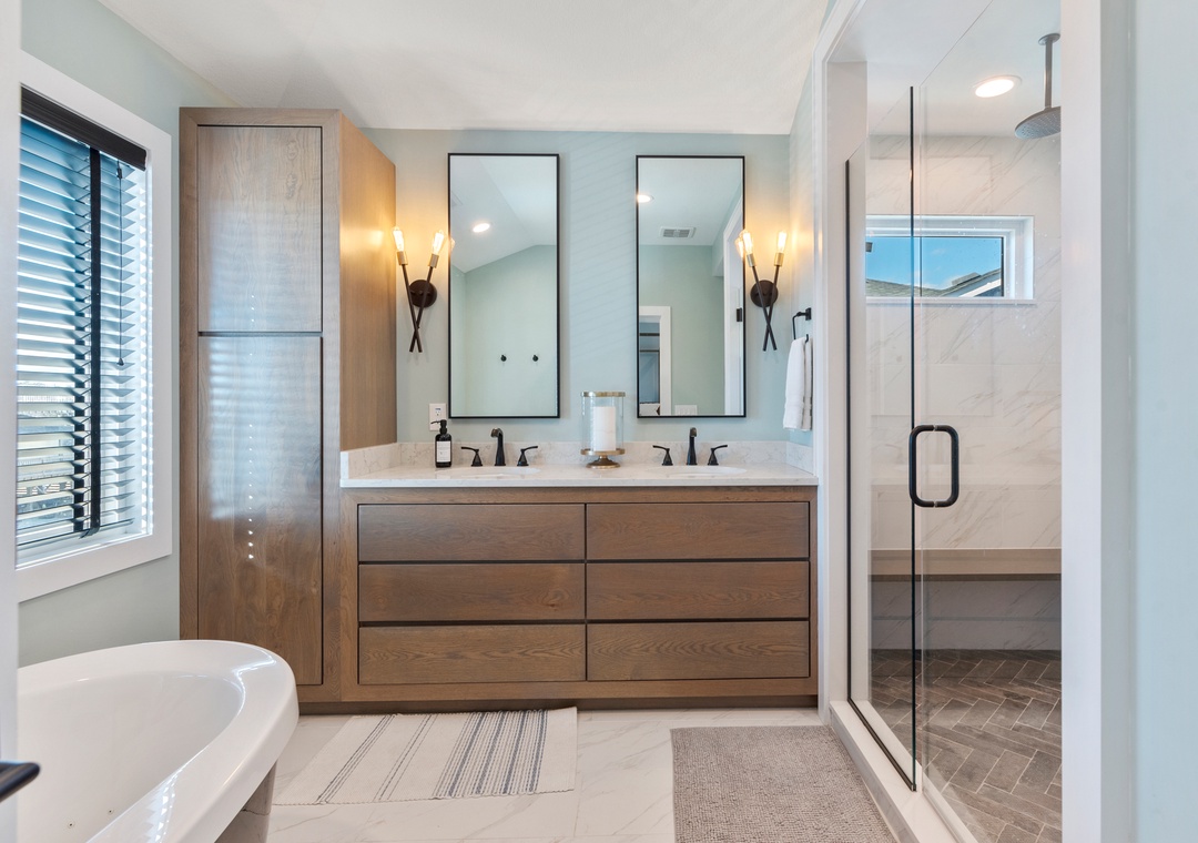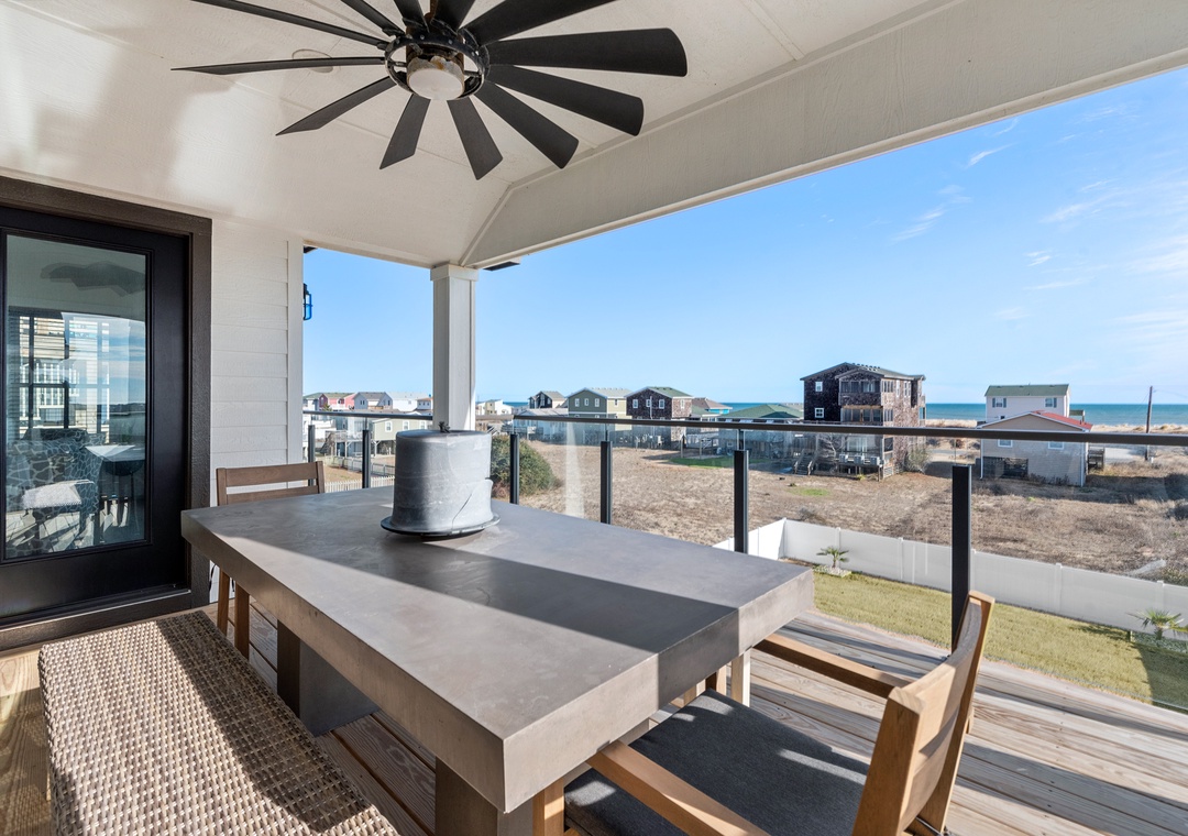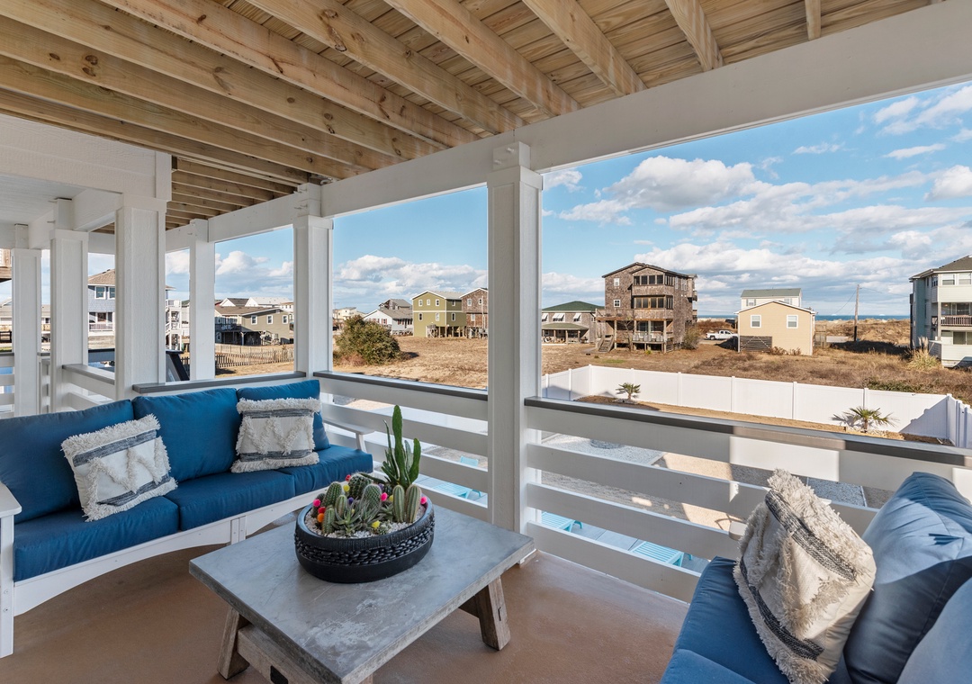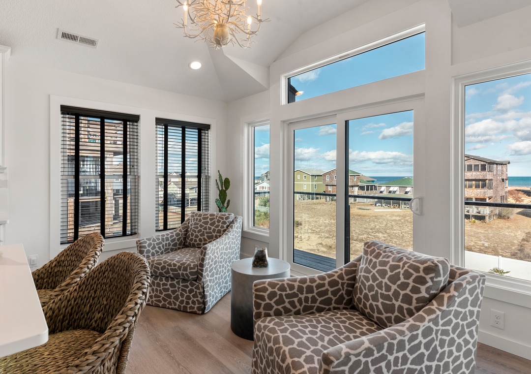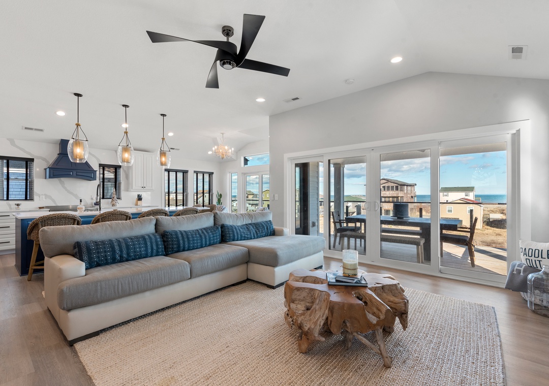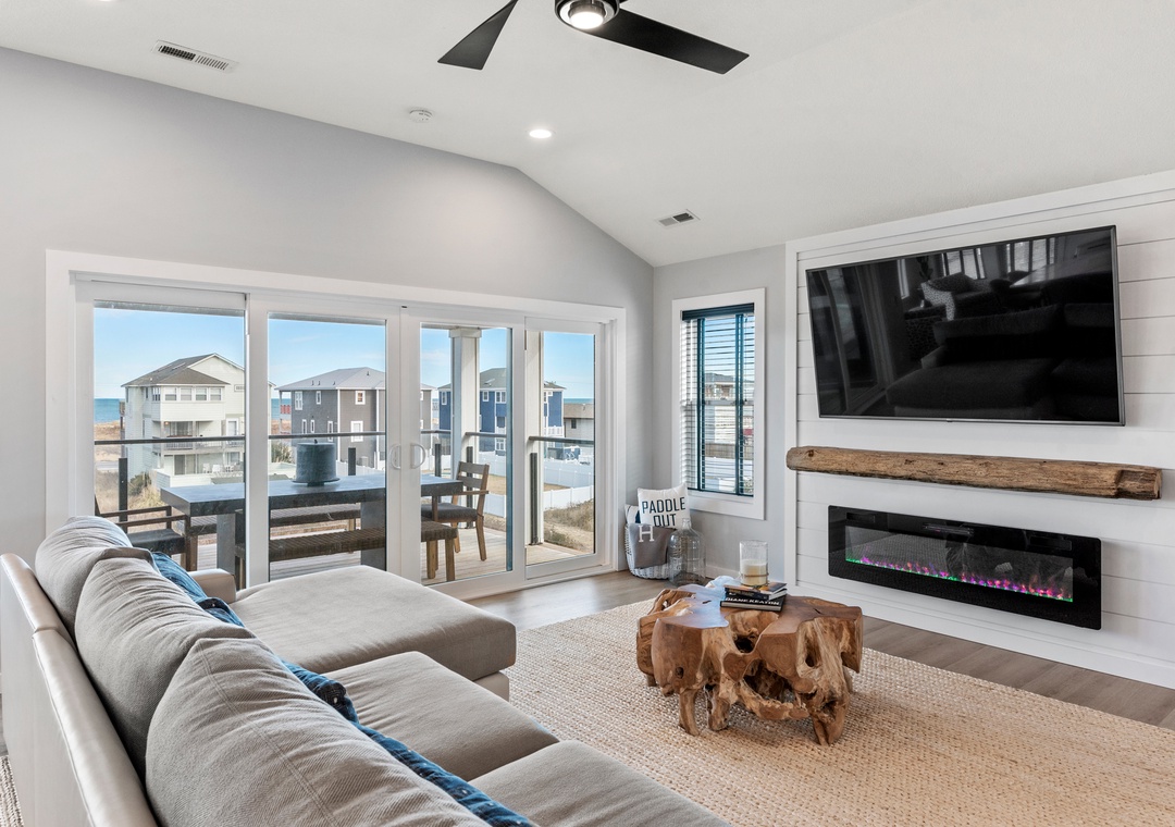 Bourbon Beach House is a newly constructed oceanside home in Kitty Hawk with upscale finishes and one-of-a-kind custom touches you won't find in your average vacation rental. The reverse floorplan features a top-level great room with gorgeous hardwood floors, a shiplap fireplace and direct access to the deck for effortless indoor/outdoor living. The casual, open-concept design allows for easy flow and sightlines from the living area to the eat-in kitchen, ideal for socializing and spending quality time with family and friends. The chef in your group will appreciate the gourmet kitchen's large island and high-end appliances including a Bosch refrigerator, Viking range and microwave drawer, and even a wine fridge! The primary suite is also located on the top level and includes a spa-like private bath. Luxurious upgrades include a custom walk-in shower with three shower heads and a separate soaker tub. Three additional bedrooms are located on the mid-level, including a second ensuite with deck access, along with a spacious den that can serve as a second living area.