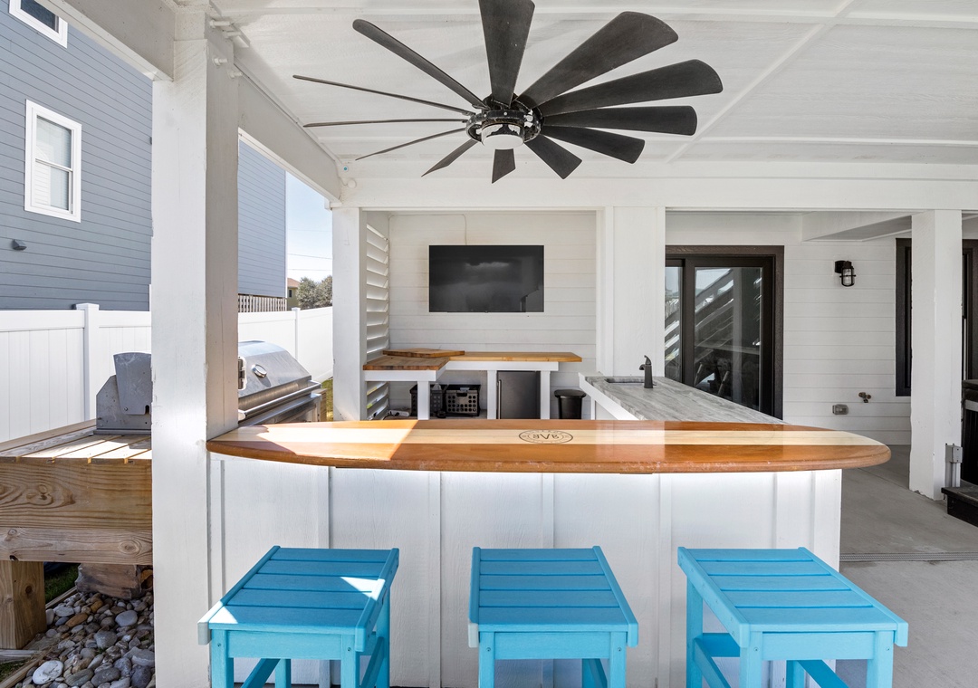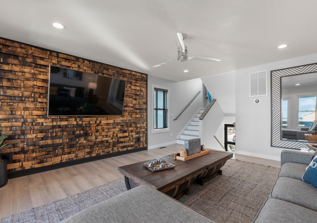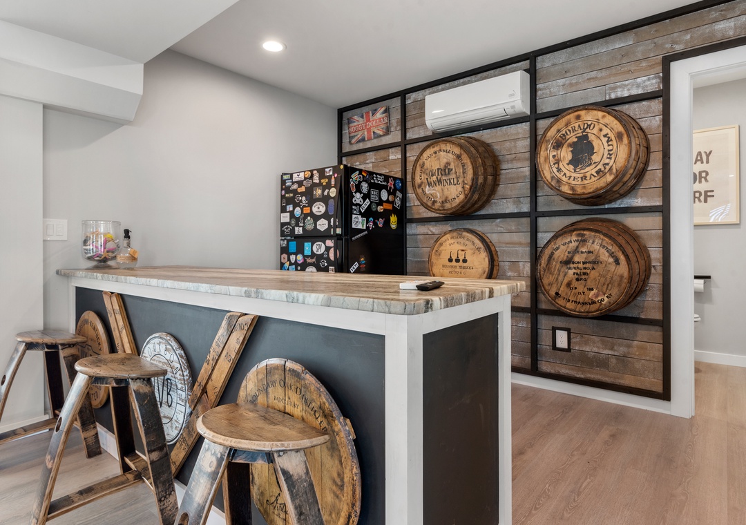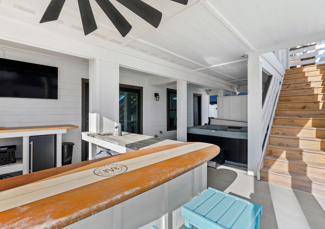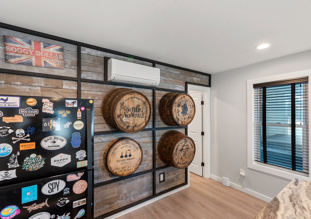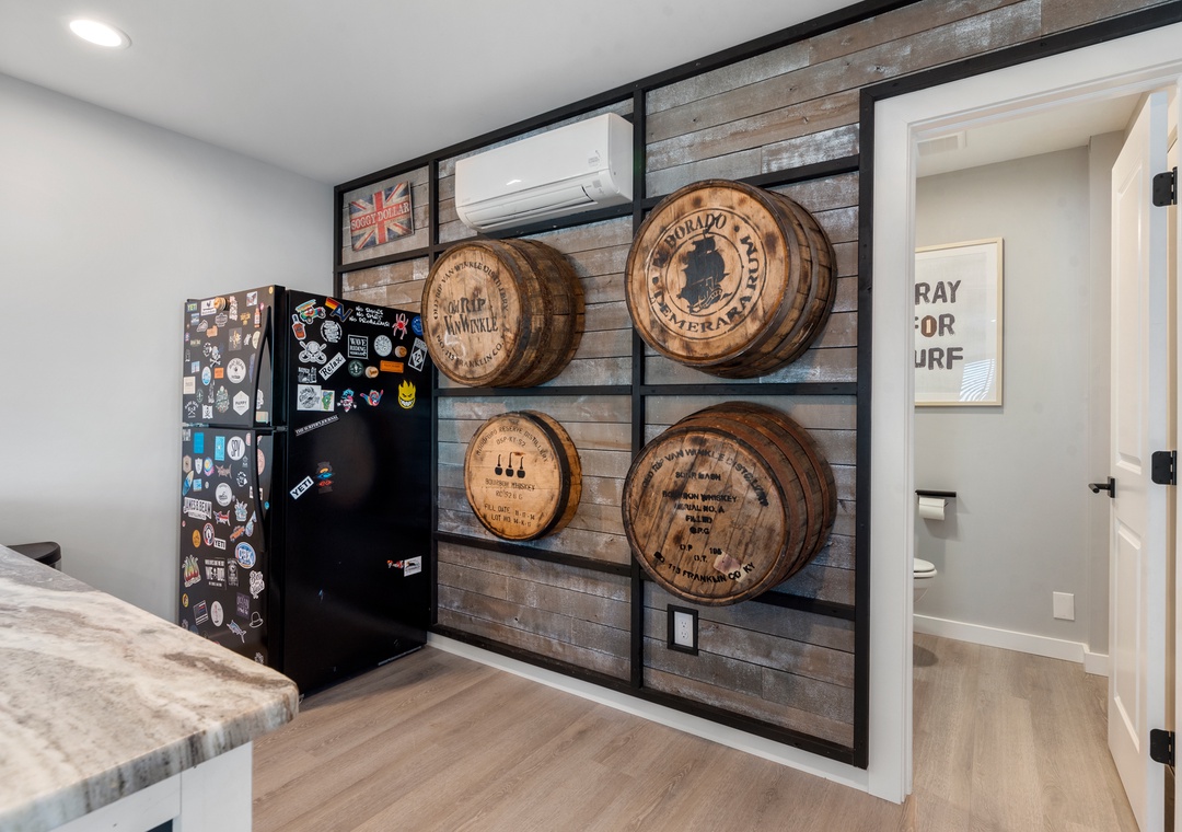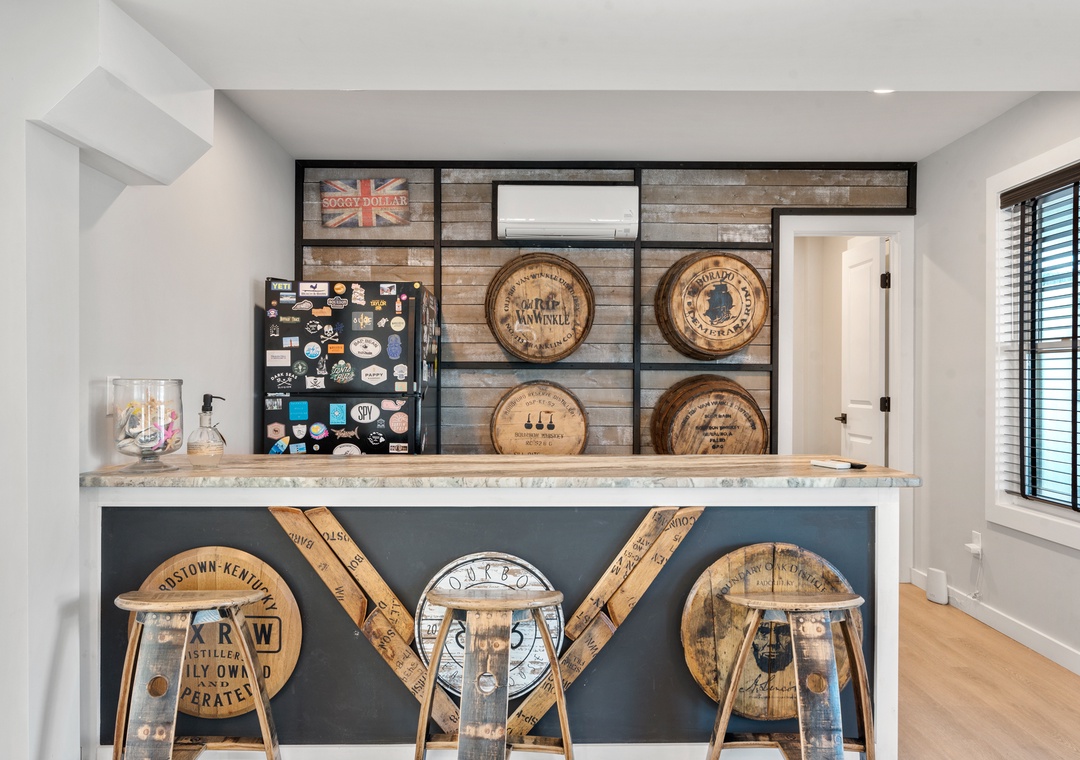 Downstairs. you'll find a bourbon-themed rec space with bar, full size fridge and a custom whisky barrel wall that will get happy hour started anytime of the day. It's conveniently located right off the pool area, along with a half bath. After a day at the beach, the outdoor fun can continue in the backyard. Take a dip in the saltwater pool or a relaxing soak in the hot tub. Use the tiki bar and built-in grill for poolside drinks and cookouts. The barefoot-friendly grass and fully enclosed fencing is perfect for kids. In the evenings, gather around the firepit while planning the next day's adventures.