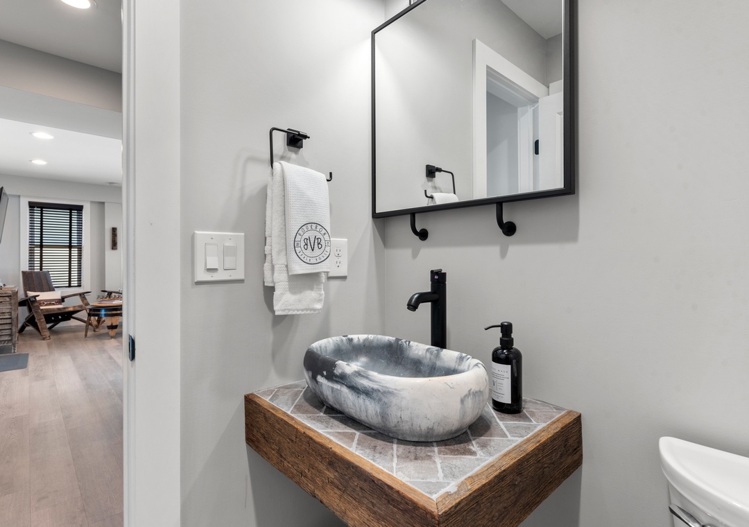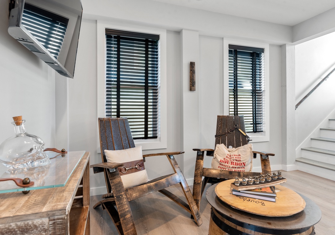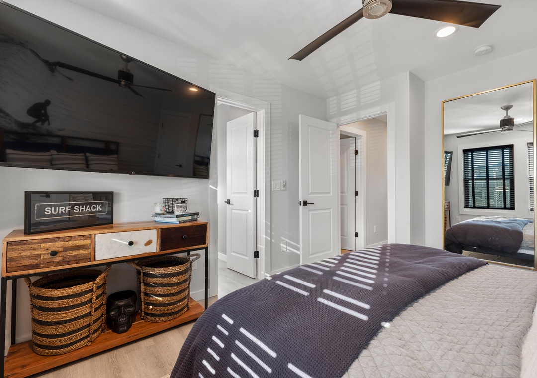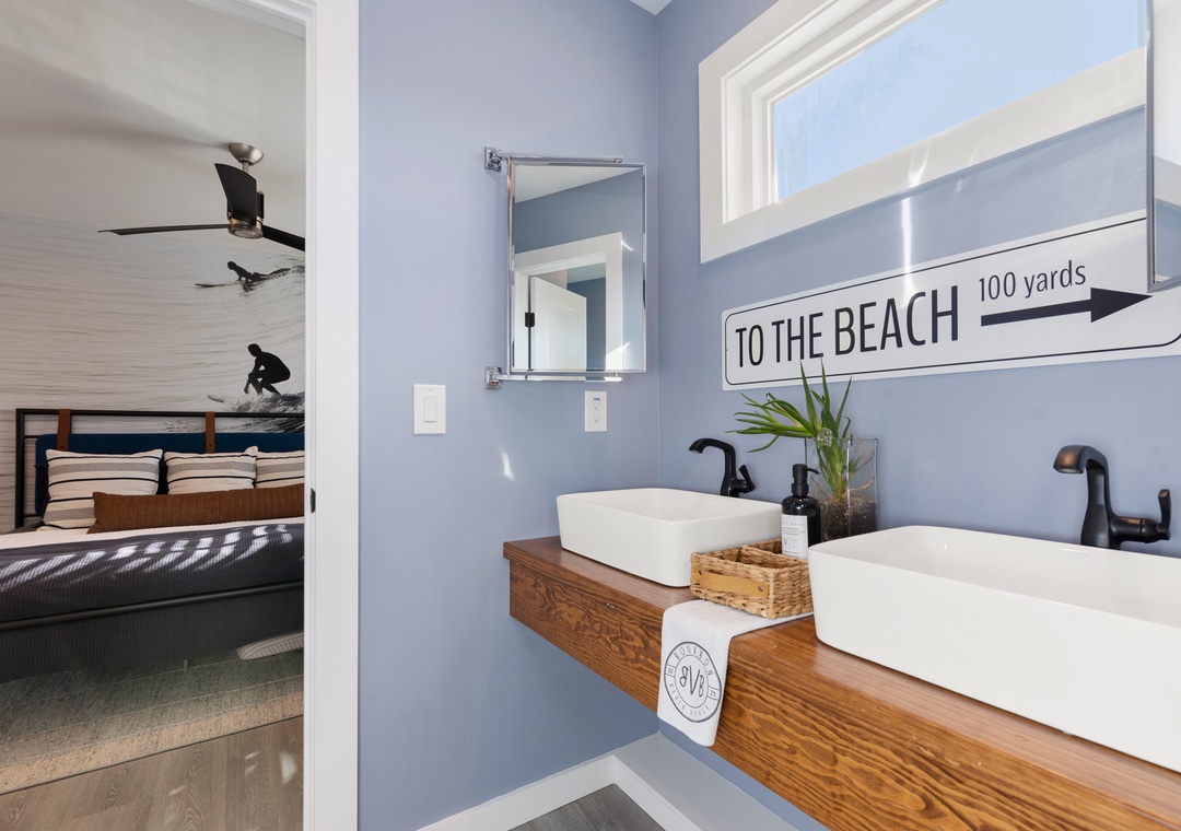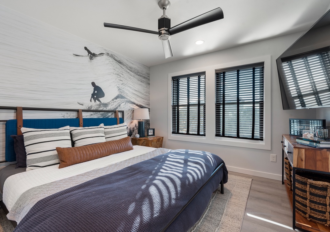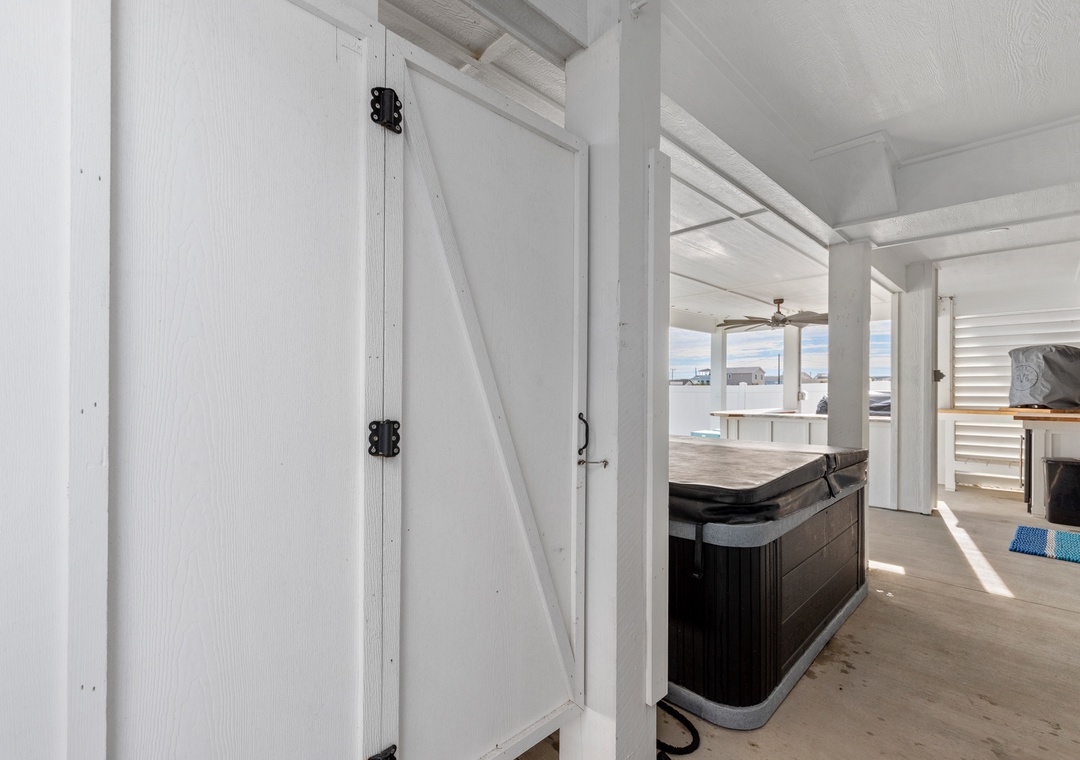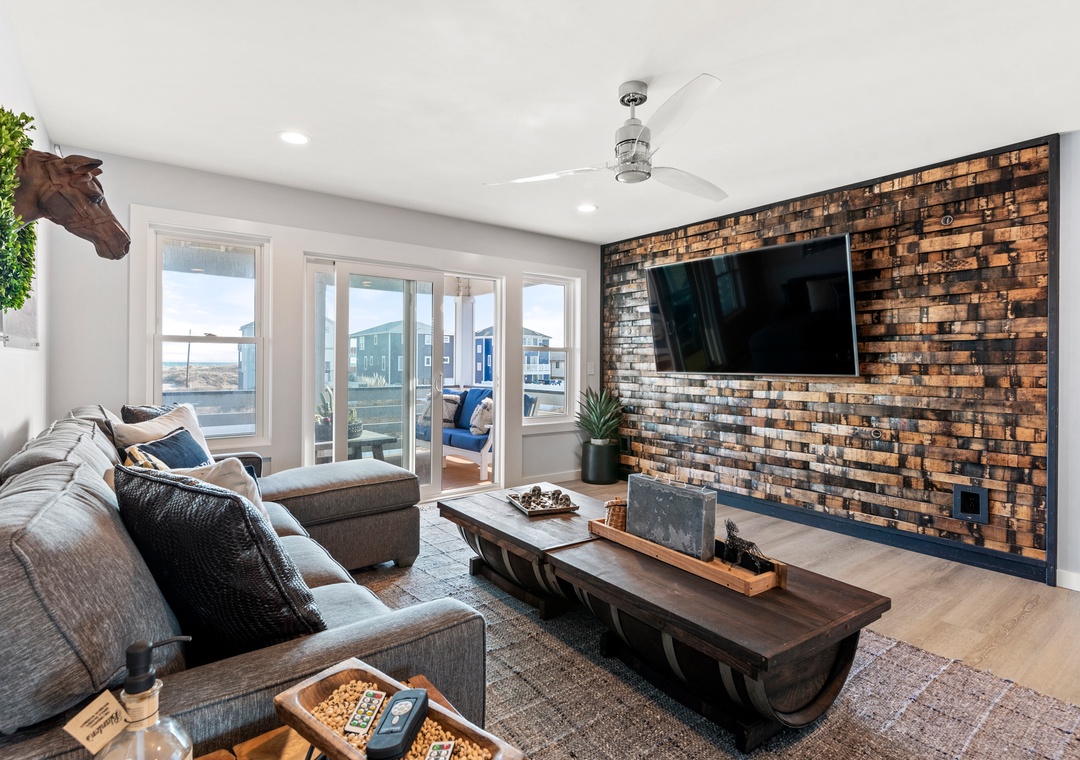 Downstairs. you'll find a bourbon-themed rec space with bar, full size fridge and a custom whisky barrel wall that will get happy hour started anytime of the day. It's conveniently located right off the pool area, along with a half bath. After a day at the beach, the outdoor fun can continue in the backyard. Take a dip in the saltwater pool or a relaxing soak in the hot tub. Use the tiki bar and built-in grill for poolside drinks and cookouts. The barefoot-friendly grass and fully enclosed fencing is perfect for kids. In the evenings, gather around the firepit while planning the next day's adventures.