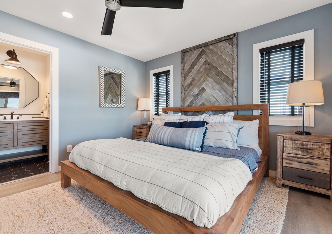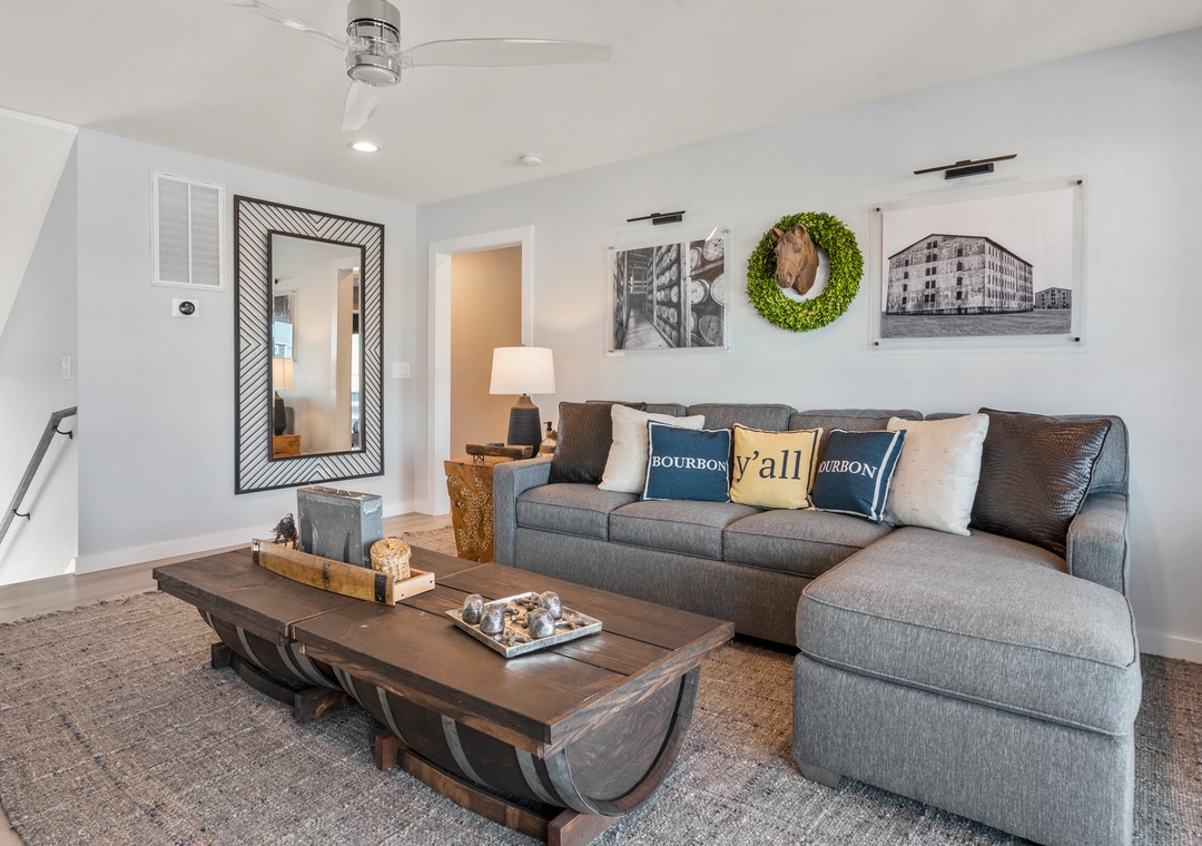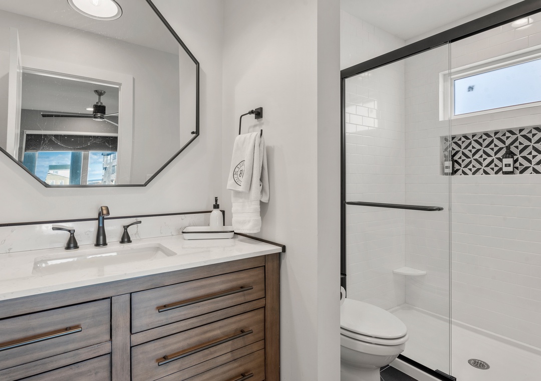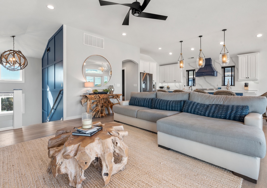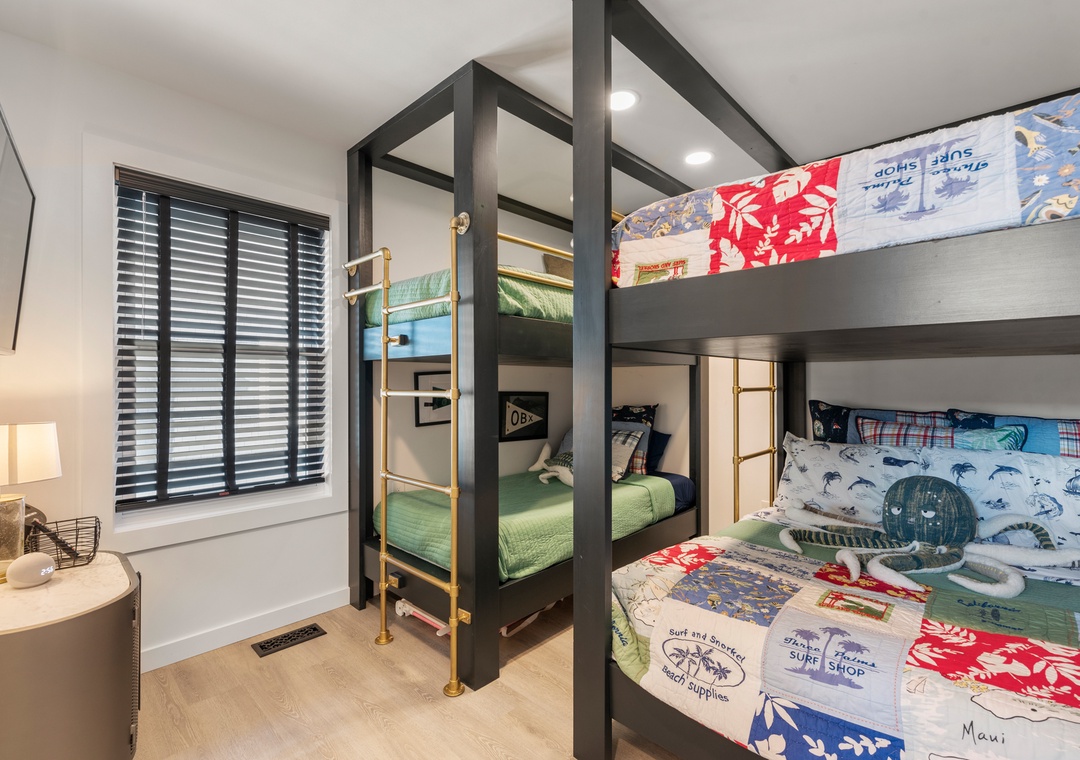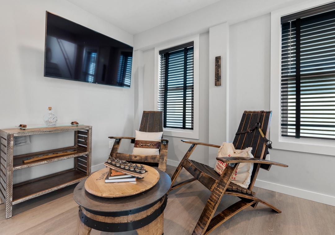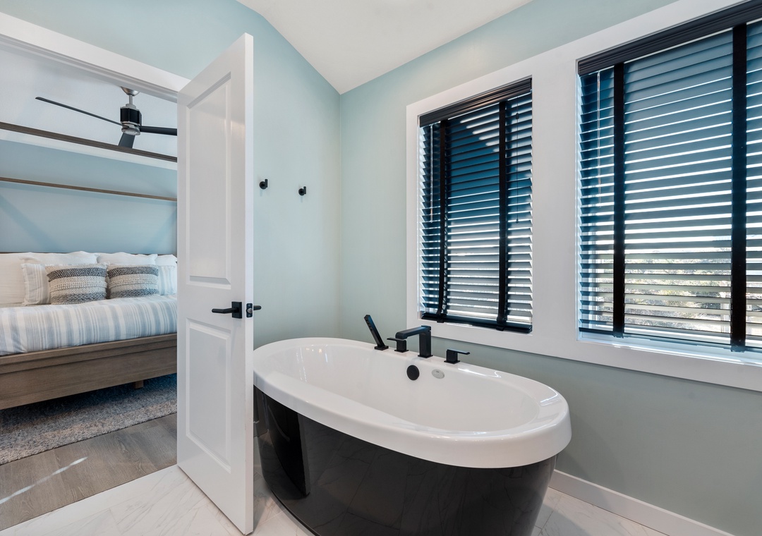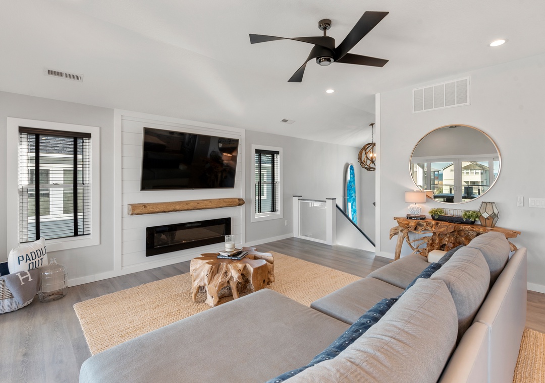 Downstairs. you'll find a bourbon-themed rec space with bar, full size fridge and a custom whisky barrel wall that will get happy hour started anytime of the day. It's conveniently located right off the pool area, along with a half bath. After a day at the beach, the outdoor fun can continue in the backyard. Take a dip in the saltwater pool or a relaxing soak in the hot tub. Use the tiki bar and built-in grill for poolside drinks and cookouts. The barefoot-friendly grass and fully enclosed fencing is perfect for kids. In the evenings, gather around the firepit while planning the next day's adventures.