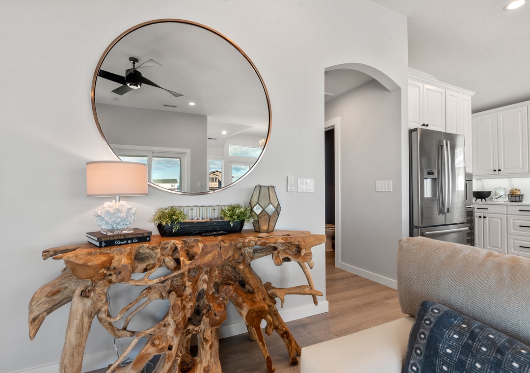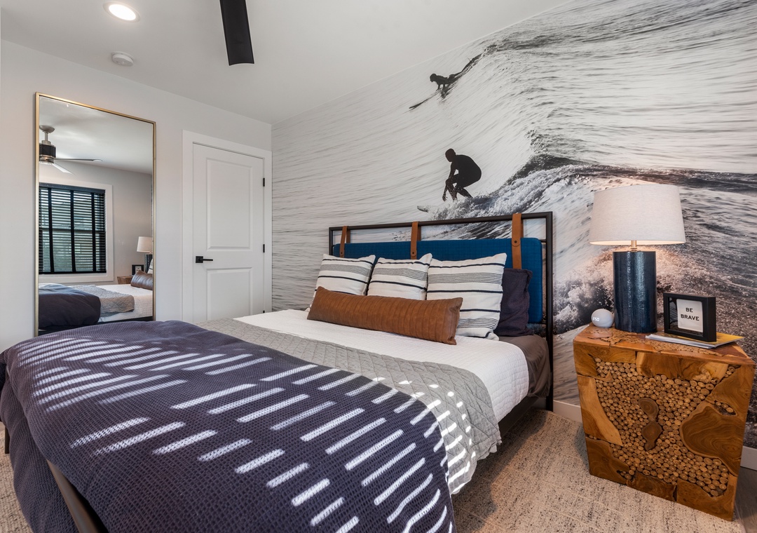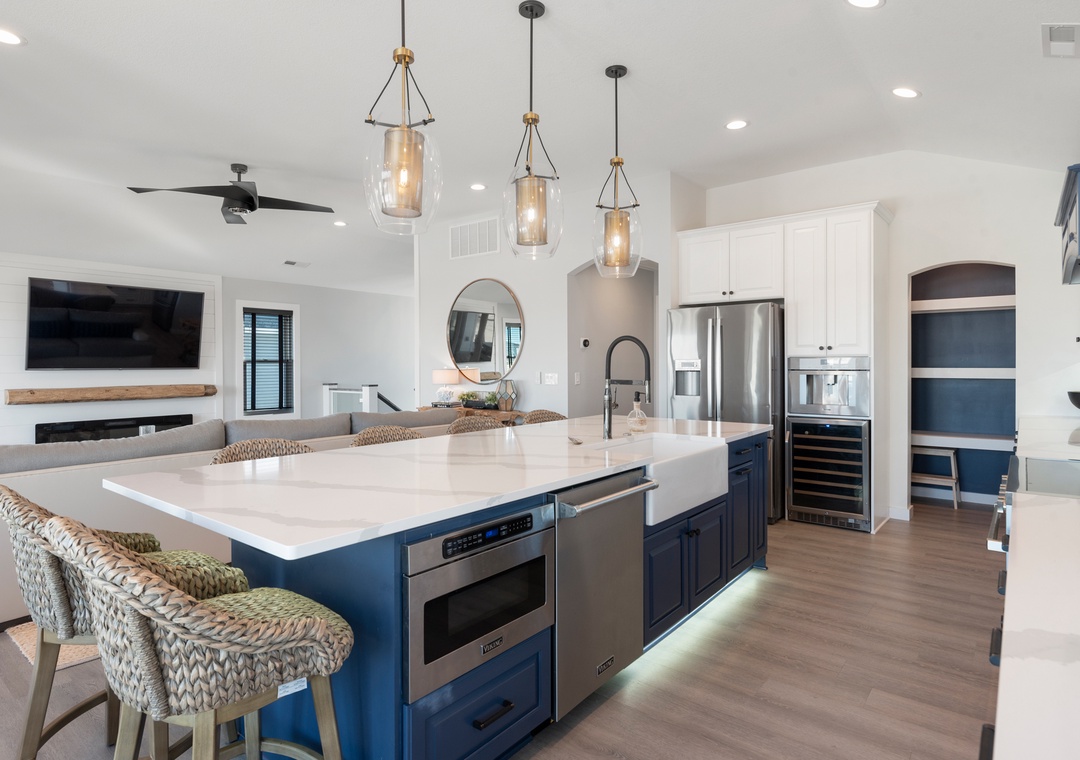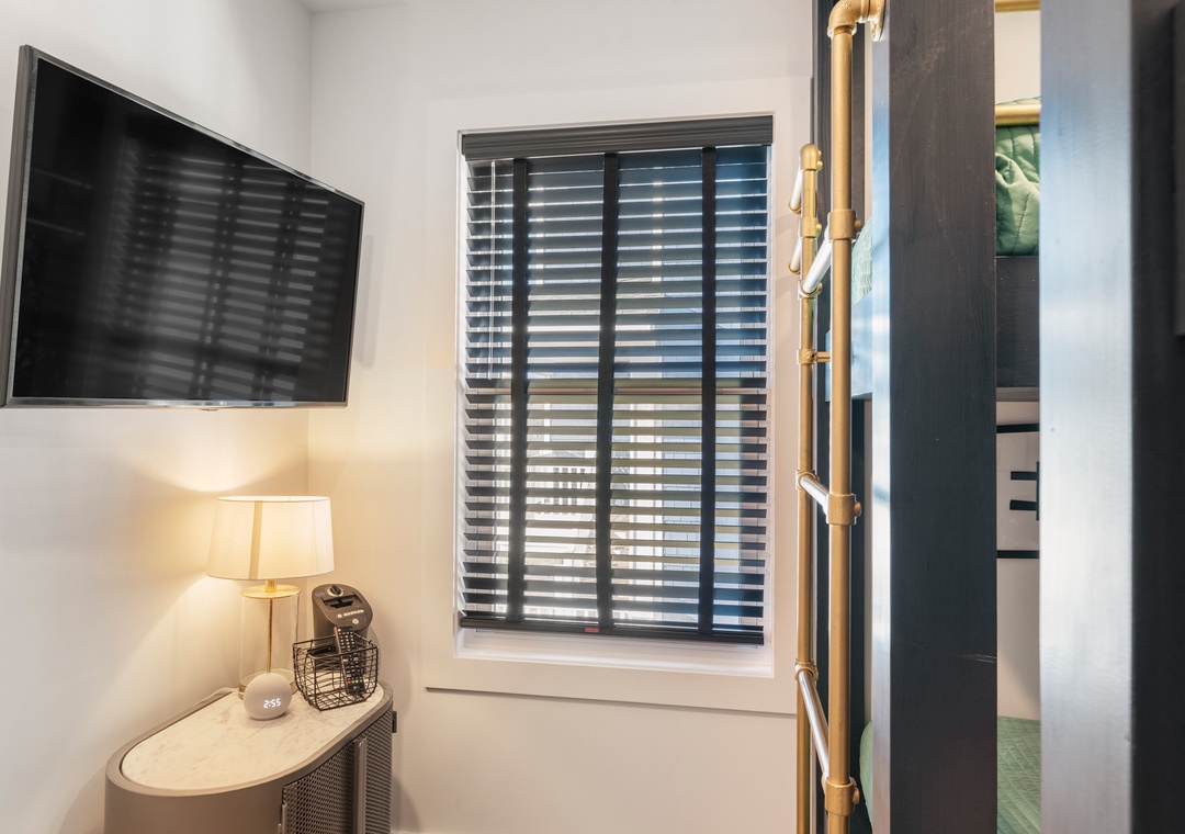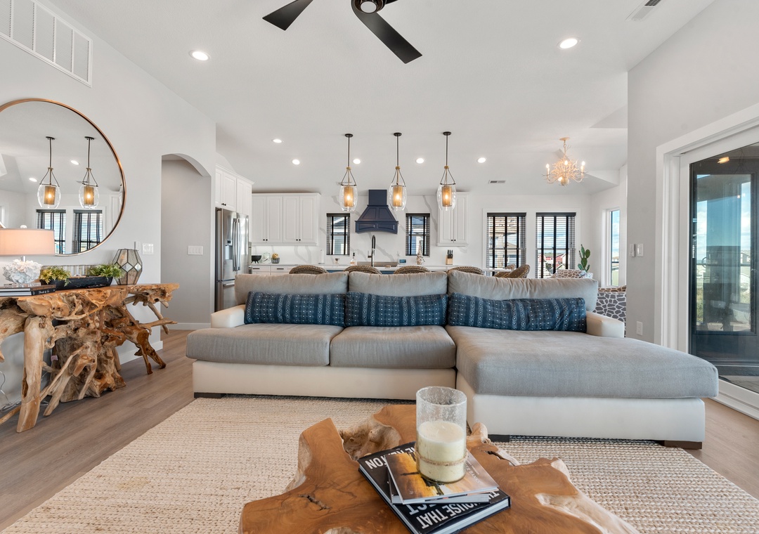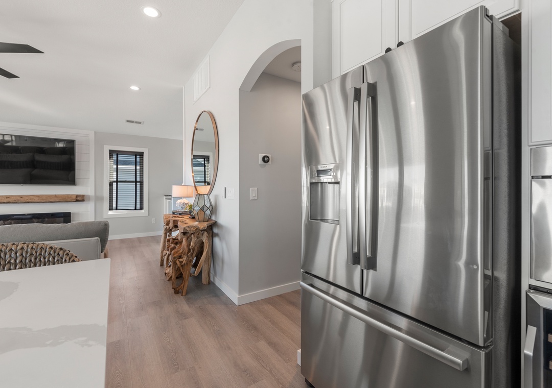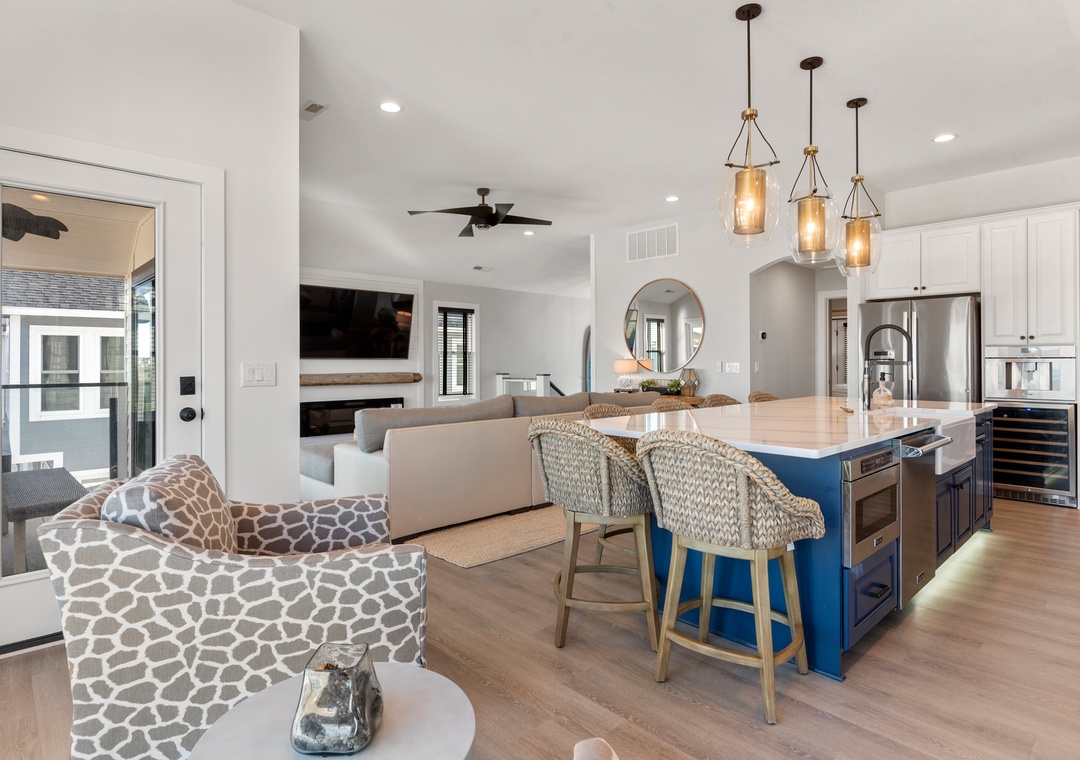 Downstairs. you'll find a bourbon-themed rec space with bar, full size fridge and a custom whisky barrel wall that will get happy hour started anytime of the day. It's conveniently located right off the pool area, along with a half bath. After a day at the beach, the outdoor fun can continue in the backyard. Take a dip in the saltwater pool or a relaxing soak in the hot tub. Use the tiki bar and built-in grill for poolside drinks and cookouts. The barefoot-friendly grass and fully enclosed fencing is perfect for kids. In the evenings, gather around the firepit while planning the next day's adventures.