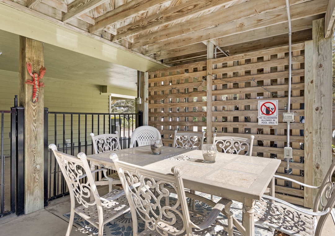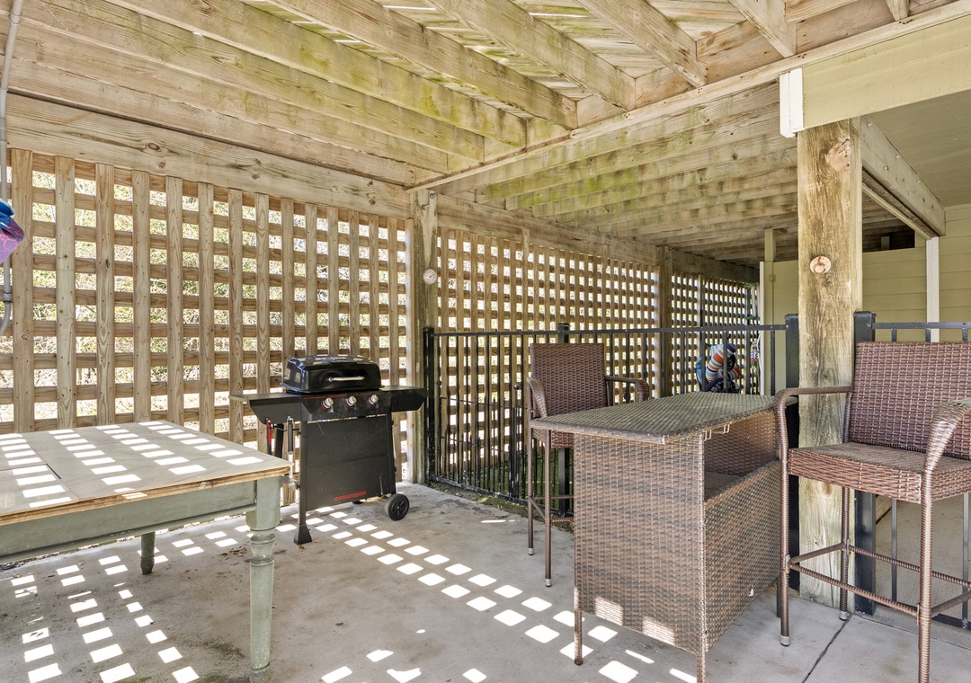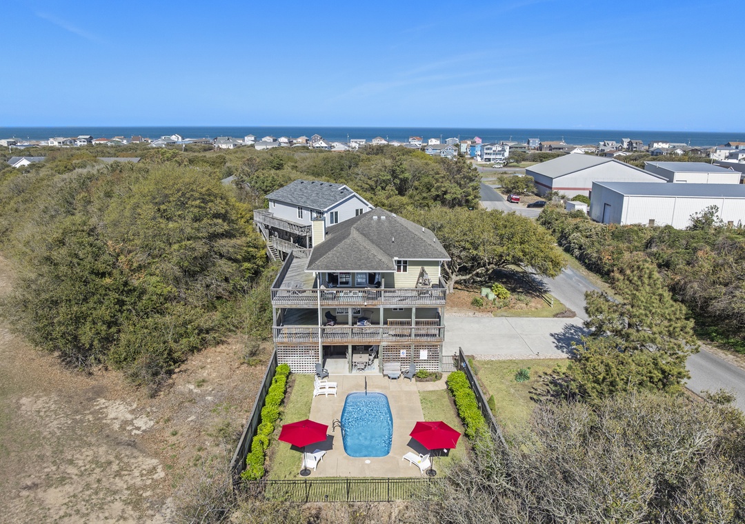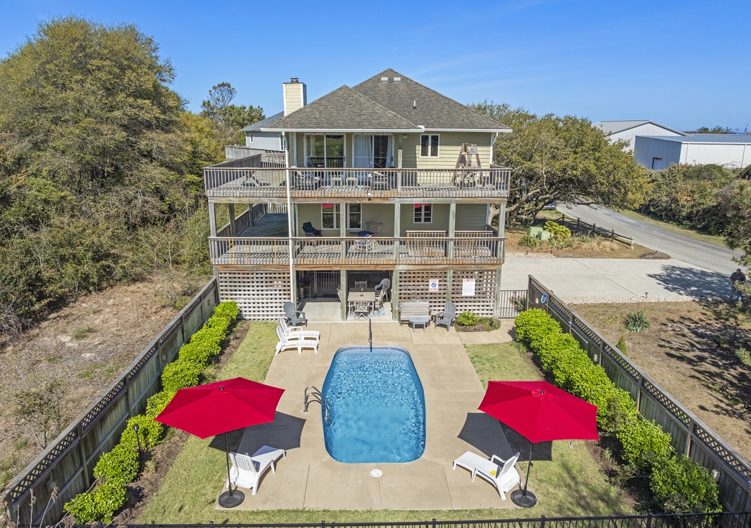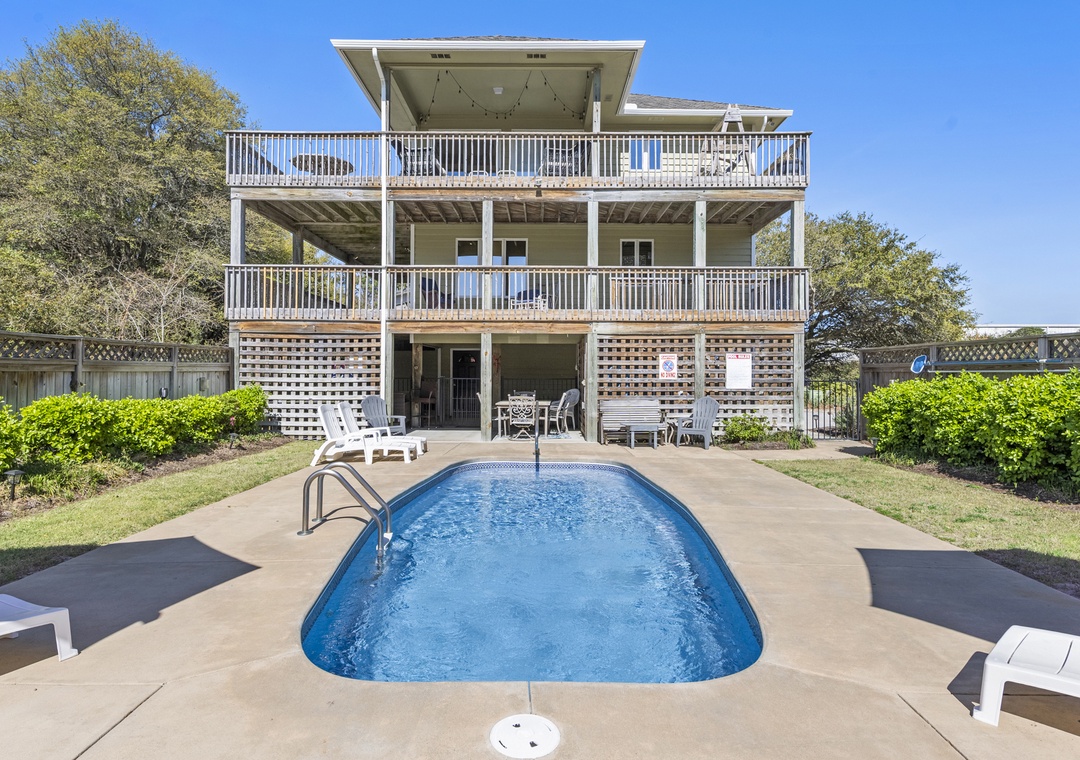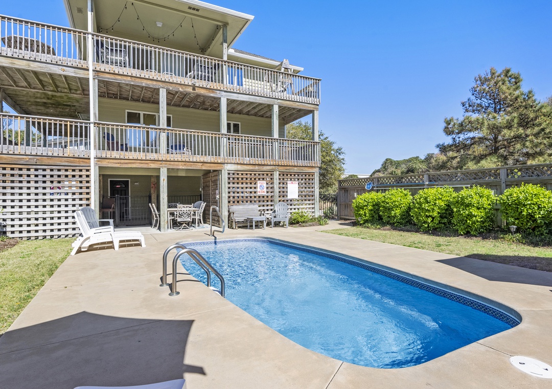 From the moment you arrive, you'll be greeted by a spacious exterior with parking for four vehicles, a welcoming covered entry, a gas grill for outdoor cooking, an enclosed outside shower, and a private swimming pool perfect for unwinding after a day at the beach.