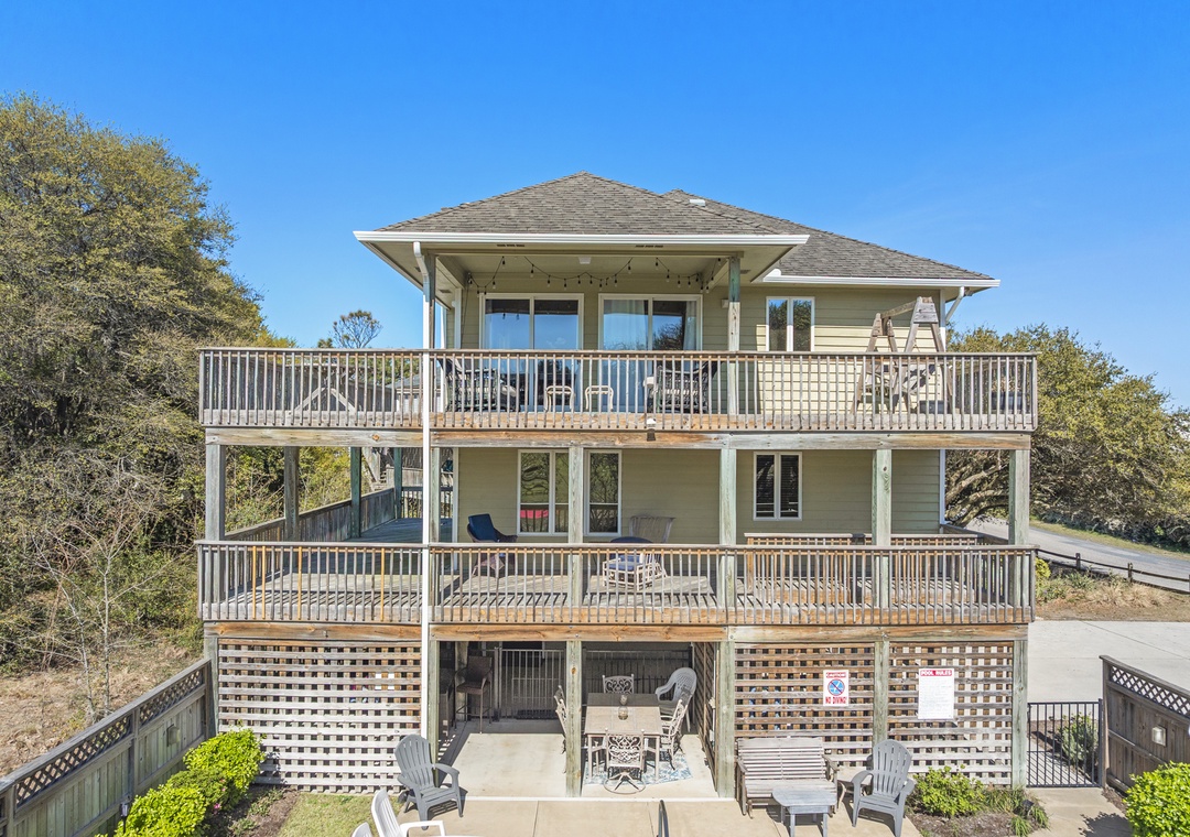 Inside the ground level offers a relaxing lounge area with comfortable seating! On the mid-level, you'll find three beautifully appointed bedrooms: two kings, and a third with two twin beds. This level also features a full bathroom and a wrap-around covered porch ideal for enjoying the coastal breeze.