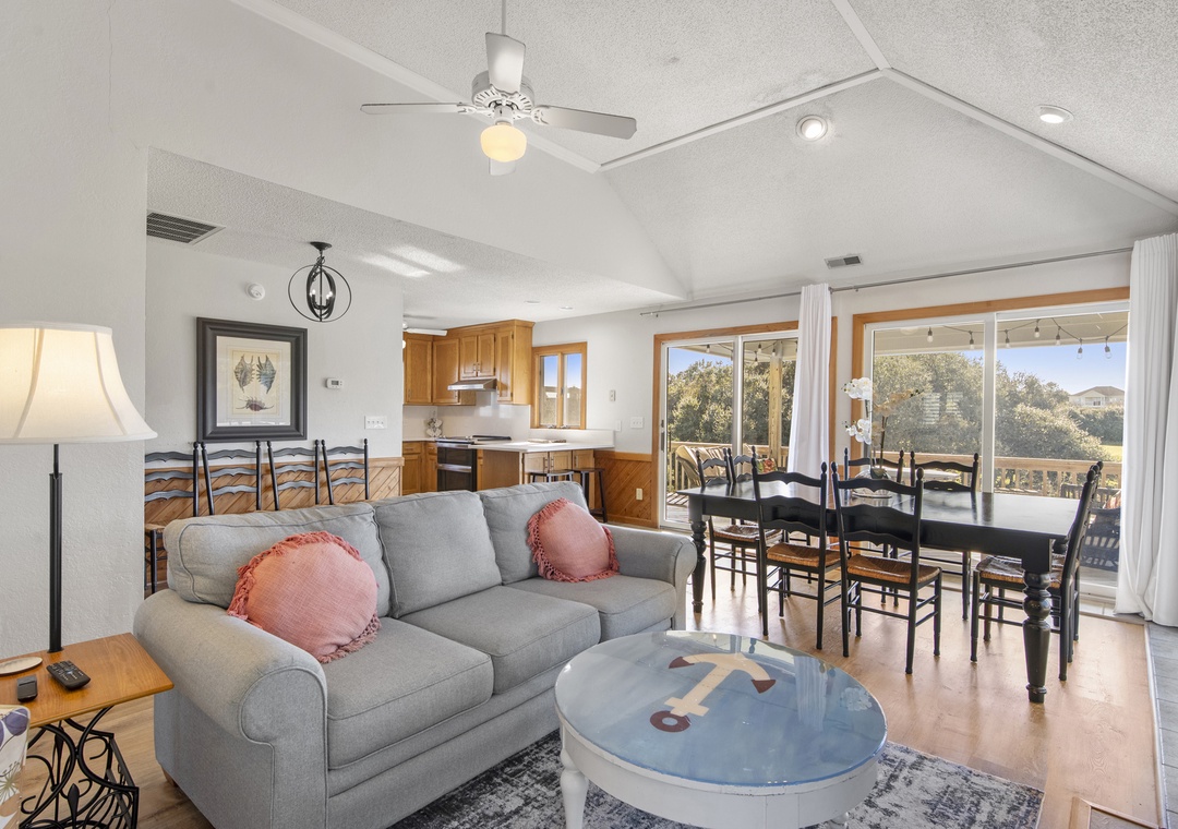 The top level is the heart of the home, featuring a spacious living area with a large TV, a fully equipped kitchen, and a dining area with excellent views of the nearby golf course. A fourth bedroom with a king bed and a full bath nearby completes this floor, along with access to both a covered deck and a sun deck for soaking in the Outer Banks sunshine!