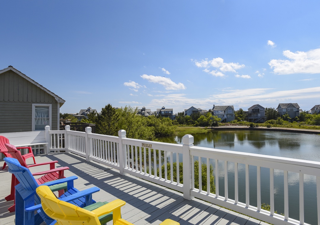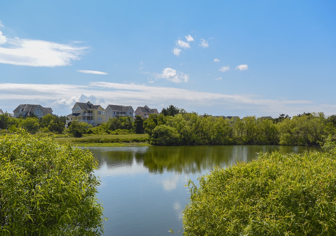 Gone Fishin is located on the water's edge of a beautiful spring-fed lake, on the 13th fairway. The home offers views of Roanoke Sound and is convenient to all the Outer Banks has to offer. This 3-bedroom OBX vacation home in Nags Head features your own private hot tub and expanded upper and lower decks. It is equipped with WiFi, TVs, DVD players, a high chair, an outside shower, and a charcoal grill, making it very family-friendly.