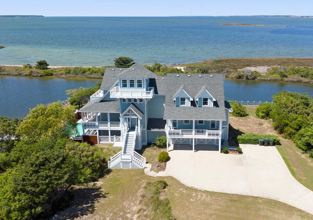Located on a point in the Roanoke Sound, this distinctive cottage with a coastal watchtower claims almost 360-degree views from the Bodie Island Lighthouse to the south, to Roanoke Island in the west, the Roanoke Sound to the north, and Nags Head to the east. You'll never stay anywhere else after vacationing in this spacious cottage which captures sunrises, spectacular sunsets, and the flickering light of the lighthouse at night. From the expansive porches which surround the house, watch sailboats, jet skiers, kite boarders and wind surfers. Go fishing or crabbing off the dock or the banks just feet from the house. Bring your own or rent a kayak and explore the canals, shoreline, and islands in the sound or bring your own boat or jet ski and enjoy the private beach located nearby. Splash around and cool off in the large 24' saltwater pool or warm up in the evening in the 6-person hot tub. You can always find somewhere to spread out and relax in this 5,700 square-foot house with so many amenities on its nearly one-acre lot.