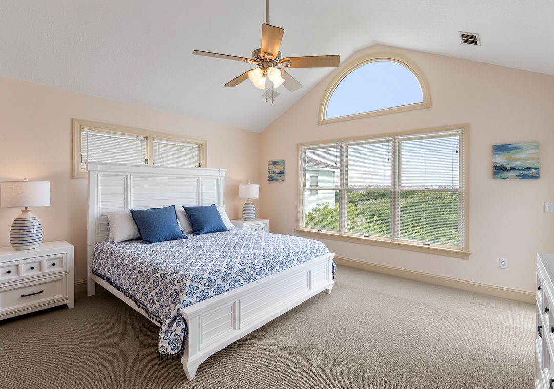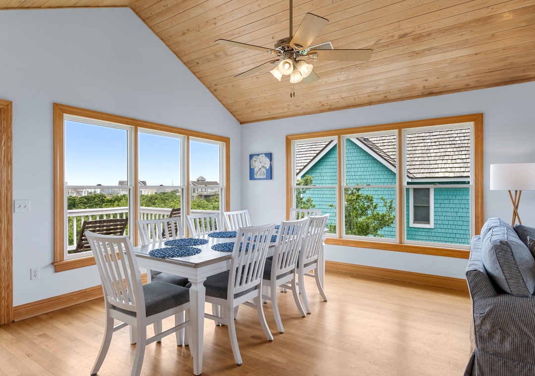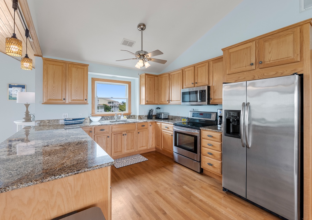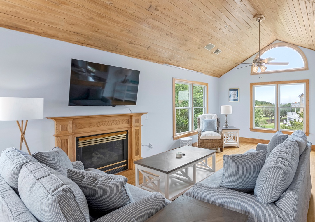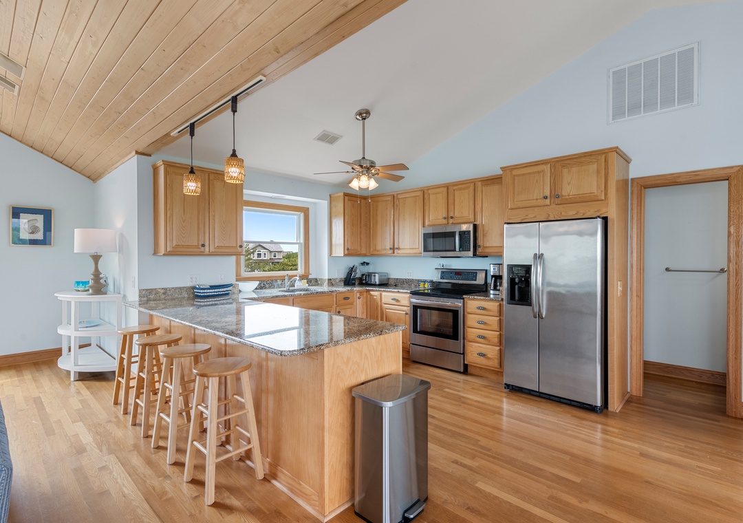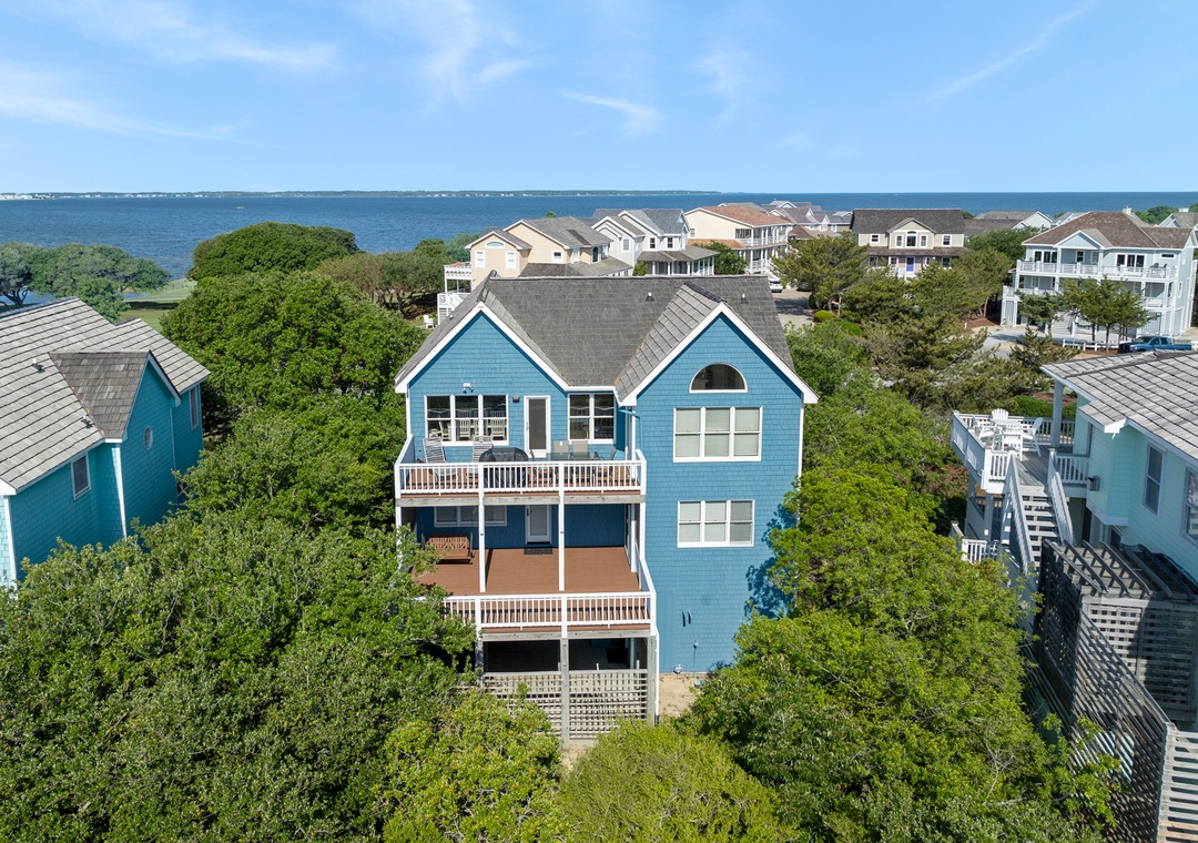 Back at the house, Leeward Shores 11 exudes southern charm with classic shakes painted in a coastal blue hue and a welcoming front porch. The traditional character continues inside with shiplap ceilings and oak hardwood flooring throughout the common areas. Come home from the beach and relax in the bright and airy great room with sound views and abundant natural light. The chef in your group will appreciate the gourmet kitchen that boasts granite countertops and stainless steel appliances. A generously sized peninsula with bar seating overlooks the main living area for fantastic flow and sight lines. The primary bedroom is also located on the top level and includes a spacious ensuite bath with dual vanities, luxurious soaking tub and separate walk-in shower. The mid-level consists of four more bedrooms for family and friends, two pairs that each share a Jack-and-Jill bath. Downstairs, you'll find a den with seating and TV that can serve as an additional living space. Two levels of east-facing decks provide golf course views along with plenty of room for outdoor living. Pets are welcome at Leeward Shores 11, so your fur babies can accompany you during your next OBX vacation.