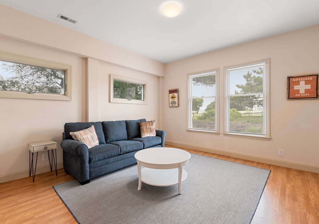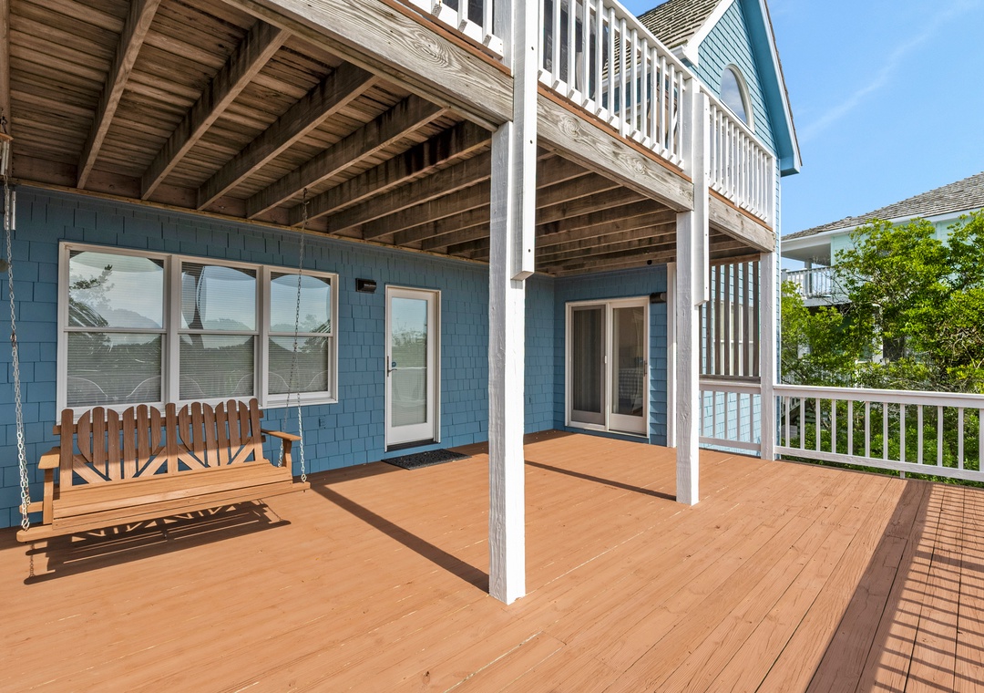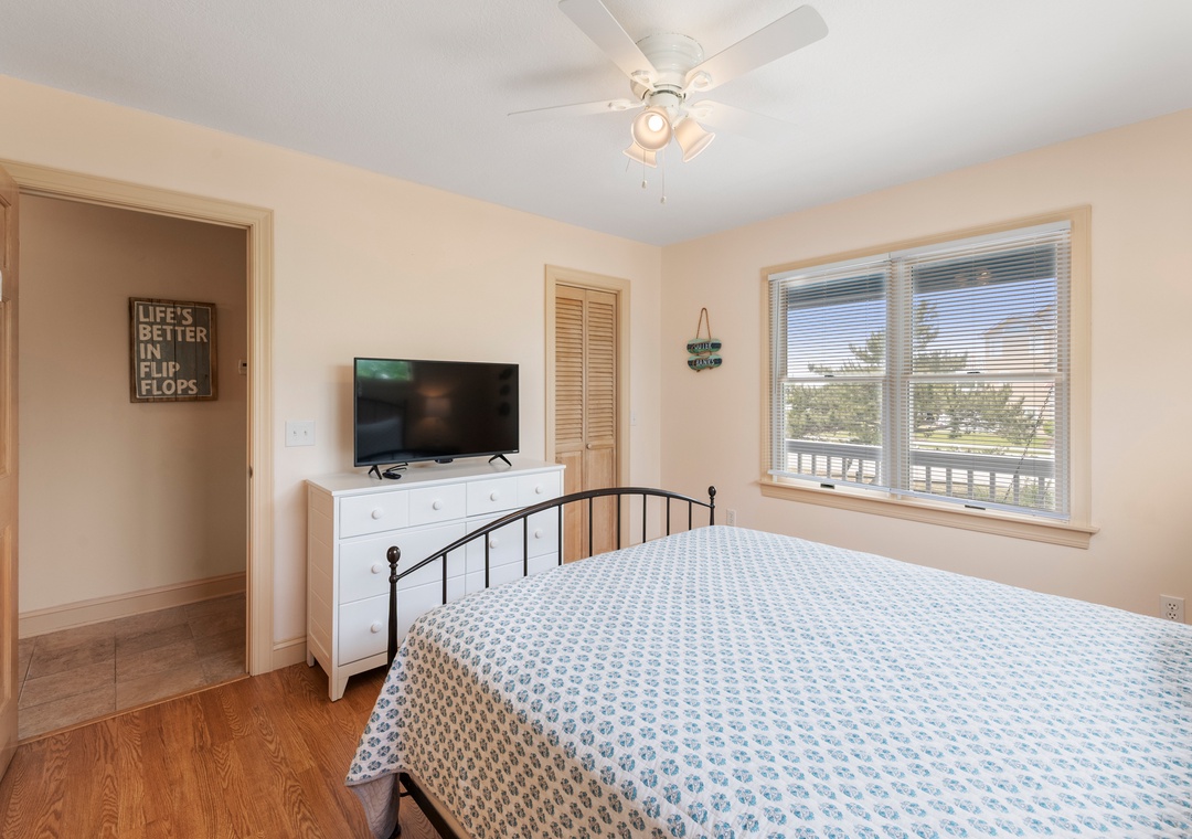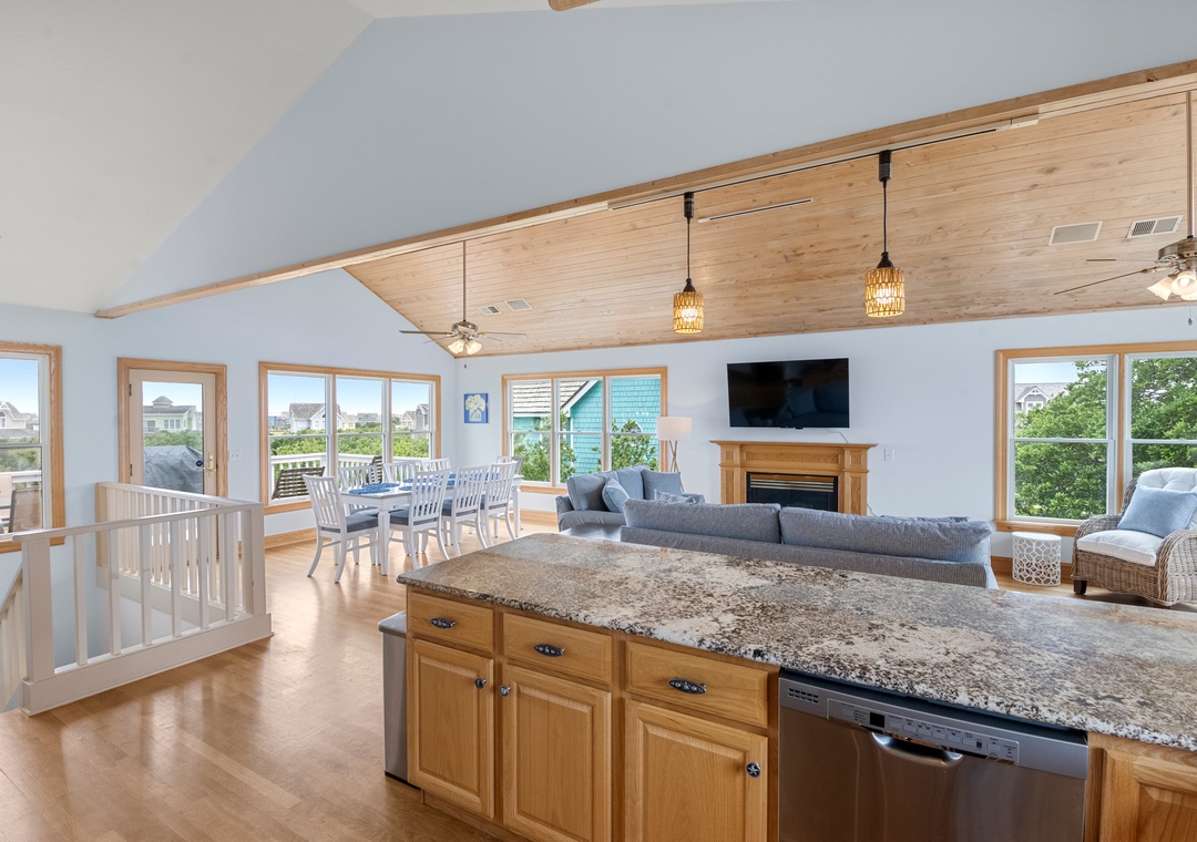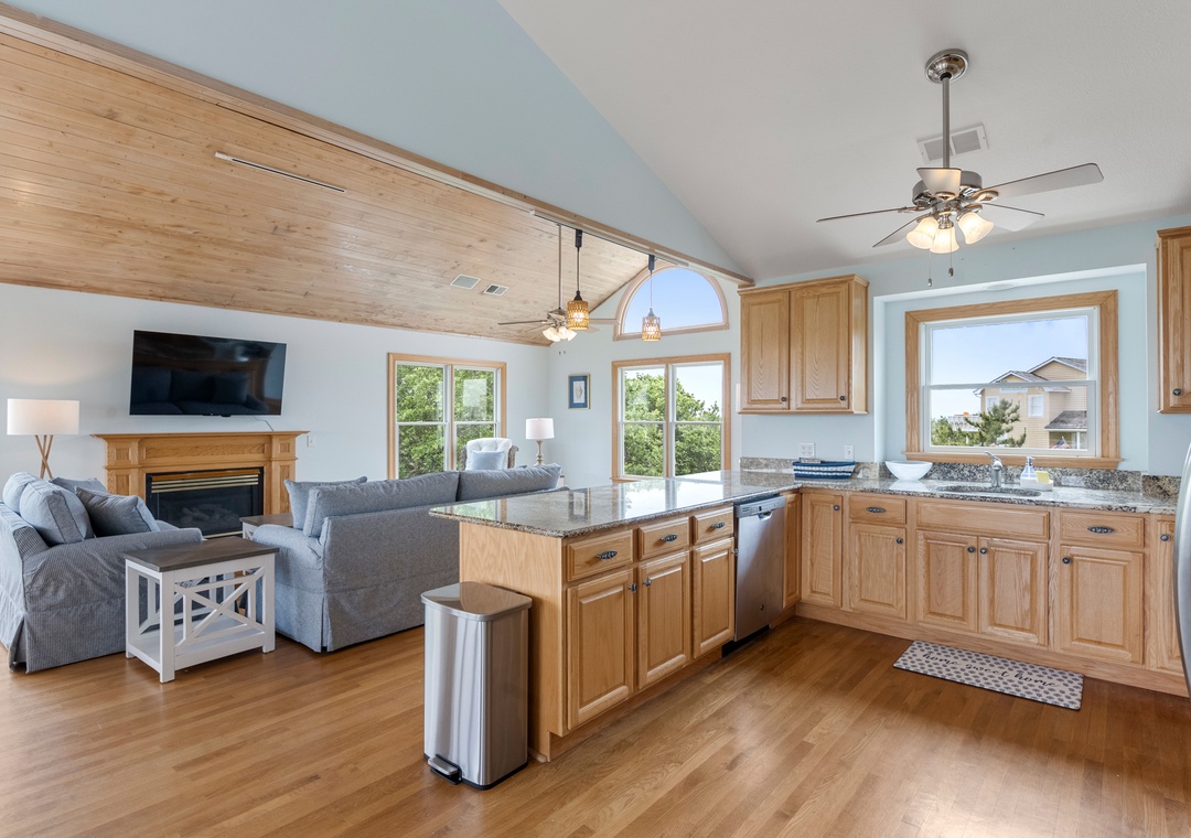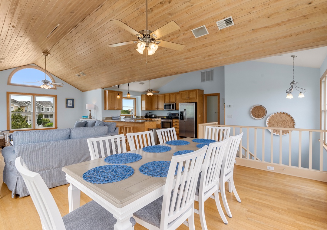 Back at the house, Leeward Shores 11 exudes southern charm with classic shakes painted in a coastal blue hue and a welcoming front porch. The traditional character continues inside with shiplap ceilings and oak hardwood flooring throughout the common areas. Come home from the beach and relax in the bright and airy great room with sound views and abundant natural light. The chef in your group will appreciate the gourmet kitchen that boasts granite countertops and stainless steel appliances. A generously sized peninsula with bar seating overlooks the main living area for fantastic flow and sight lines. The primary bedroom is also located on the top level and includes a spacious ensuite bath with dual vanities, luxurious soaking tub and separate walk-in shower. The mid-level consists of four more bedrooms for family and friends, two pairs that each share a Jack-and-Jill bath. Downstairs, you'll find a den with seating and TV that can serve as an additional living space. Two levels of east-facing decks provide golf course views along with plenty of room for outdoor living. Pets are welcome at Leeward Shores 11, so your fur babies can accompany you during your next OBX vacation.