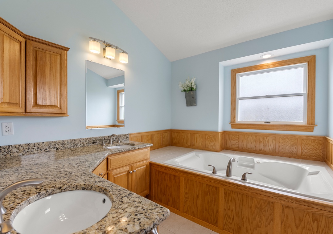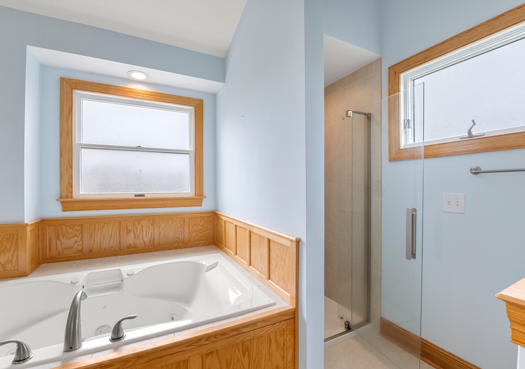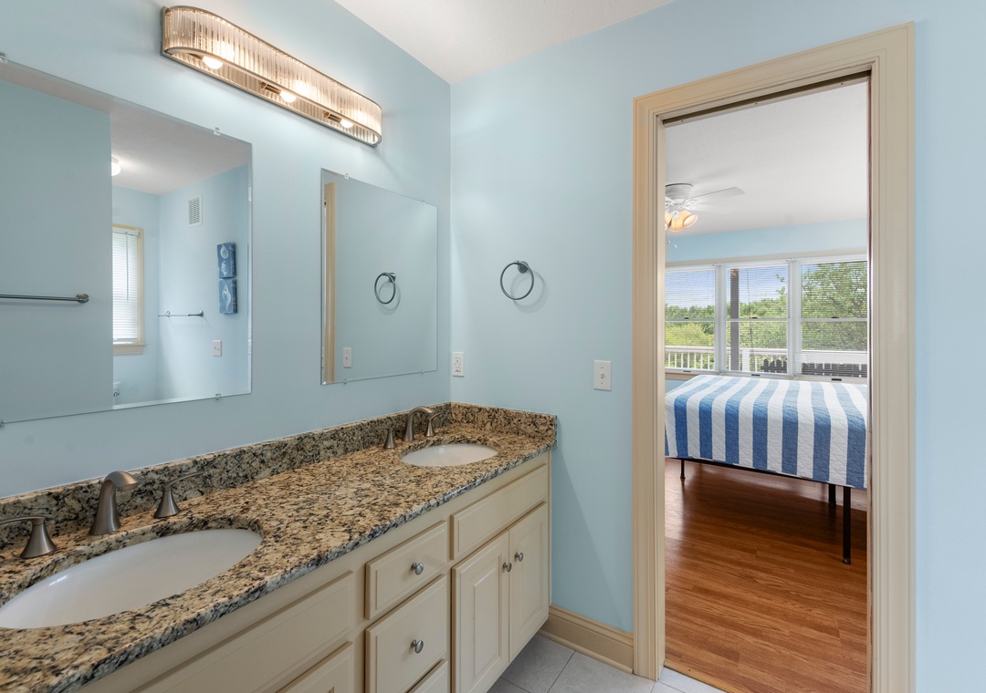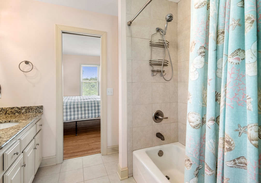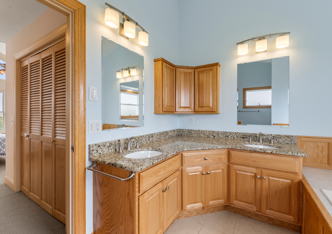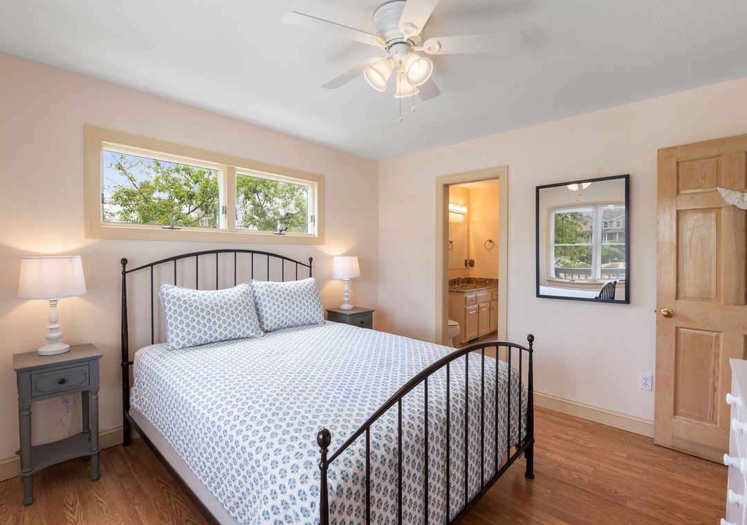 Back at the house, Leeward Shores 11 exudes southern charm with classic shakes painted in a coastal blue hue and a welcoming front porch. The traditional character continues inside with shiplap ceilings and oak hardwood flooring throughout the common areas. Come home from the beach and relax in the bright and airy great room with sound views and abundant natural light. The chef in your group will appreciate the gourmet kitchen that boasts granite countertops and stainless steel appliances. A generously sized peninsula with bar seating overlooks the main living area for fantastic flow and sight lines. The primary bedroom is also located on the top level and includes a spacious ensuite bath with dual vanities, luxurious soaking tub and separate walk-in shower. The mid-level consists of four more bedrooms for family and friends, two pairs that each share a Jack-and-Jill bath. Downstairs, you'll find a den with seating and TV that can serve as an additional living space. Two levels of east-facing decks provide golf course views along with plenty of room for outdoor living. Pets are welcome at Leeward Shores 11, so your fur babies can accompany you during your next OBX vacation.