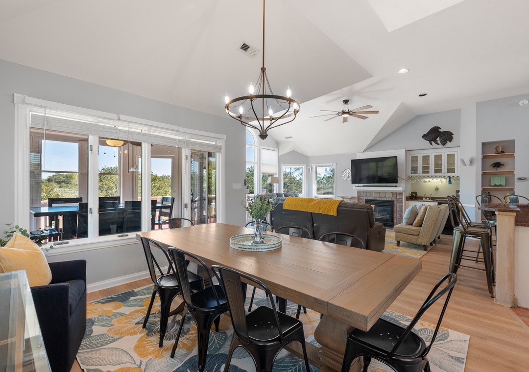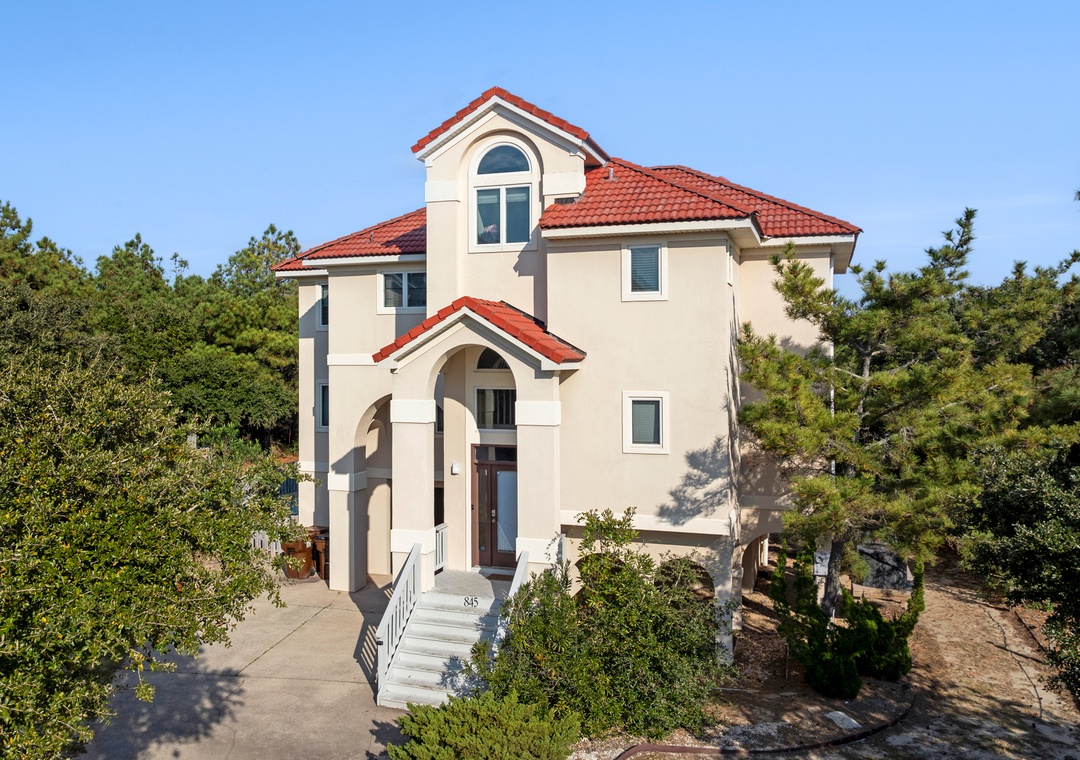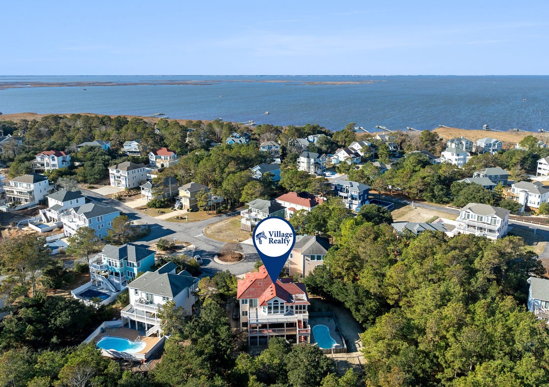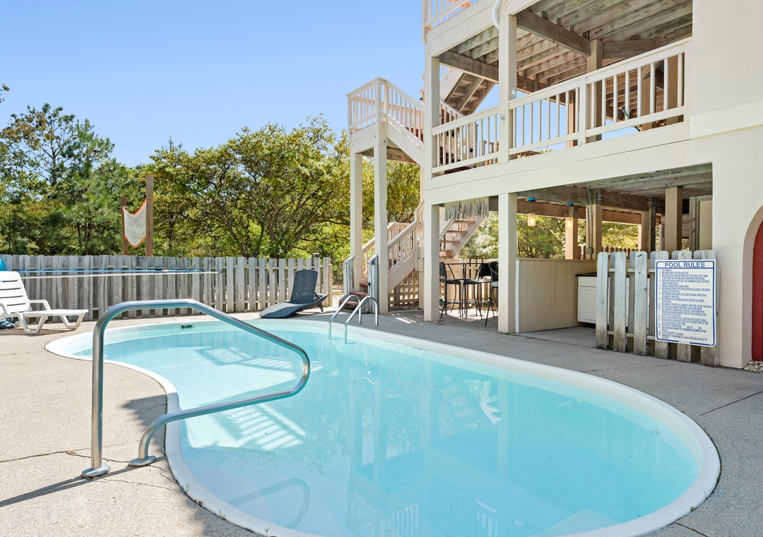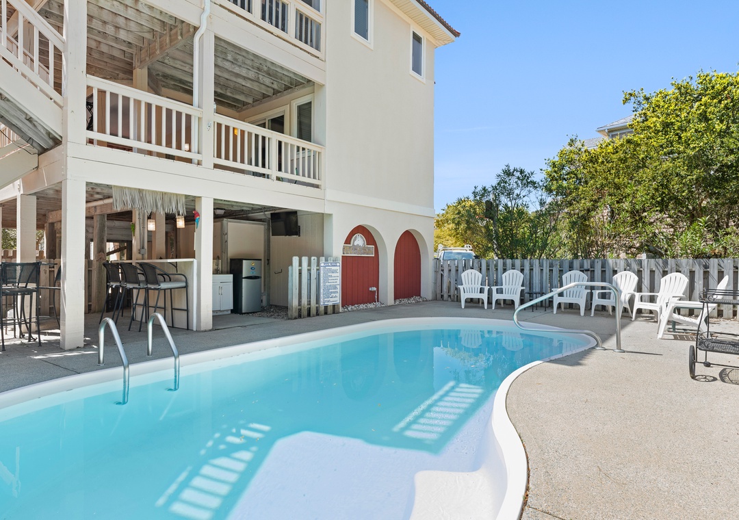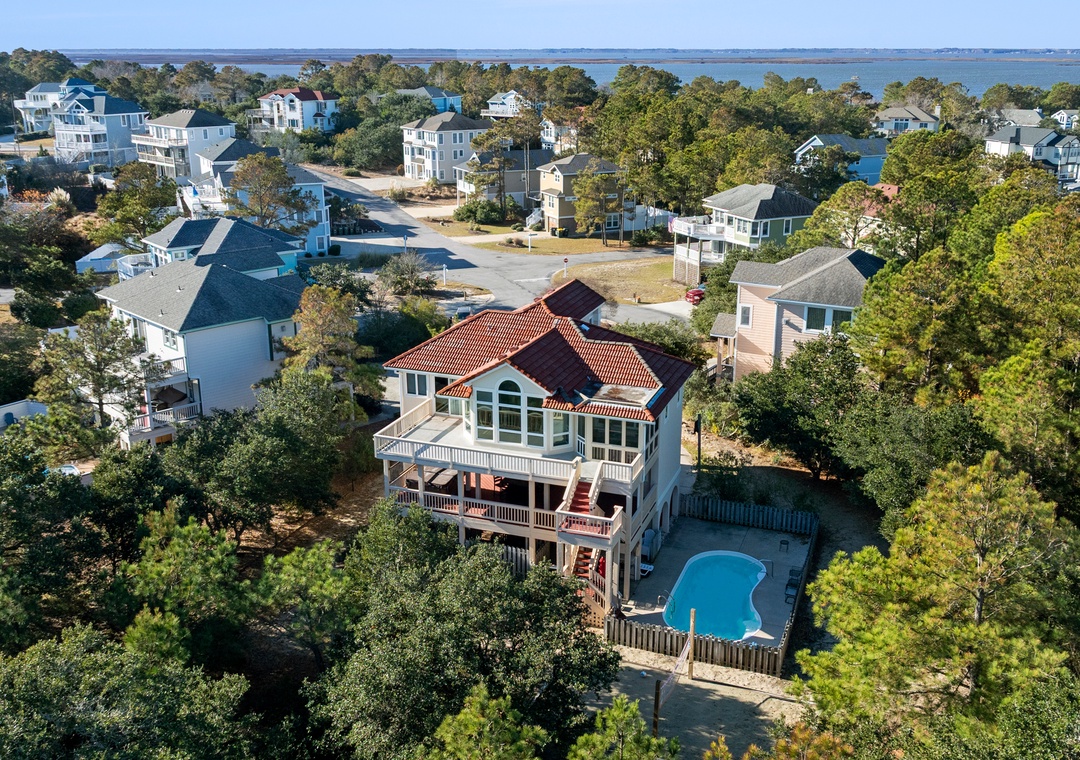New for 2025: LVP flooring throughout the property. All three full baths have been renovated. New dining table and chairs. New patio furniture on the top deck and outdoor couches. New TV with 180-degree lift on the middle deck. Invite your family and friends to join you on the beach vacation of a lifetime at Sea Pride, a gorgeous soundside home in the popular Monteray Shores community of Corolla. After a day at the beach or exploring town, the outdoor fun can continue back at the house with your very own volleyball court and private saltwater pool. The pool area includes a fabulous tiki bar with mini fridge, where happy hour can start anytime of the day! Upstairs, a spacious open-concept great room is beautifully furnished and features vaulted ceilings, hardwood floors and a convenient wet bar. It leads out to a screened porch for alfresco dining and an expansive sun deck that overlooks the secluded backyard. Back inside, get dinner started in the well-equipped kitchen with gas cooktop, granite countertops and island with bar seating. Kids of all ages will love the arcade games in the loft area. Sea Pride is ideal for extended families or multiple groups vacationing together. Two generously sized primary suites each include a king bed and private bath. All five bedrooms offer exterior access for effortless indoor/outdoor flow.