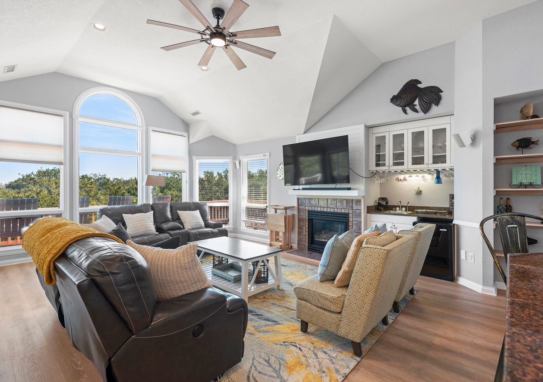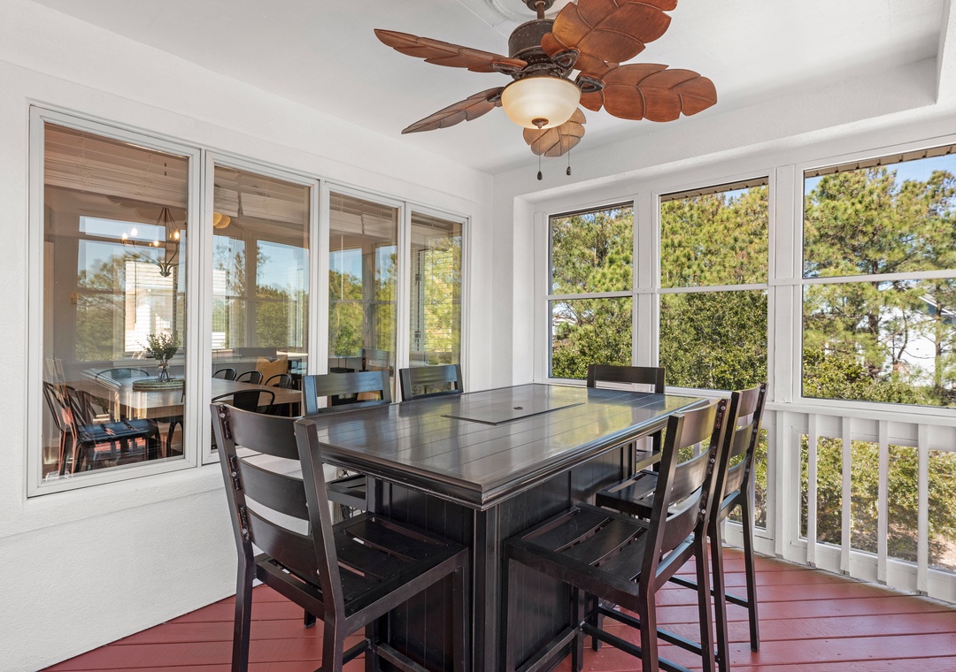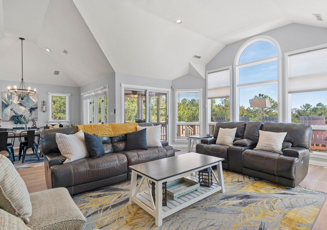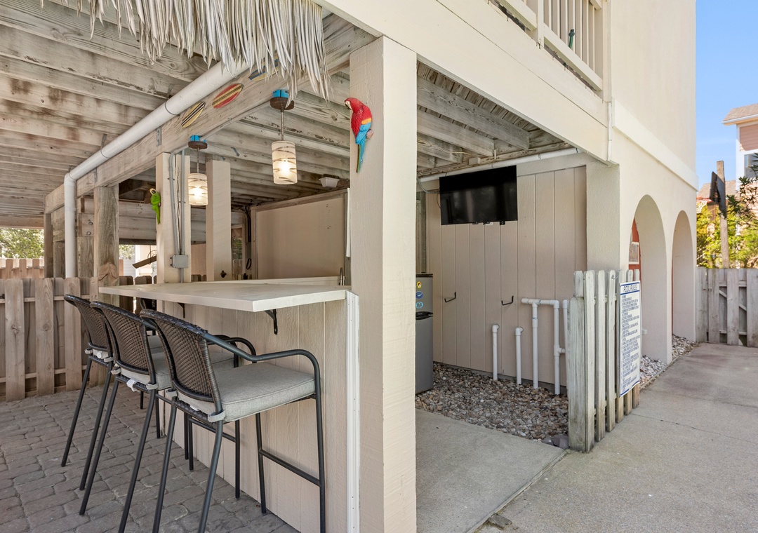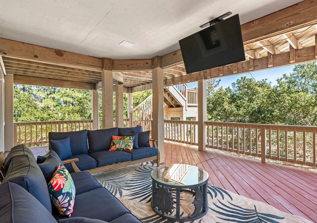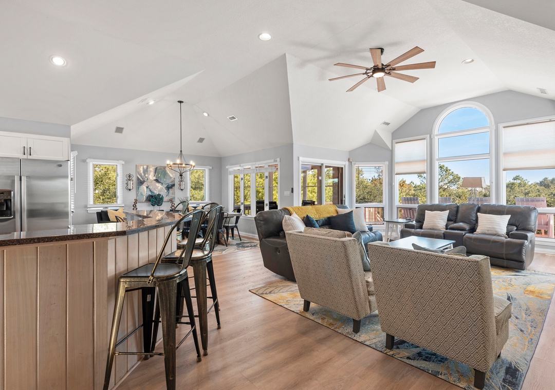 New for 2025: LVP flooring throughout the property. All three full baths have been renovated. New dining table and chairs. New patio furniture on the top deck and outdoor couches. New TV with 180-degree lift on the middle deck. Invite your family and friends to join you on the beach vacation of a lifetime at Sea Pride, a gorgeous soundside home in the popular Monteray Shores community of Corolla. After a day at the beach or exploring town, the outdoor fun can continue back at the house with your very own volleyball court and private saltwater pool. The pool area includes a fabulous tiki bar with mini fridge, where happy hour can start anytime of the day! Upstairs, a spacious open-concept great room is beautifully furnished and features vaulted ceilings, hardwood floors and a convenient wet bar. It leads out to a screened porch for alfresco dining and an expansive sun deck that overlooks the secluded backyard. Back inside, get dinner started in the well-equipped kitchen with gas cooktop, granite countertops and island with bar seating. Kids of all ages will love the arcade games in the loft area. Sea Pride is ideal for extended families or multiple groups vacationing together. Two generously sized primary suites each include a king bed and private bath. All five bedrooms offer exterior access for effortless indoor/outdoor flow.