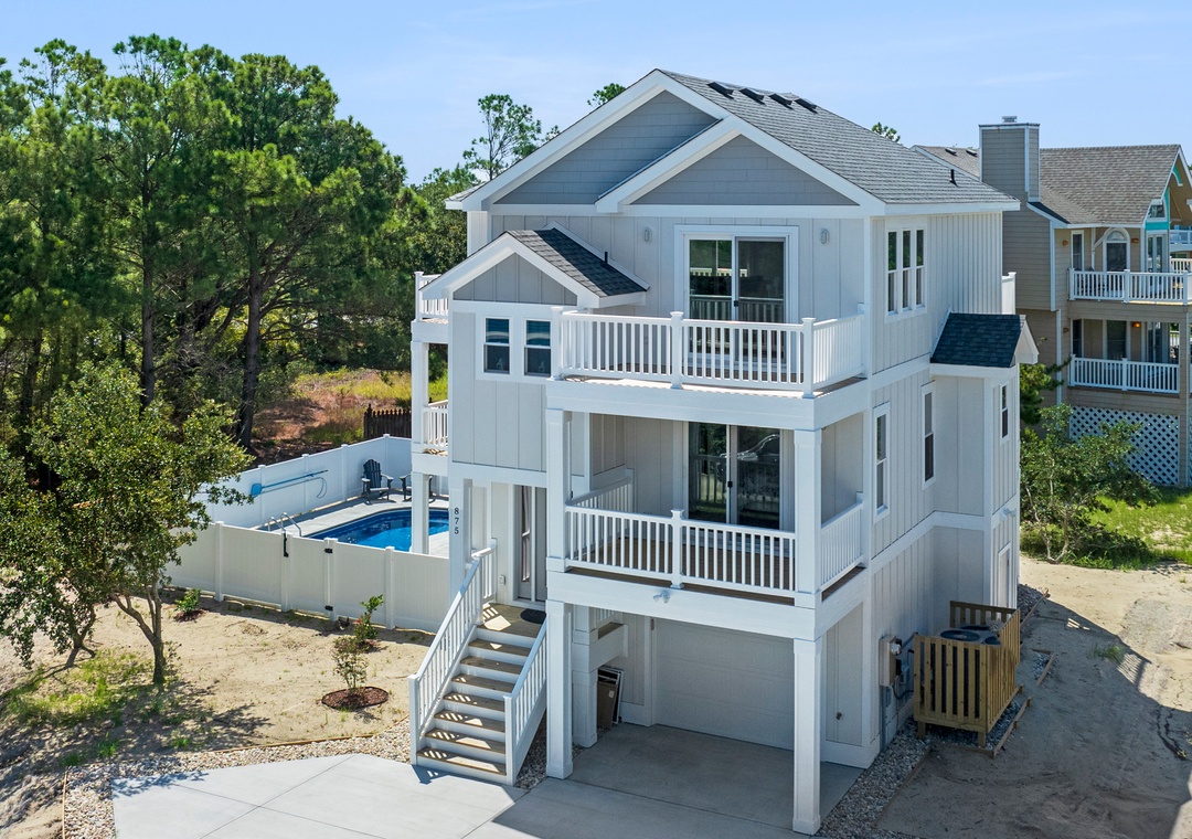 Planning the perfect Outer Banks getaway starts with Martinis and Bikinis! This newly built home with private pool is located in the sought-after Monteray Shores community of Corolla. After a day at the beach or exploring town, come home to the open-concept great room where you can kick back and relax in front of the cozy electric fireplace. This comfortably furnished gathering space opens up to a sun deck for effortless indoor/outdoor flow. When you're not trying one of Corolla's fabulous restaurants, embrace your inner chef in the well-equipped kitchen with quartz countertops, stainless steel appliances and a large island with bar seating. At the end of the night, retreat to the primary king bedroom with luxurious ensuite bath with dual vanities, custom tiled shower and private deck access. The mid-level also consists of two additional bedrooms, both of which feature deck access and share a full hall bath. Downstairs, you'll find the fourth bedroom with semi-private bath and a den that can serve as an additional hangout space. It's equipped with a wet bar for convenient drinks and snacks, leads out to the private pool area where you can take a refreshing dip or lounge in the sun. Dogs are welcome at Martinis and Bikinis, so your fur babies can accompany you on the beach vacation of a lifetime.