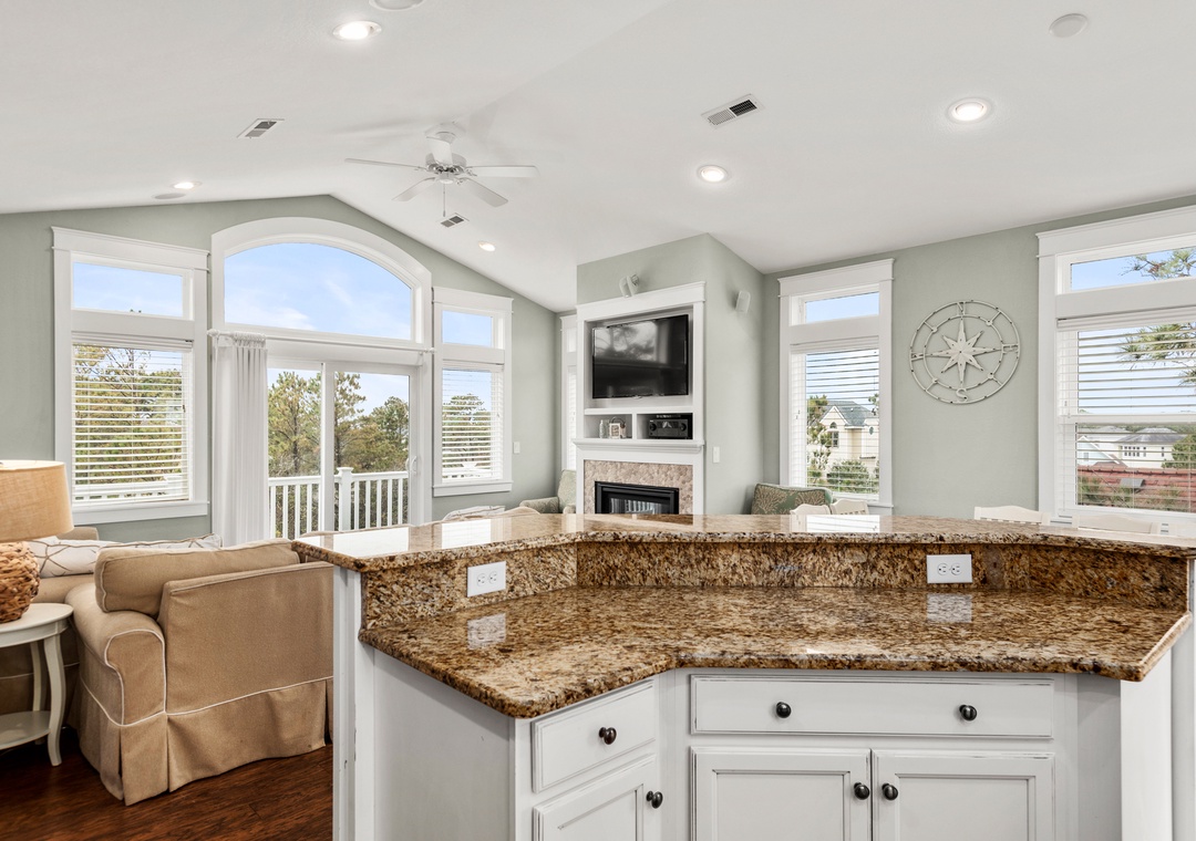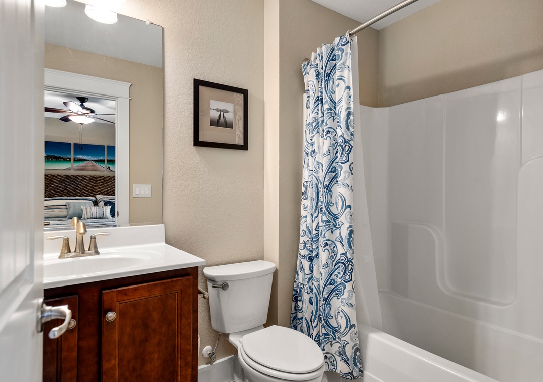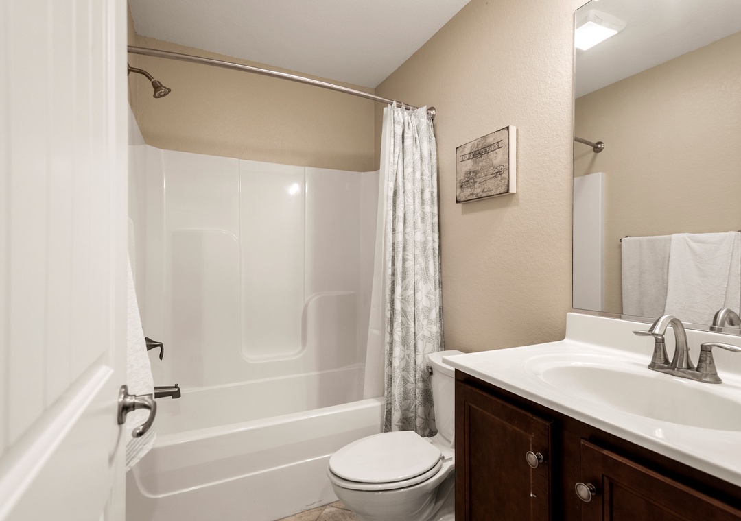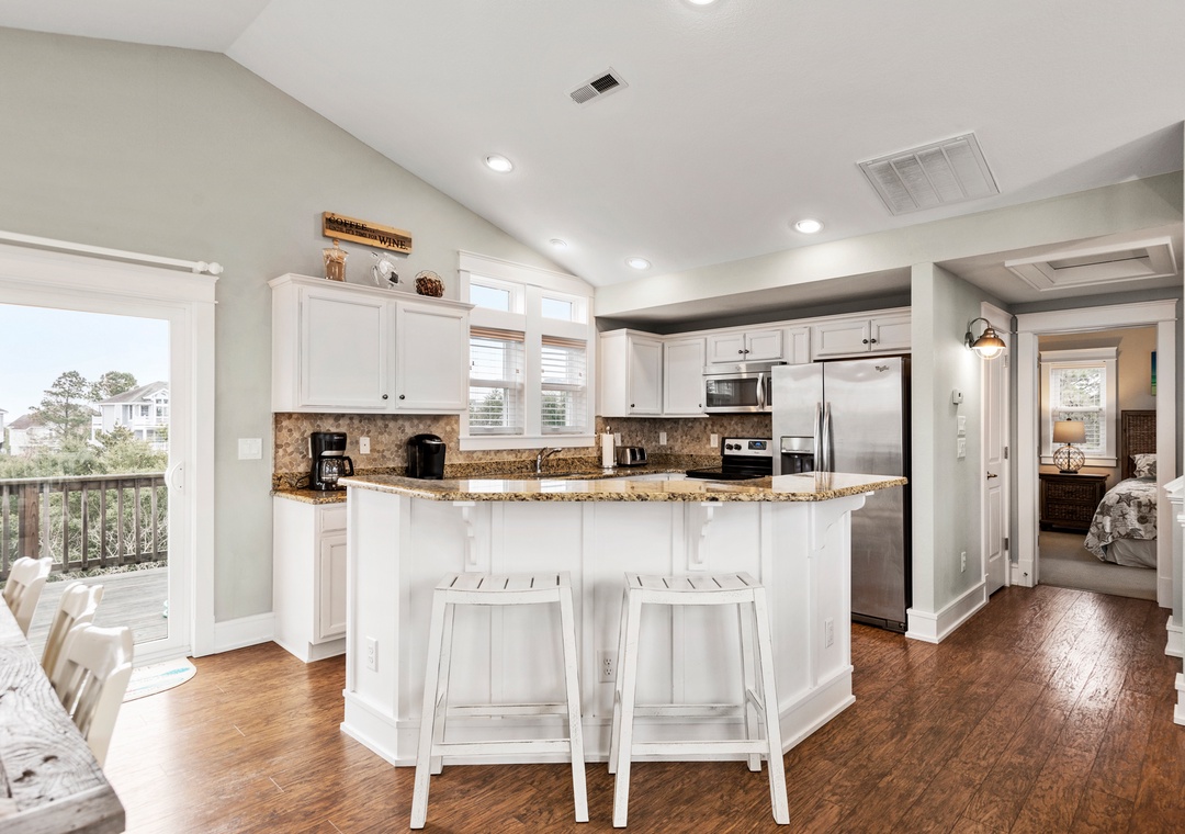 Anchor Bar is where you can find the ultimate in tranquility and vacation serenity. The top-level great room with cathedral ceilings offers comfortable furnishings and sets a tone of relaxation which immediately makes you feel at home. Prepare meals in the upscale kitchen with stainless steel appliances, granite countertops and an eat-in bar. The loft can double as an office space, equipped with a desk for keeping up with work or school remotely. Downstairs, the game room features a shuffleboard table for hours of indoor fun. Take advantage of the wet bar for convenient drinks and snacks without having to go upstairs. Just outside you'll find all the outdoor amenities your family will need for spending quality time together. Let the kids splash in the pool while you take a relaxing soak in the hot tub. There's even a Tiki bar, making this backyard paradise feel like your own private resort. The pool can be heated certain times of the year, ideal for off-season getaways.