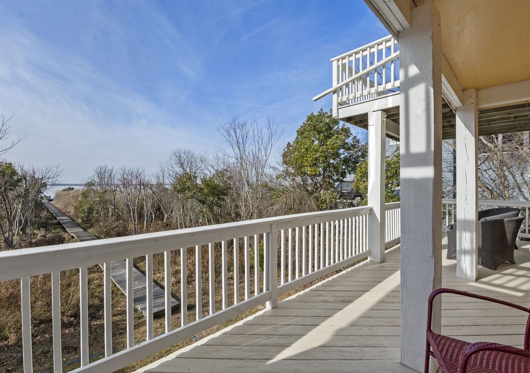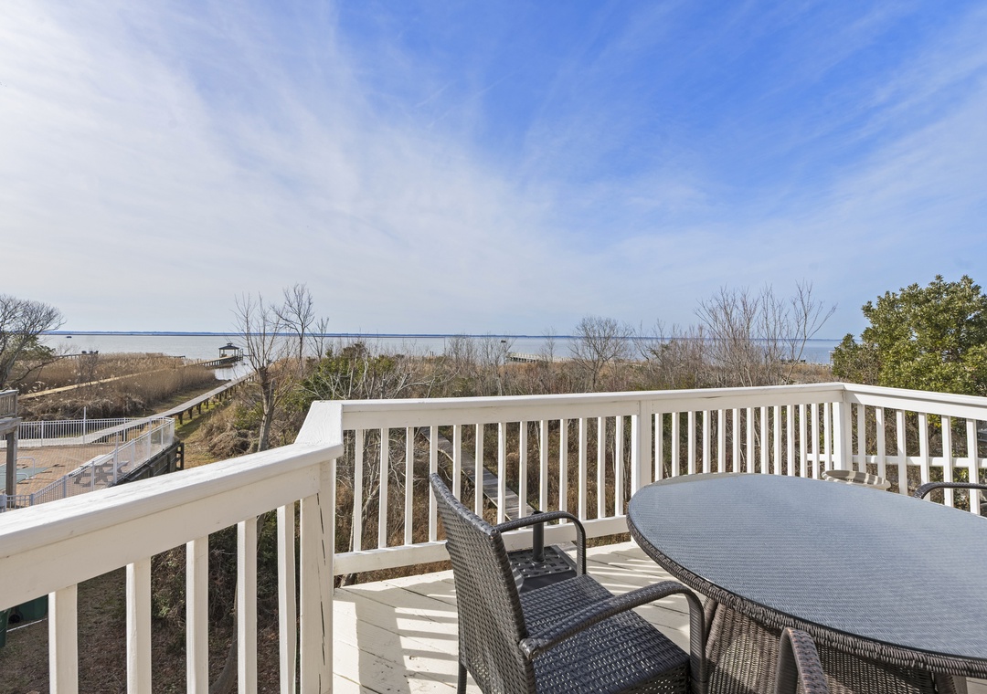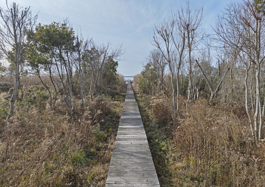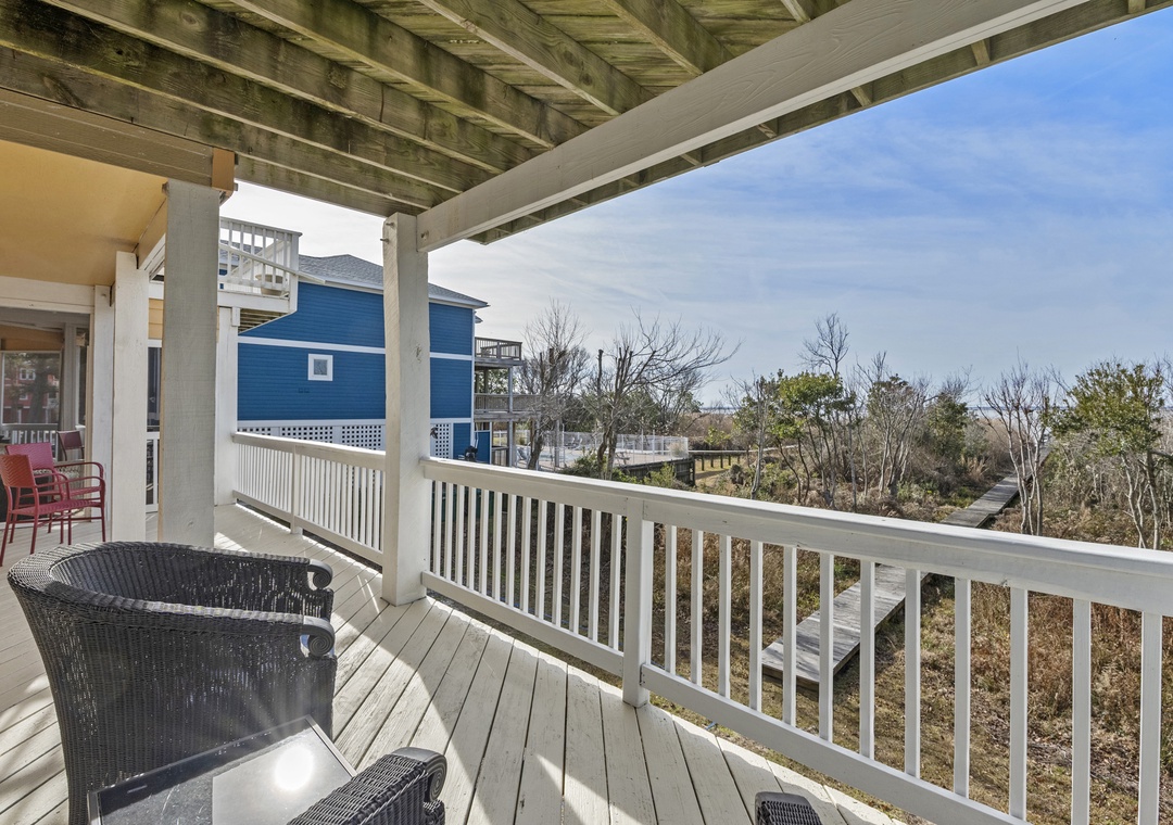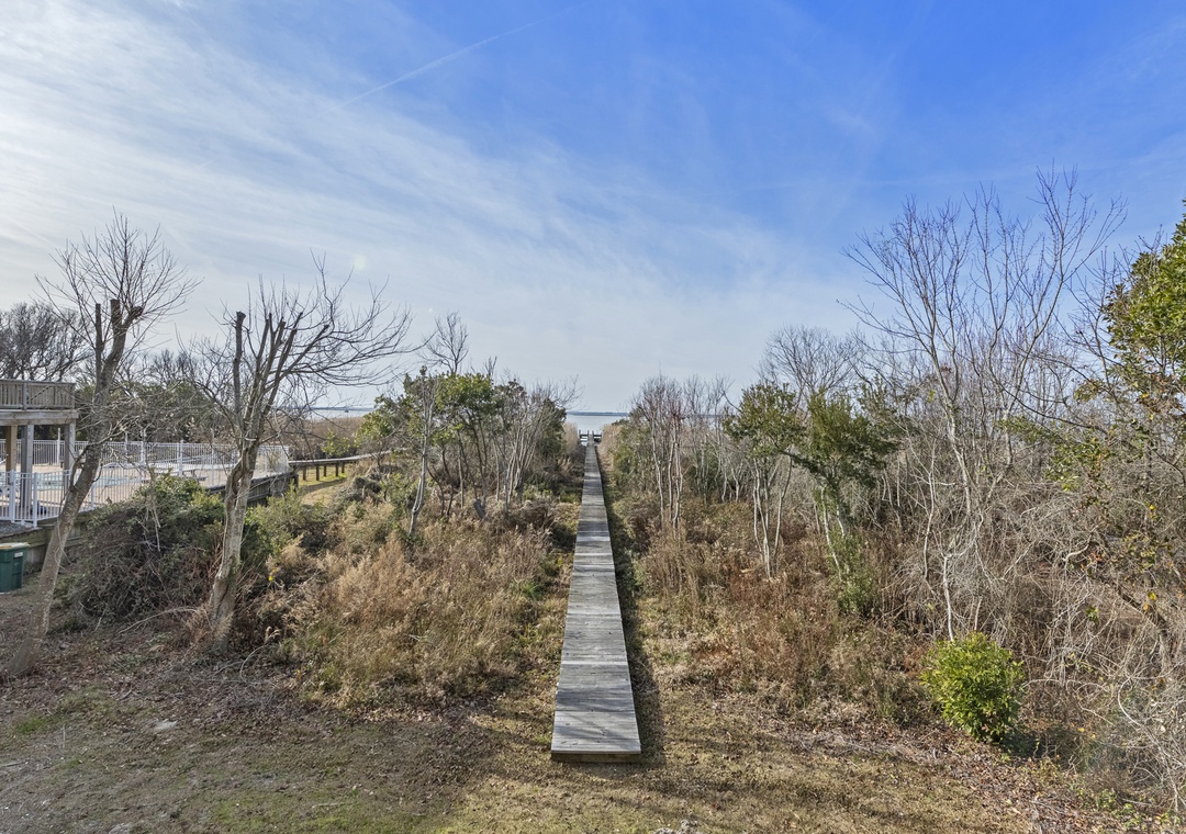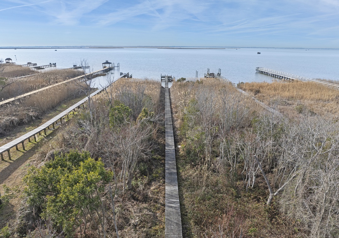 On the ground level, you’ll find a second full-size refrigerator for extra storage, perfect for beverages and groceries. This level includes an ensuite pyramid bunk room with a sleep sofa (queen). Step outside under the covered deck to fire up the gas grill and enjoy the outdoor shower after a day at the beach. The garage offers extra space for guest use, and there’s an exterior closet for storing beach gear. Parking accommodates 4–5 vehicles in the driveway. From here, take the private boardwalk to the sound for quiet mornings or stunning twilight views.