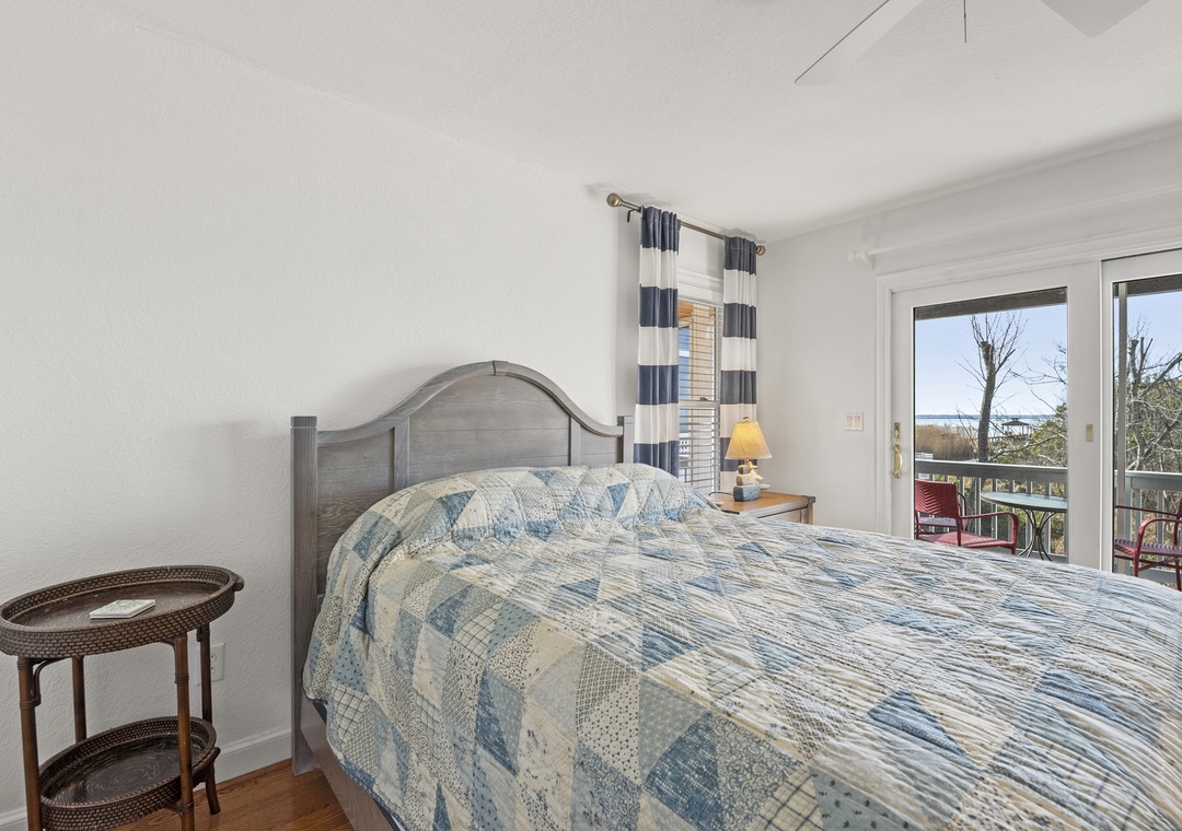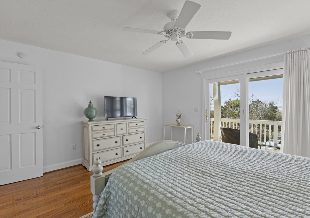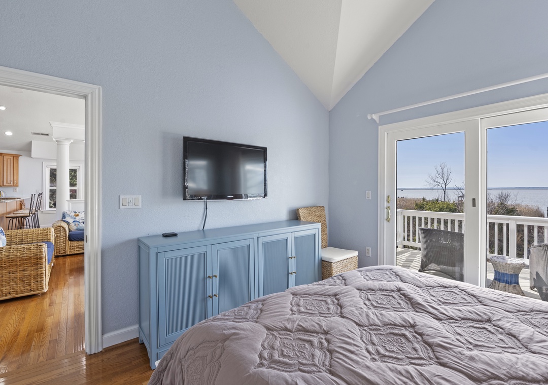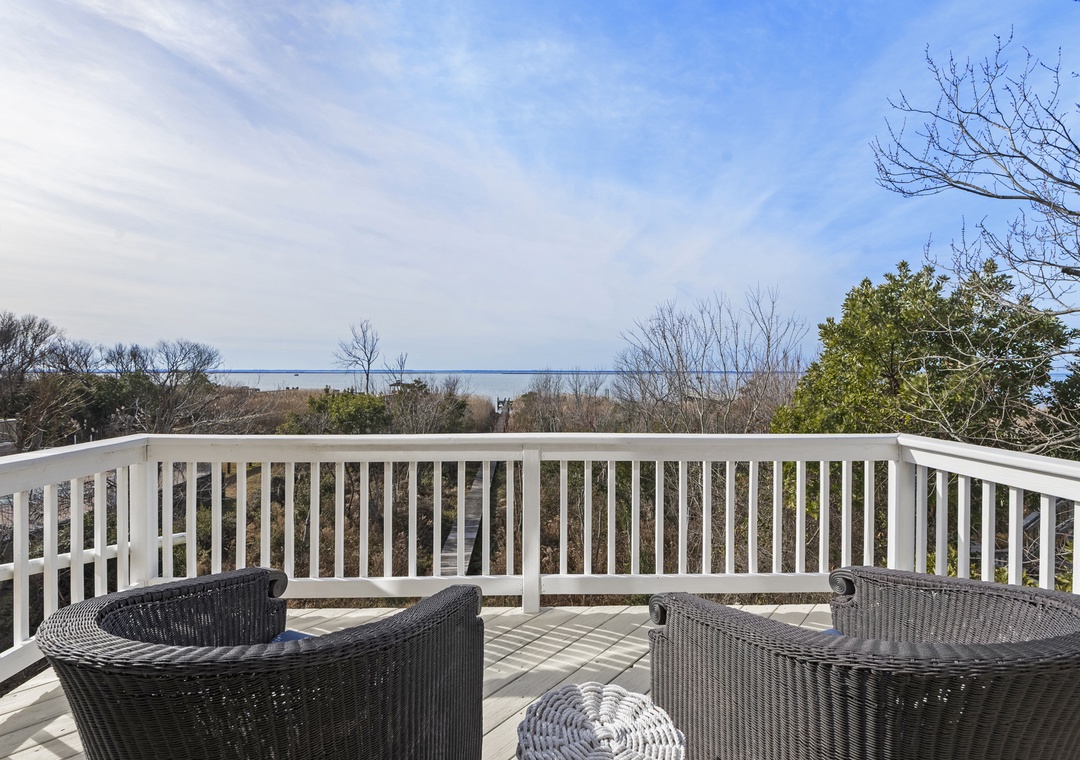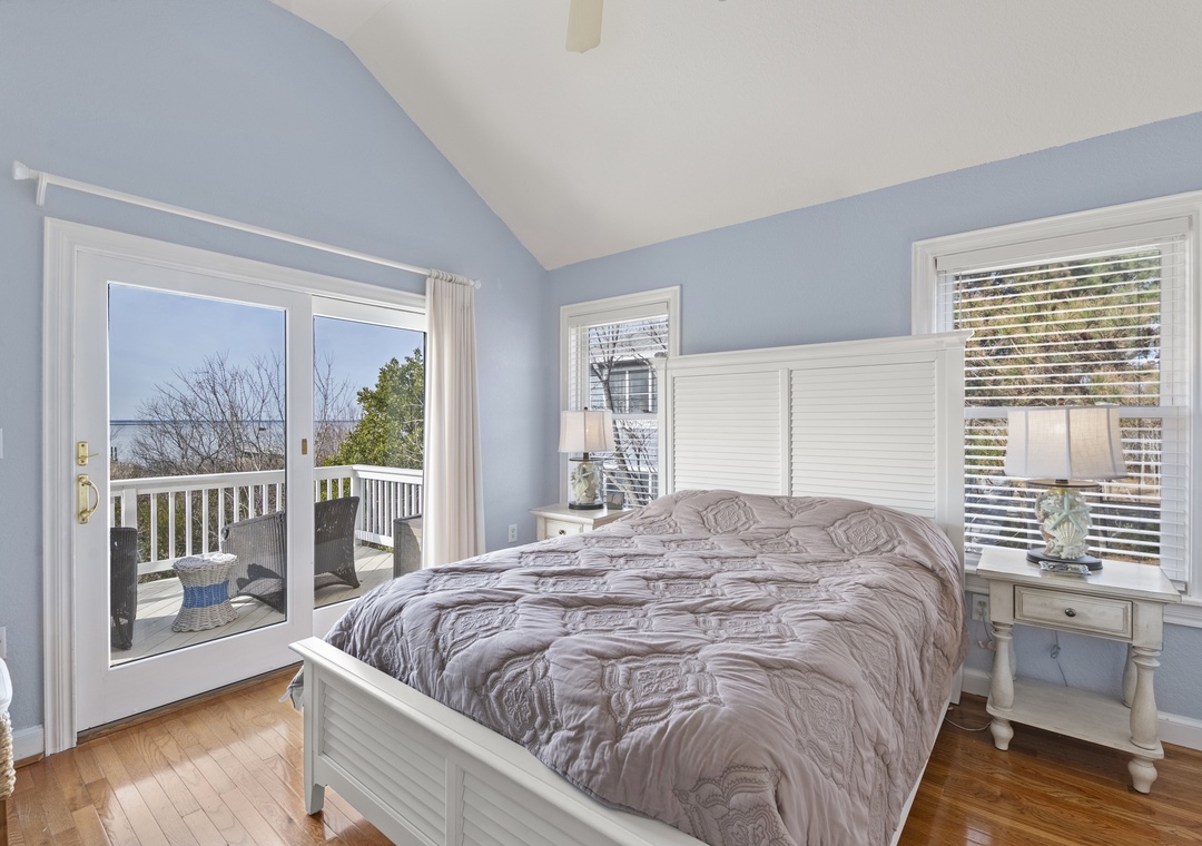 On the ground level, you’ll find a second full-size refrigerator for extra storage, perfect for beverages and groceries. This level includes an ensuite pyramid bunk room with a sleep sofa (queen). Step outside under the covered deck to fire up the gas grill and enjoy the outdoor shower after a day at the beach. The garage offers extra space for guest use, and there’s an exterior closet for storing beach gear. Parking accommodates 4–5 vehicles in the driveway. From here, take the private boardwalk to the sound for quiet mornings or stunning twilight views.