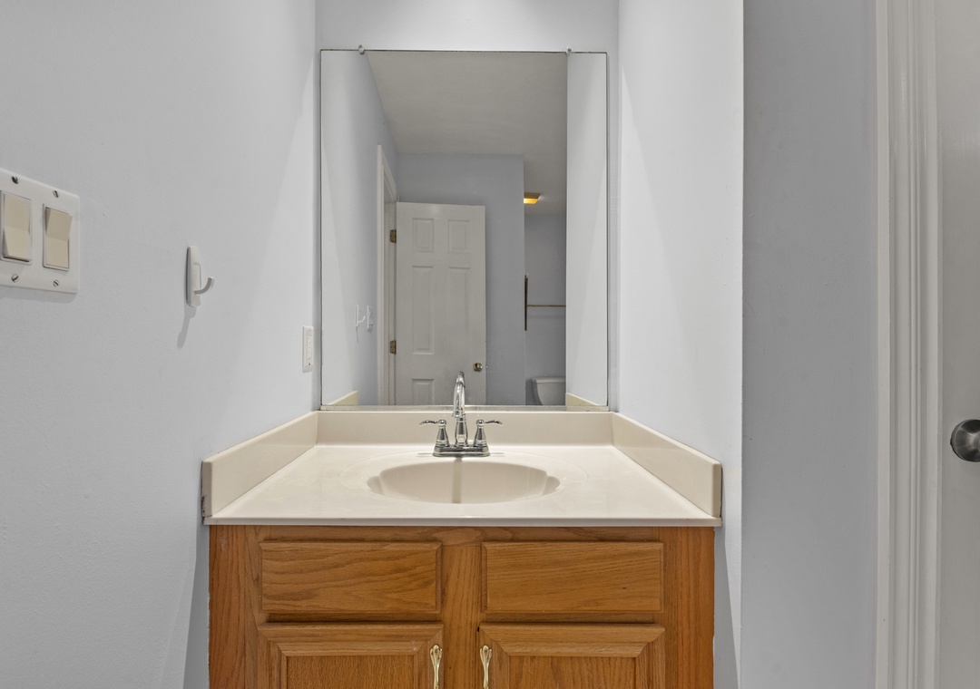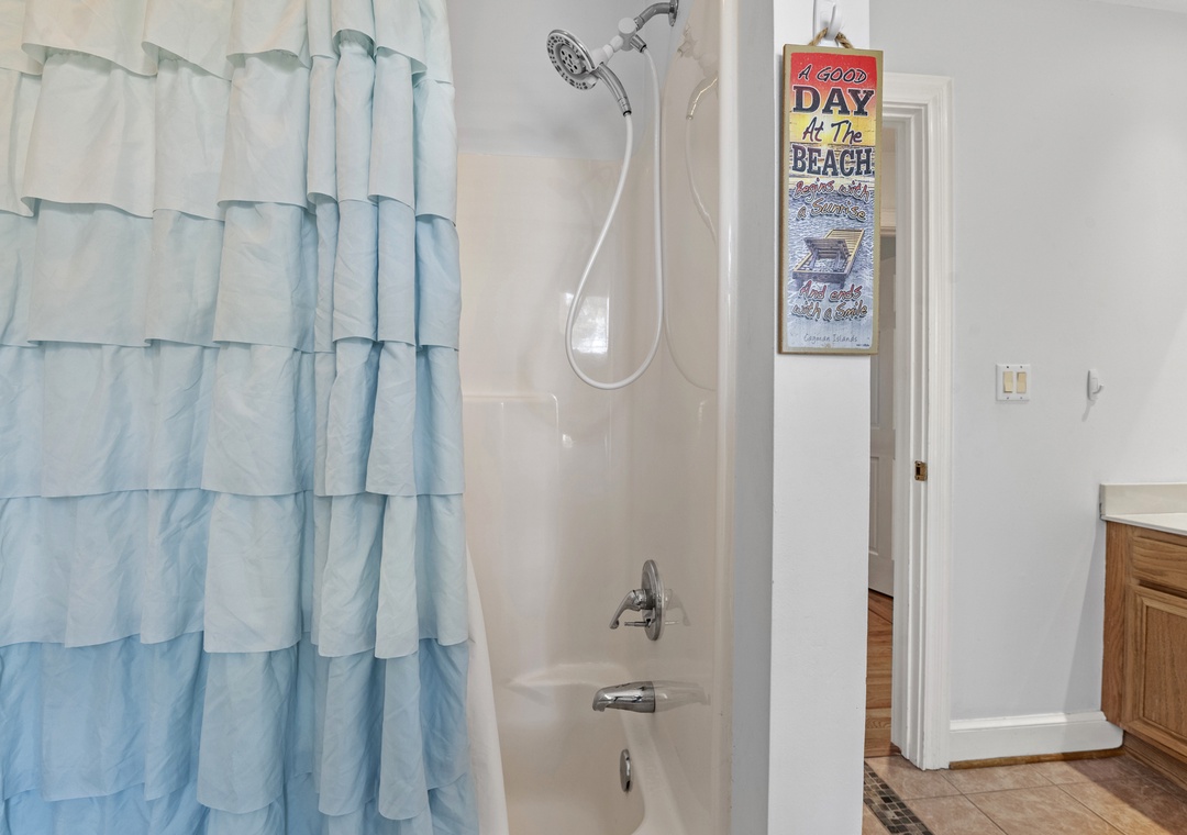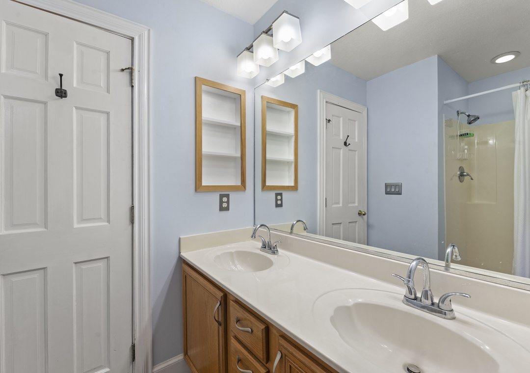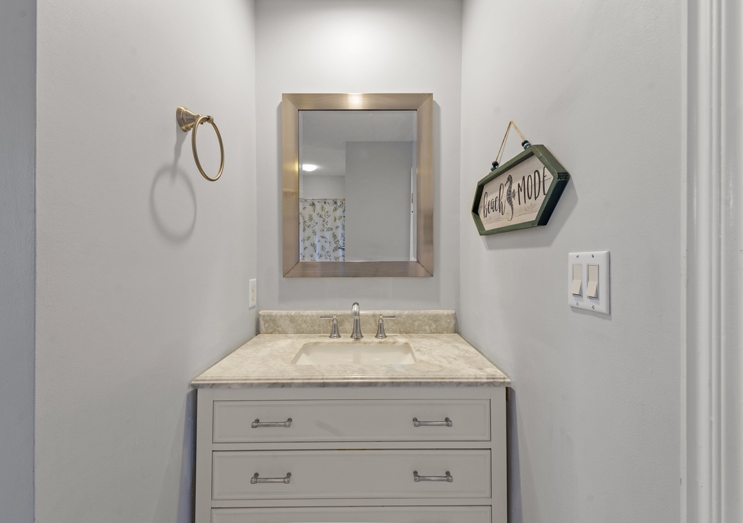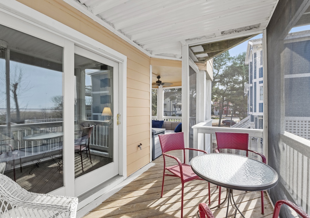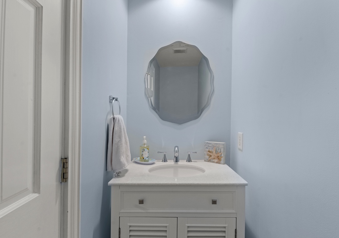 On the ground level, you’ll find a second full-size refrigerator for extra storage, perfect for beverages and groceries. This level includes an ensuite pyramid bunk room with a sleep sofa (queen). Step outside under the covered deck to fire up the gas grill and enjoy the outdoor shower after a day at the beach. The garage offers extra space for guest use, and there’s an exterior closet for storing beach gear. Parking accommodates 4–5 vehicles in the driveway. From here, take the private boardwalk to the sound for quiet mornings or stunning twilight views.