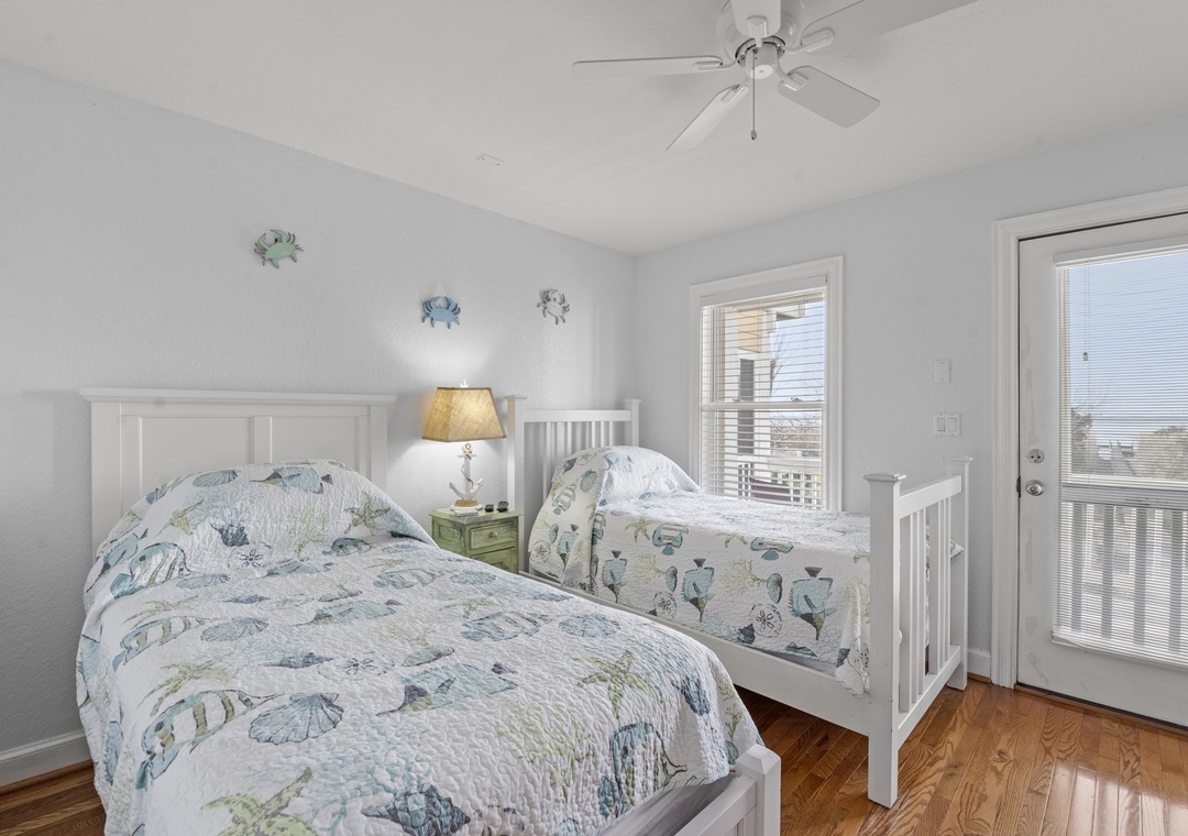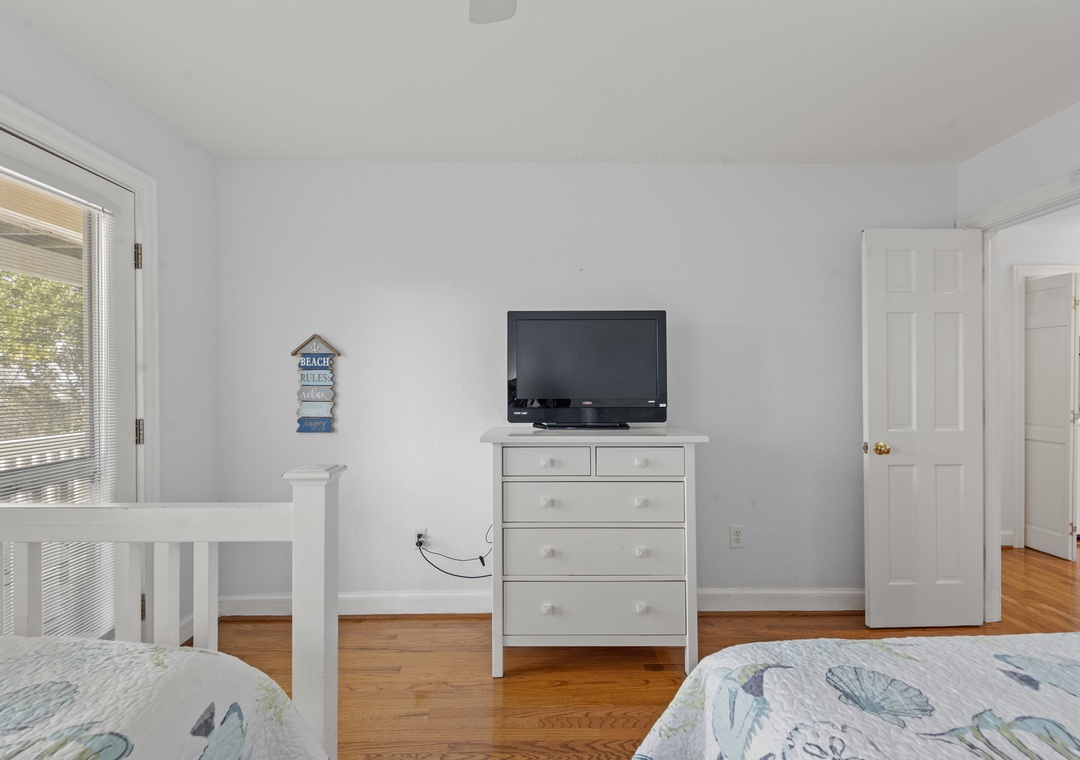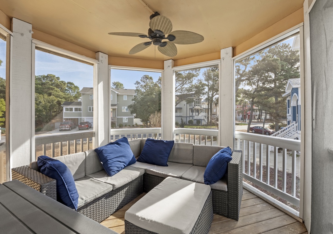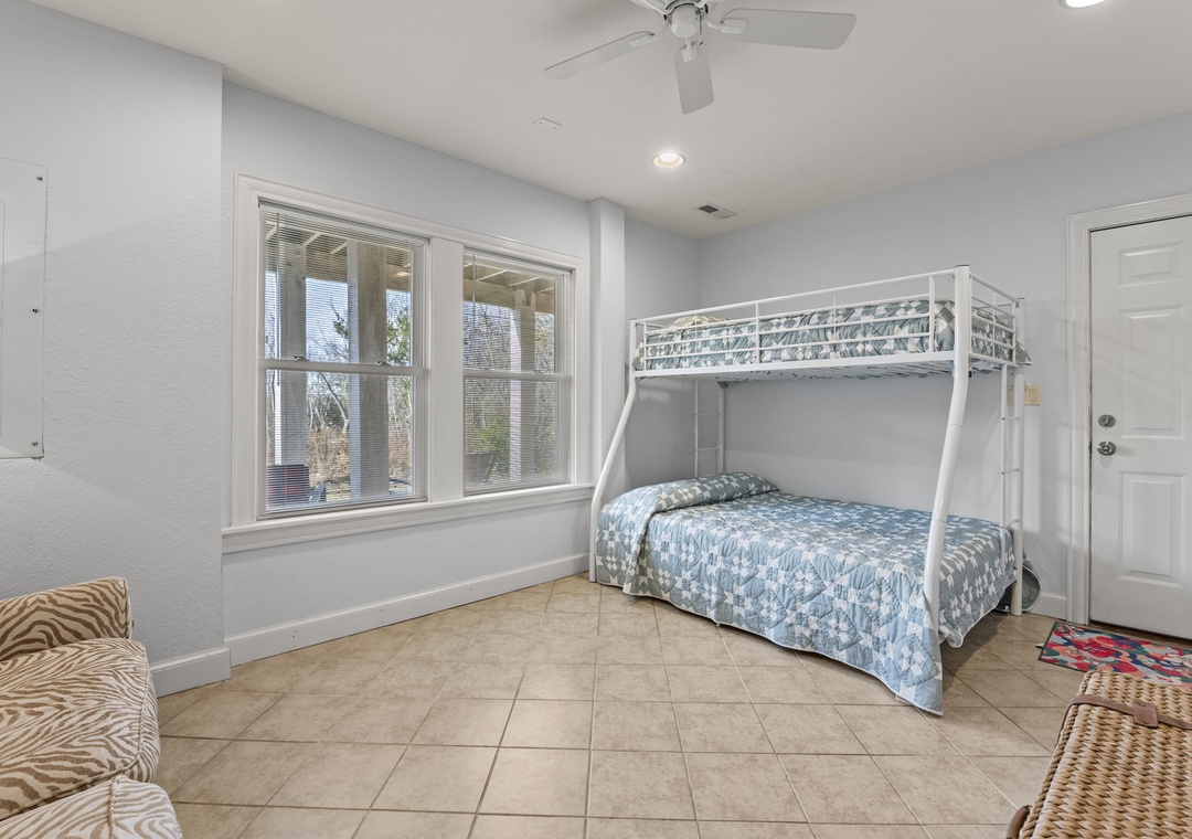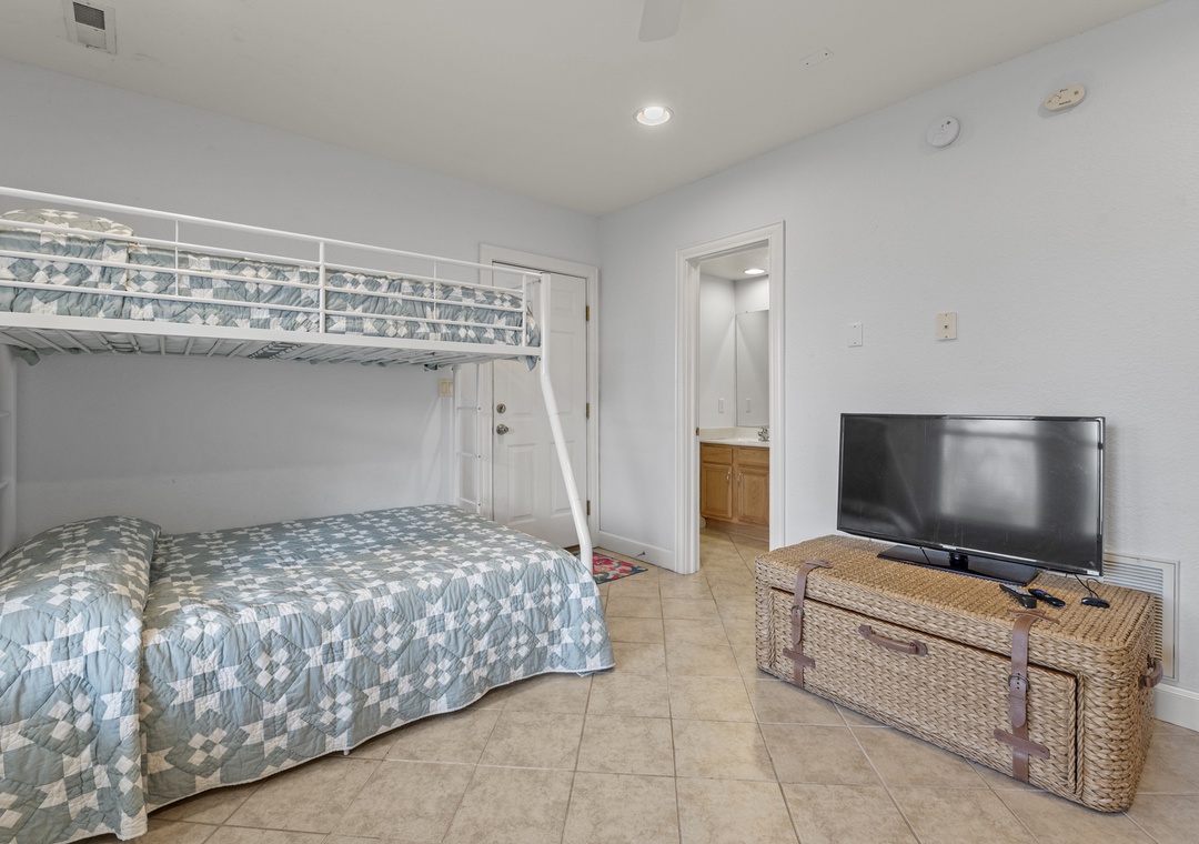 The middle level features three inviting bedrooms. One queen bedroom, one bedroom with two twins and the third is a queen ensuite with its own bath and shower. Enjoy the screened porch on this level, complete with an outdoor table and a cozy couch for lounging on the south side of the house. The laundry area is also conveniently located here.