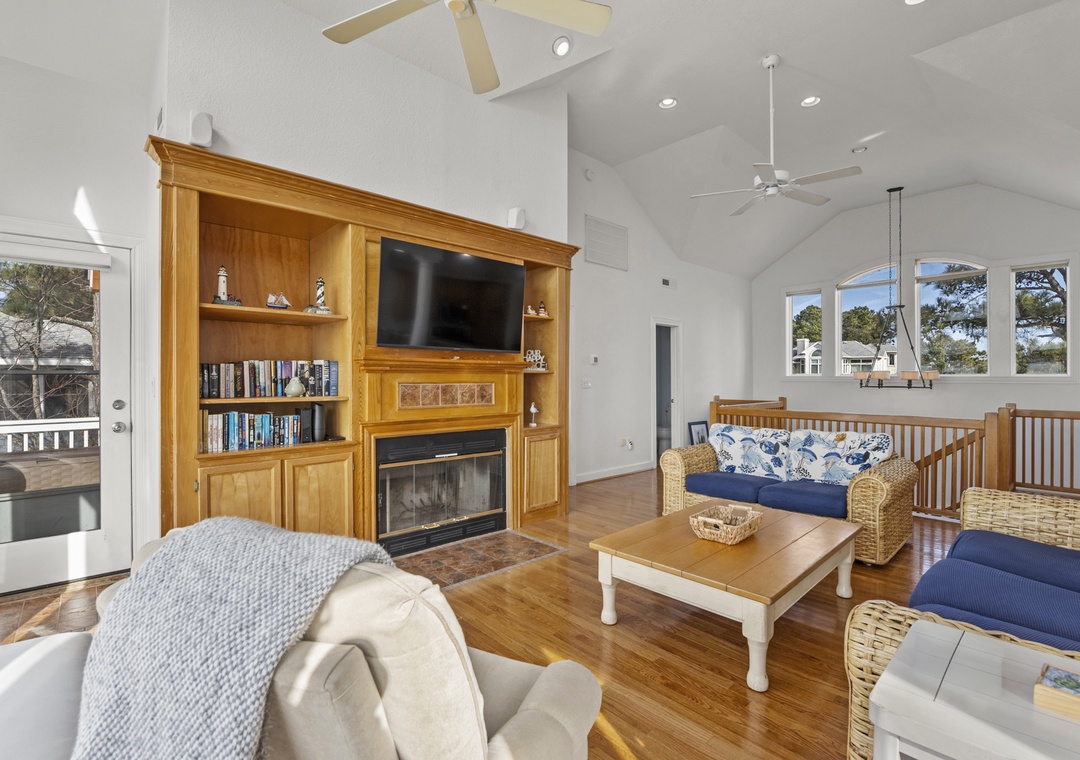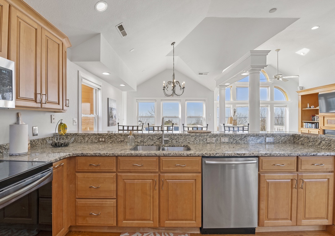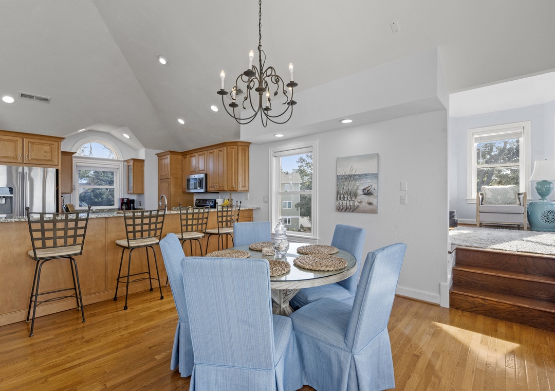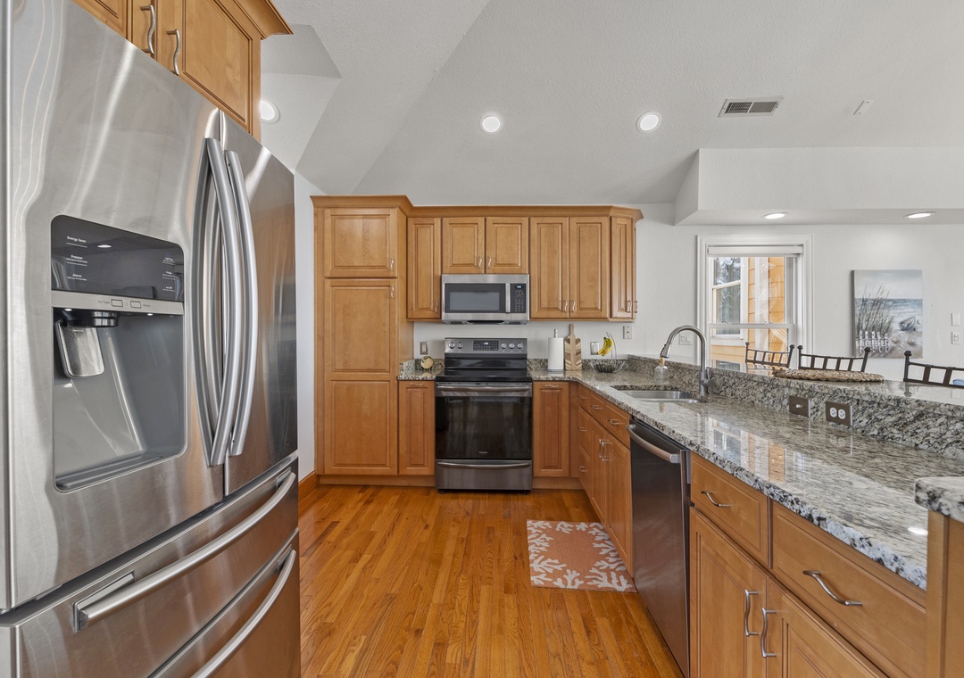 On the top level, gather in the open-concept great room, where plenty of comfortable seating surrounds a large flat-screen TV. The dining area seats five, with additional seating for four at the kitchen bar. The well-equipped kitchen includes modern appliances, a coffee pod maker, and ample space for preparing family meals.