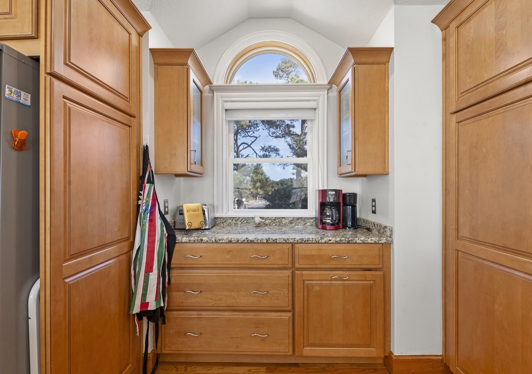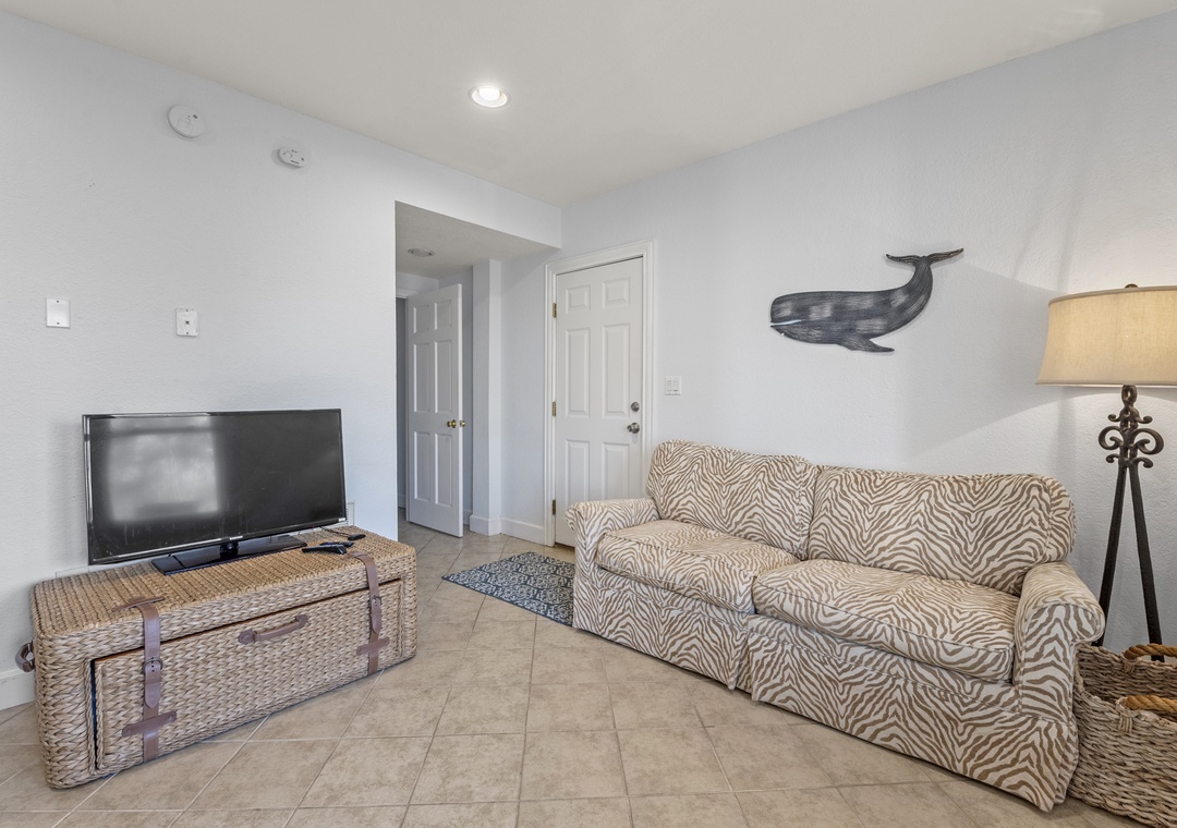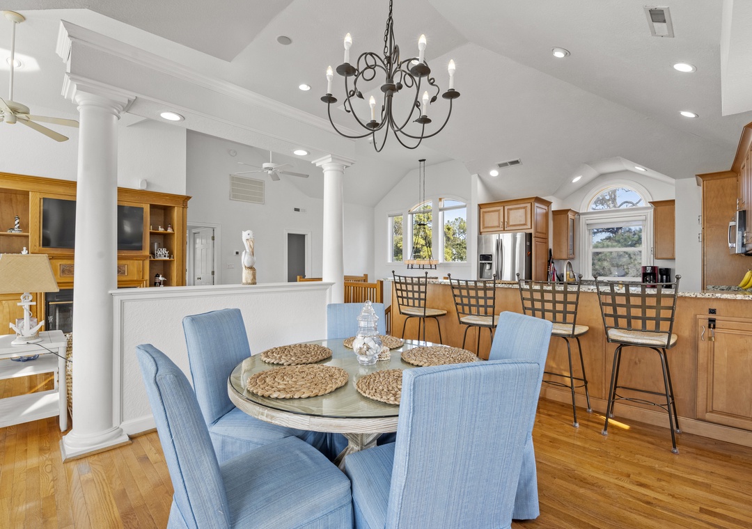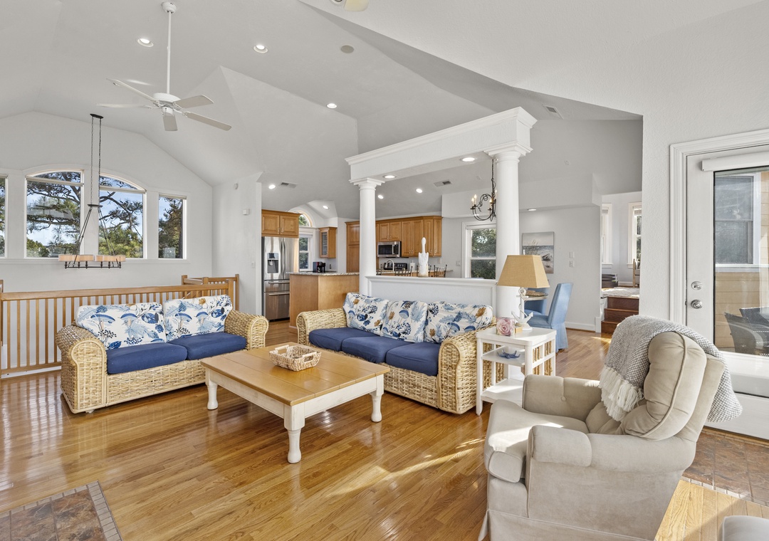 On the top level, gather in the open-concept great room, where plenty of comfortable seating surrounds a large flat-screen TV. The dining area seats five, with additional seating for four at the kitchen bar. The well-equipped kitchen includes modern appliances, a coffee pod maker, and ample space for preparing family meals.