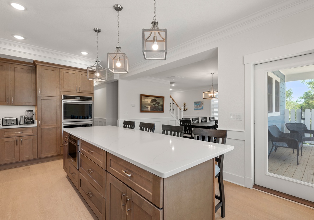 Back inside, the middle level features a beautiful, fully-equipped kitchen. Whether you're preparing a gourmet meal or a quick snack, you'll appreciate the modern appliances and ample counter space. The kitchen opens onto a deck, where you can enjoy easy access to the pool area down the stairwell!