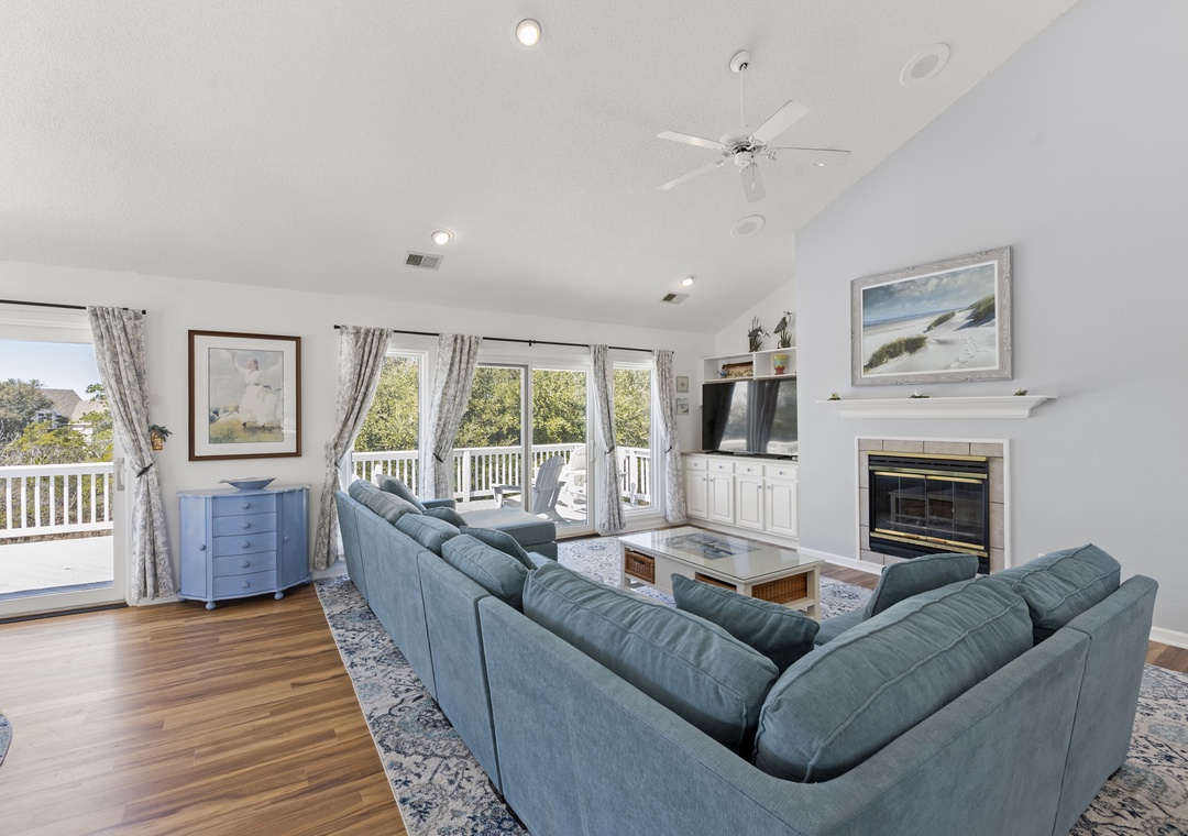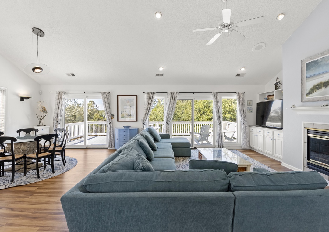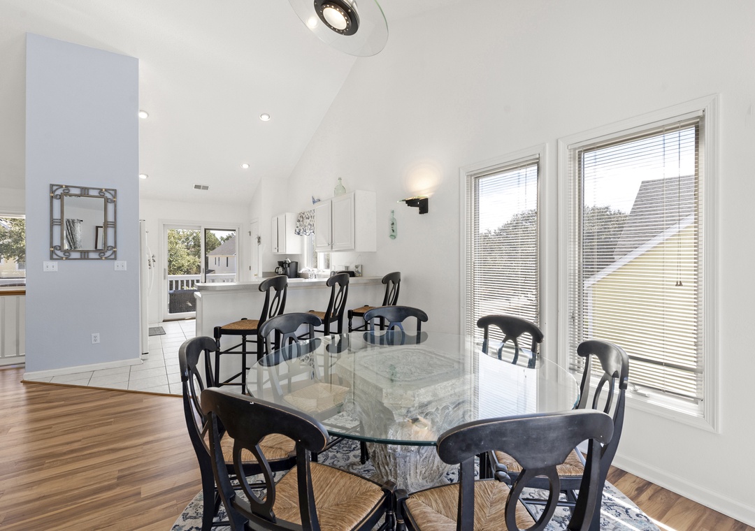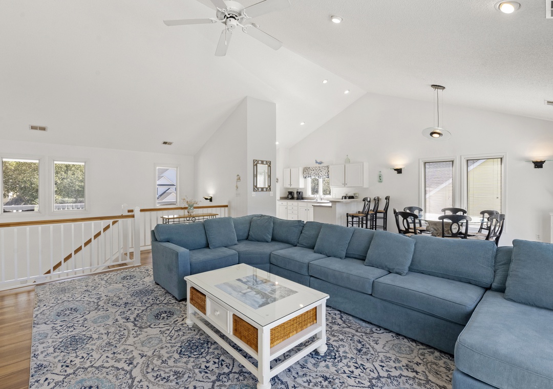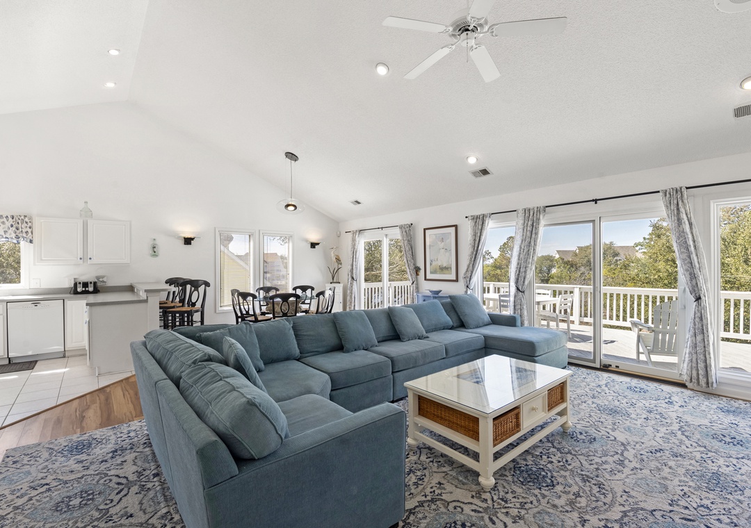Upstairs, all‑new flooring ties together the open great room, dining area, and kitchen, where large windows frame lovely sound views and glowing sunsets. Relax on the sectional with a movie, cook easy vacation meals in the well‑equipped kitchen, and gather around the dining table to plan beach days or tee times. Step out to the top‑level sun deck or covered porch for morning coffee, evening drinks, and colorful sky views over the marsh and sound.