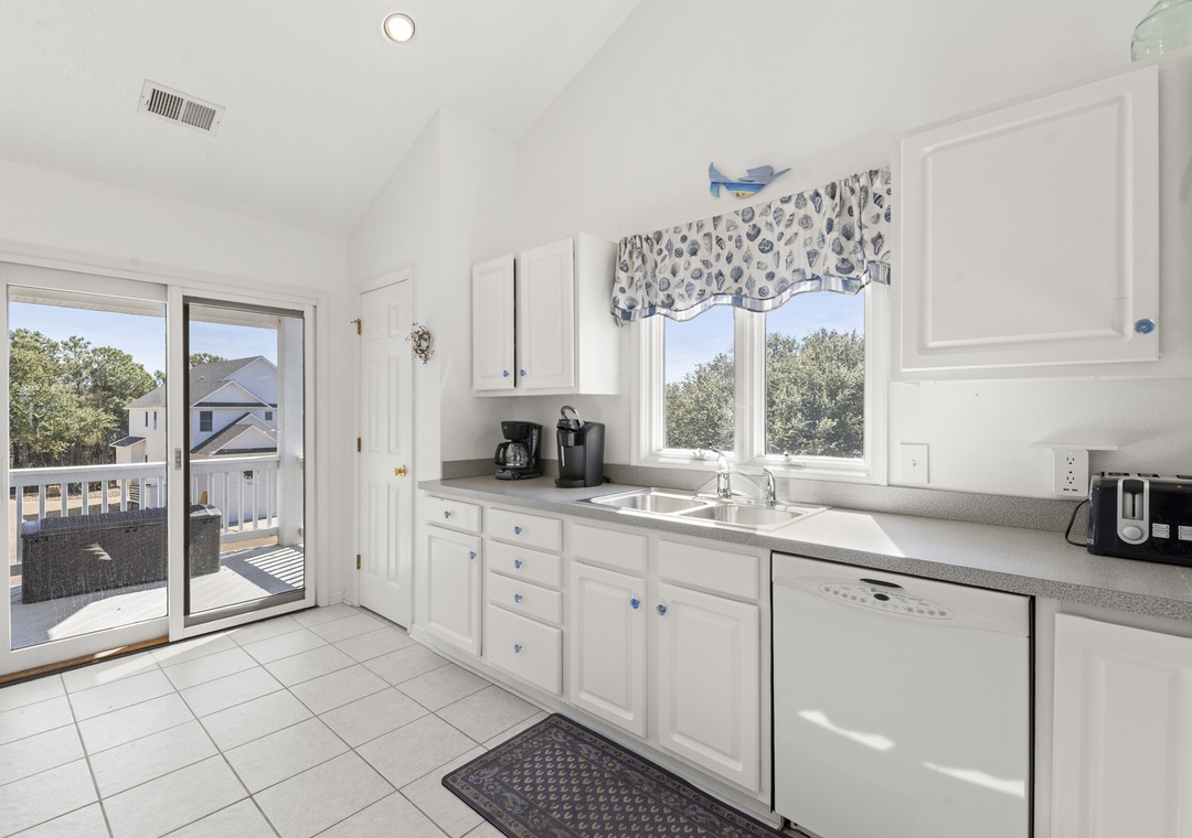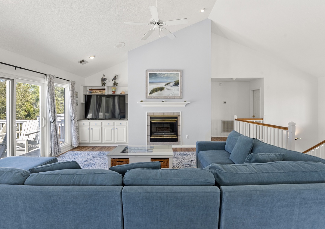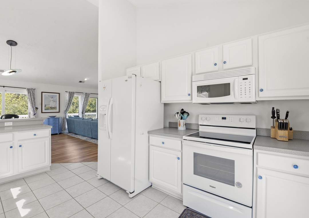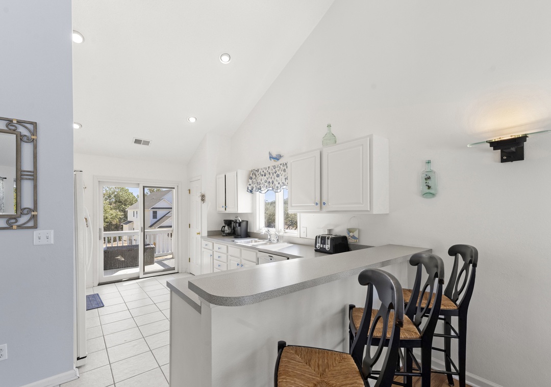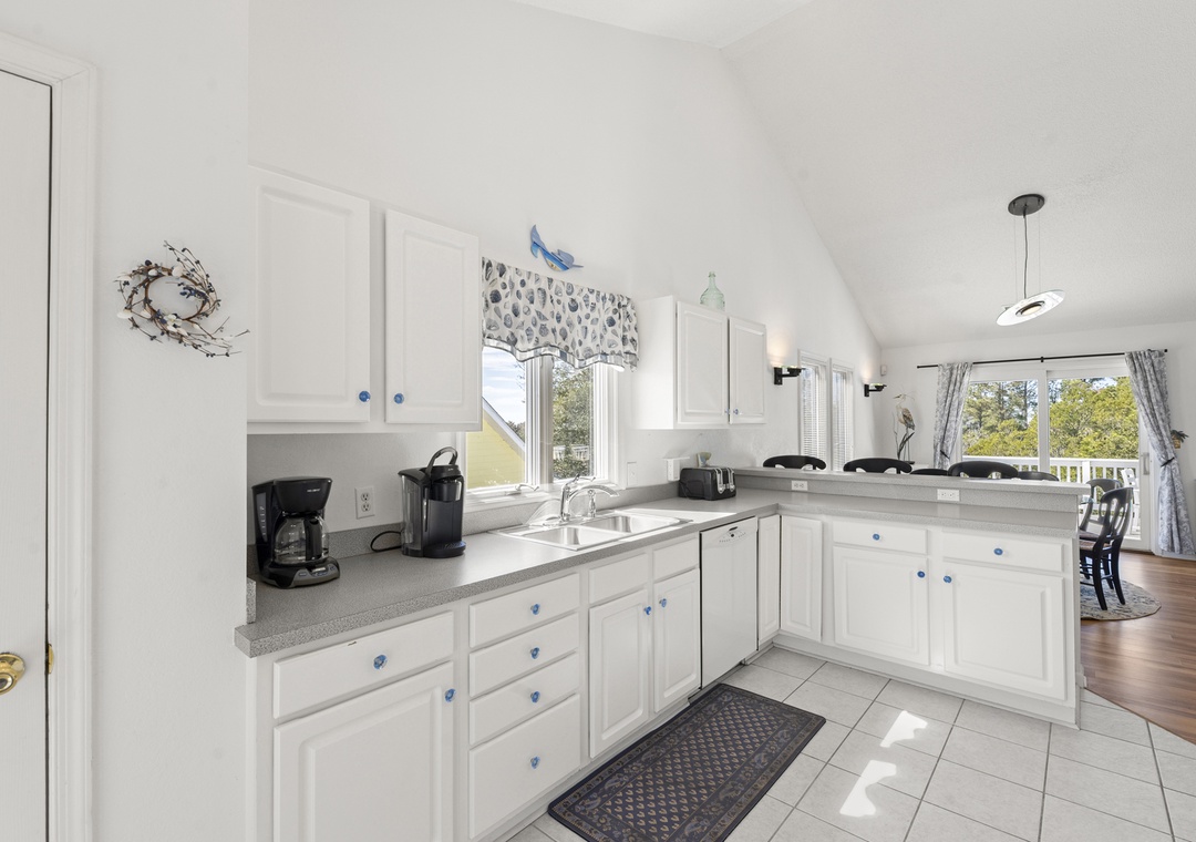 Upstairs, all‑new flooring ties together the open great room, dining area, and kitchen, where large windows frame lovely sound views and glowing sunsets. Relax on the sectional with a movie, cook easy vacation meals in the well‑equipped kitchen, and gather around the dining table to plan beach days or tee times. Step out to the top‑level sun deck or covered porch for morning coffee, evening drinks, and colorful sky views over the marsh and sound.