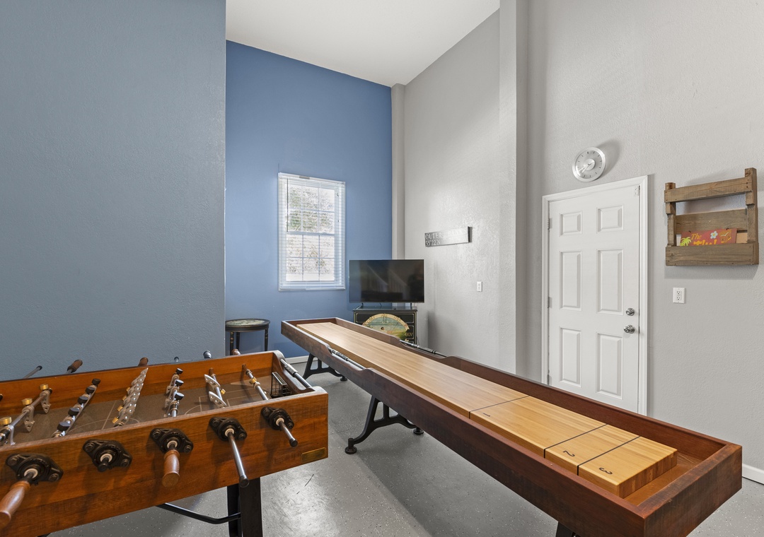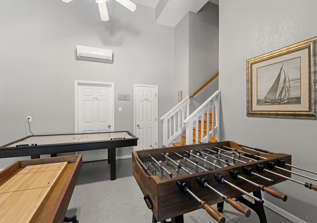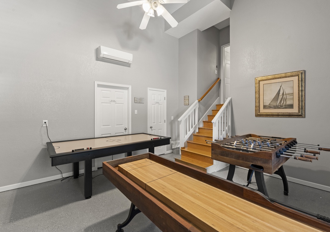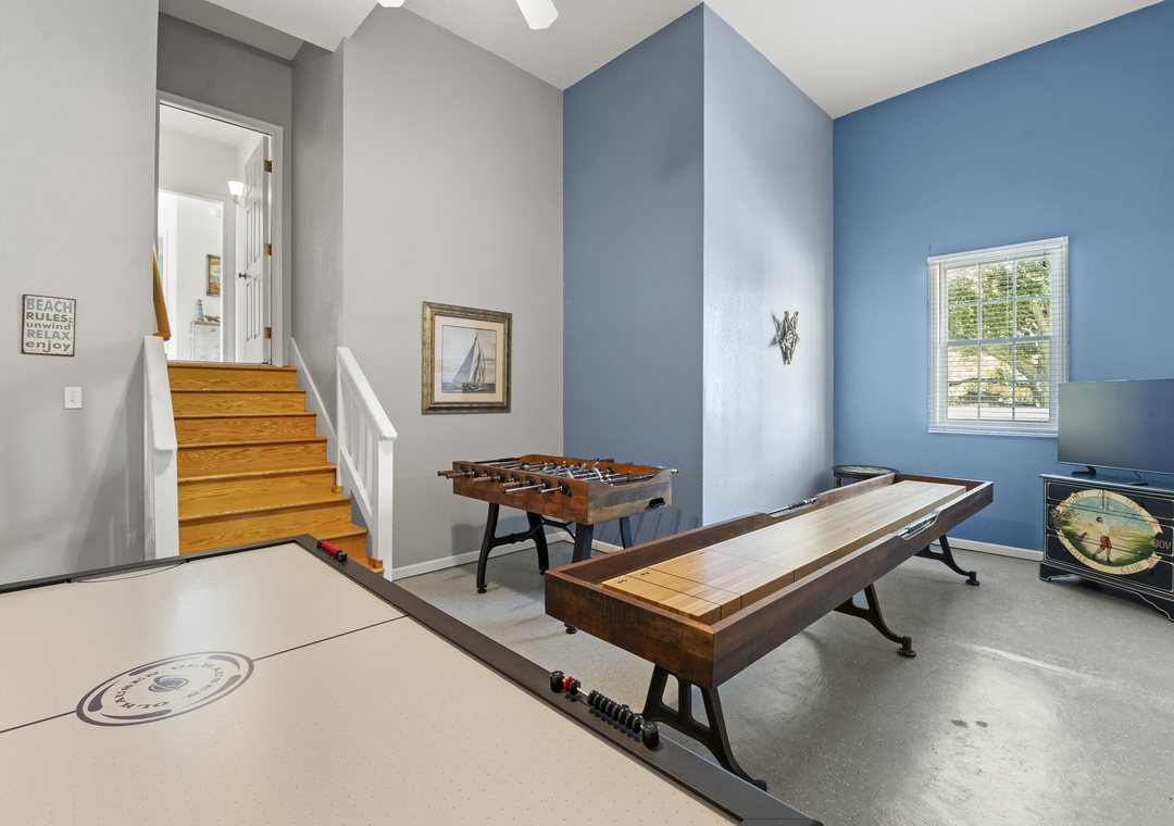 Downstairs, the entry level has also been updated with new flooring and now features a super cool game room that’s genuinely fun for the whole family. Challenge each other to air hockey, foosball, shuffleboard, or a game on the TV while you cool off between pool sessions or unwind after dinner—there’s space here for kids and adults to hang out together or spread out. Two king primary suites, plus additional double bedrooms and three and a half baths, give everyone comfortable sleeping options and privacy.