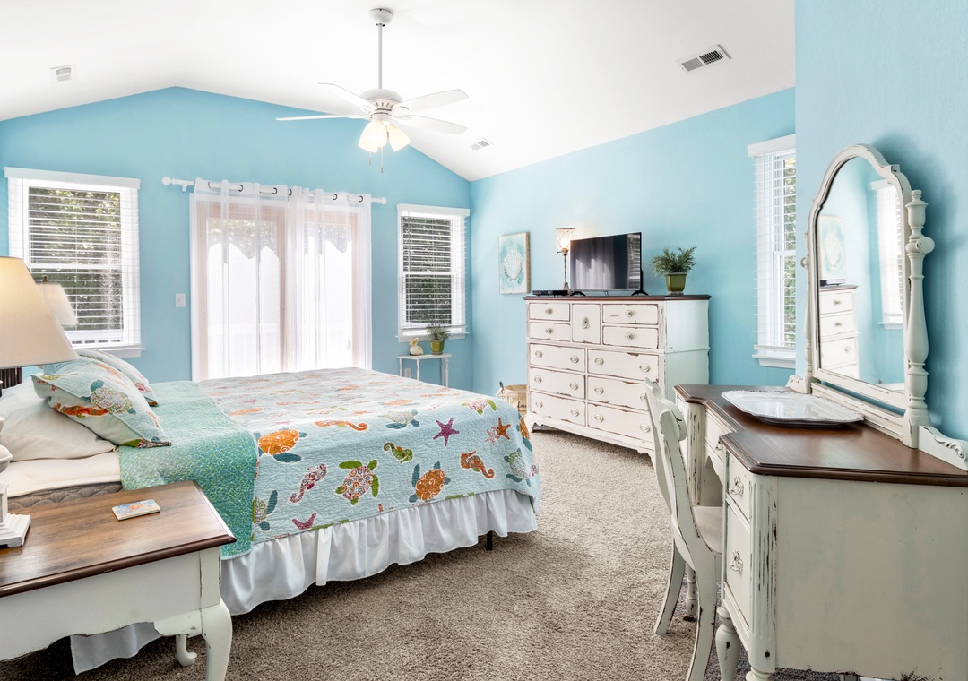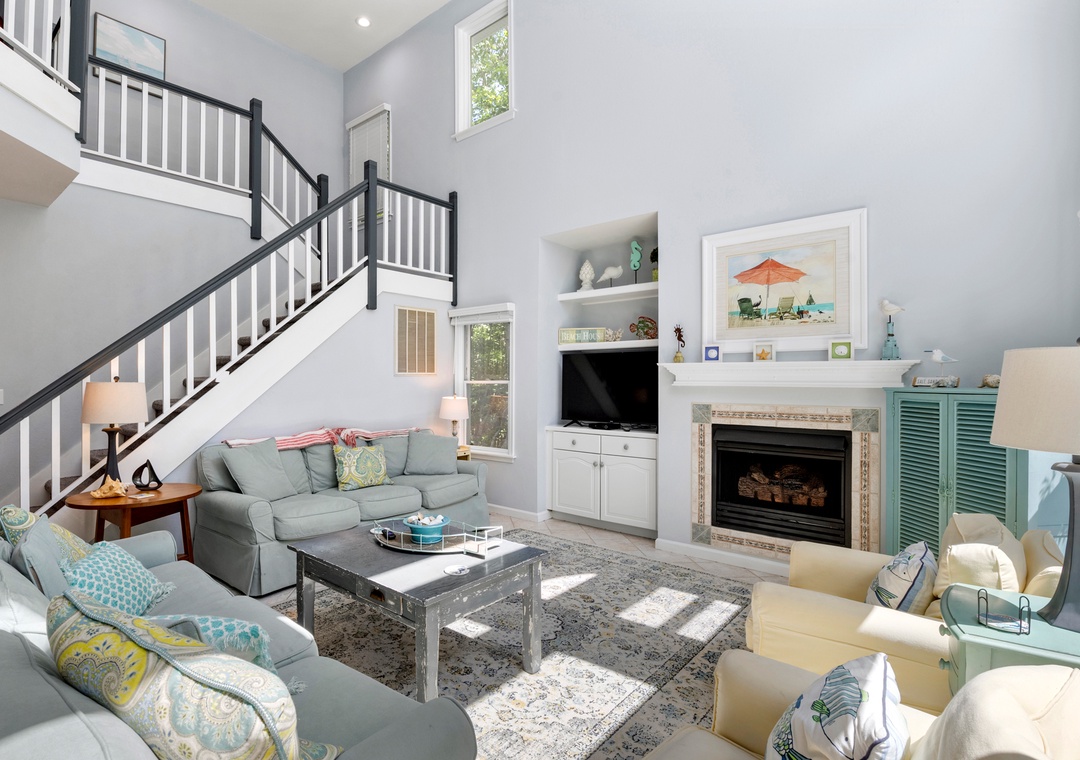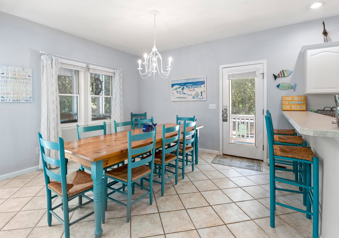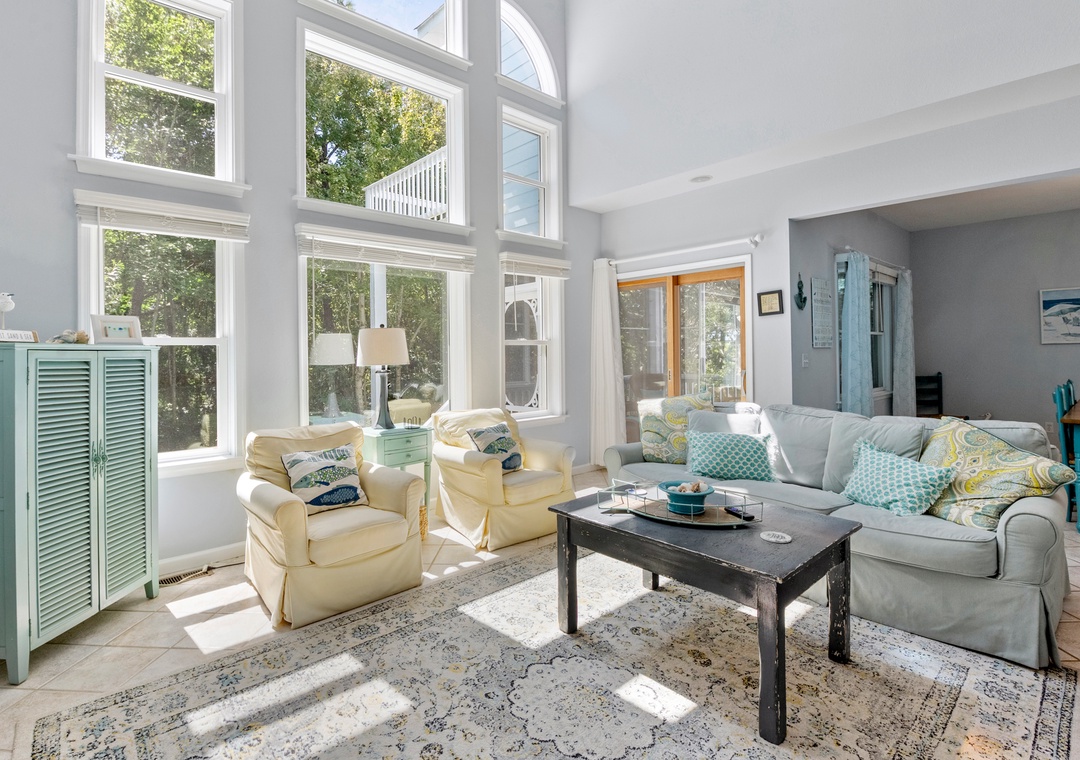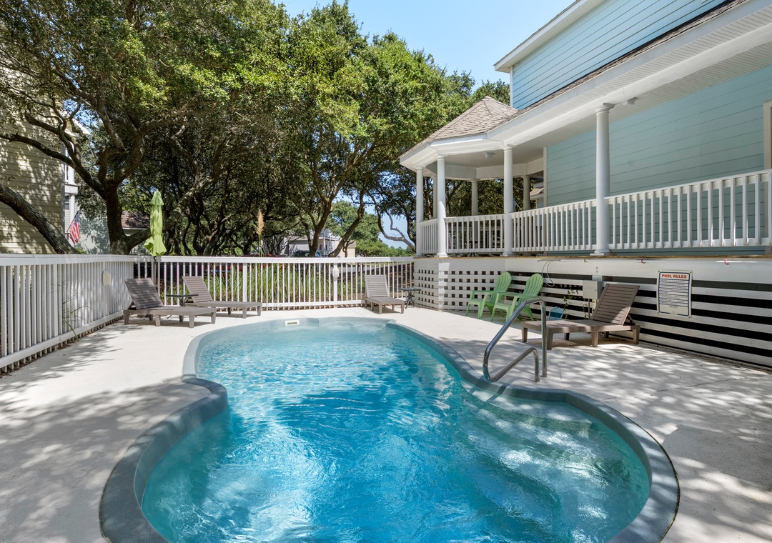 Welcome to Blue Crab Cottage, a tastefully furnished, dog-friendly home in the Magnolia Bay neighborhood of the Currituck Club. With a variety of nearby community amenities, shopping and dining within walking distance, and even trolley service to the beach, you can literally park your car in the driveway and leave it there during your entire stay if you choose. After a day of sun, sand and surf, the outdoor fun can continue back at the house with your very own private pool and hot tub. Inside, relax in the open-concept great room that features soaring, two-story ceilings and a wall of south-facing windows for abundant natural light. The gas fireplace can be used during the off-season for staying cozy on cooler Spring and Fall evenings. The living area leads out to a charming screened porch overlooking the secluded backyard surrounded by mature trees. When you're not dining out, prepare meals in the kitchen with custom, retro-inspired appliances by Big Chill. Ceramic tile runs throughout the entire main level, ideal for sandy feet and paws returning from the beach. All three bedrooms are conveniently located together on the top level. The spacious primary suite provides access to a private sun deck and ensuite bath with dual vanities and a jetted tub.