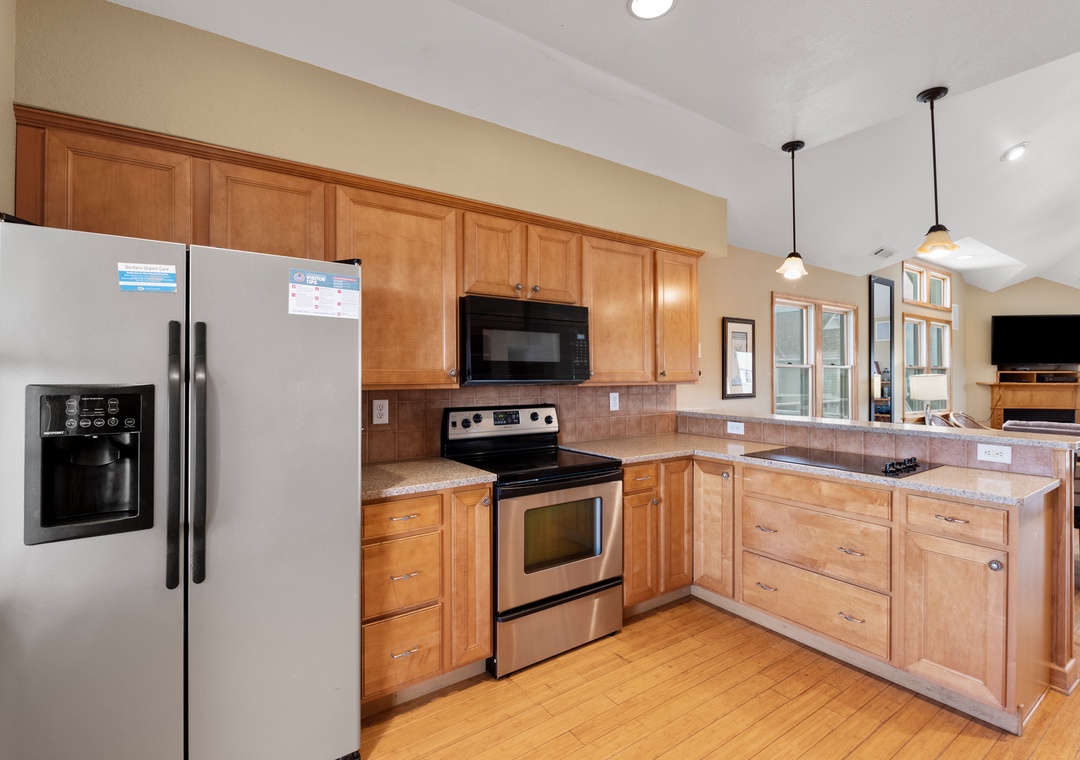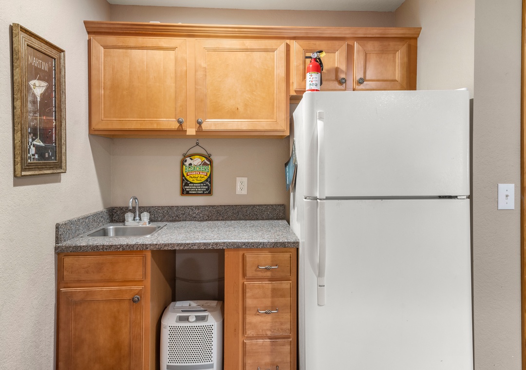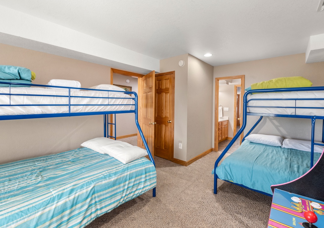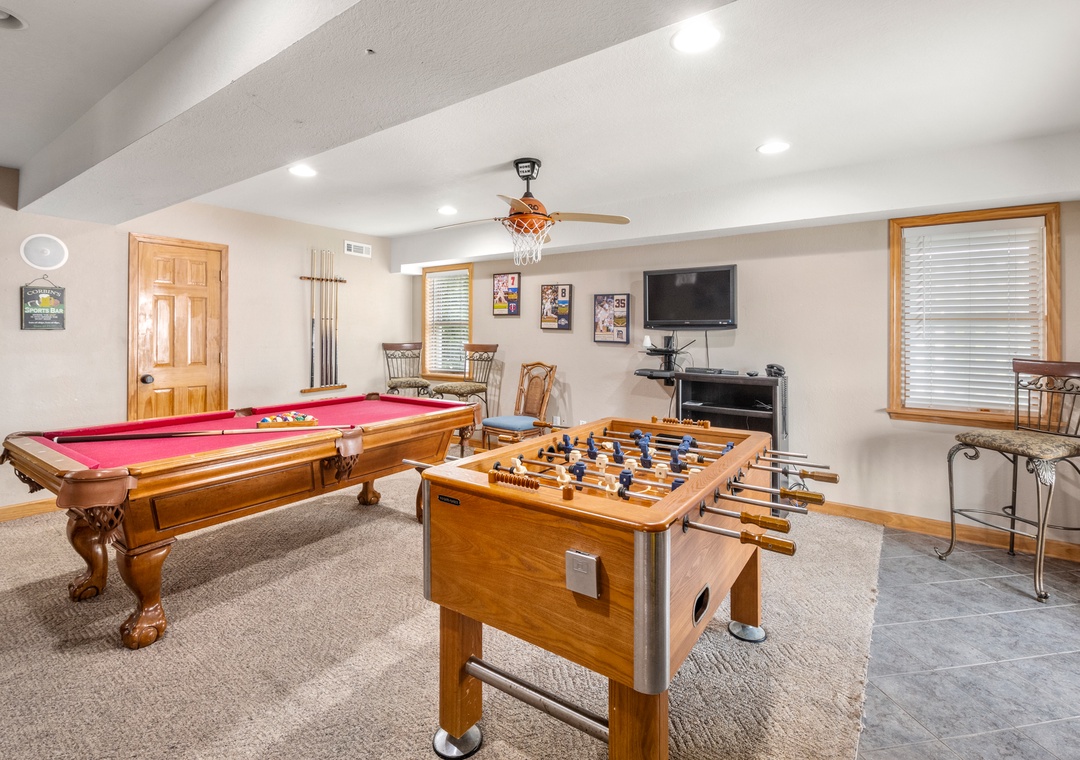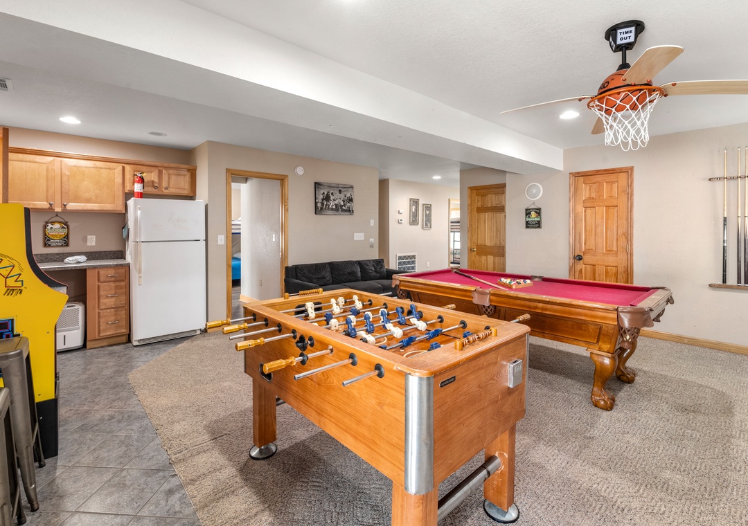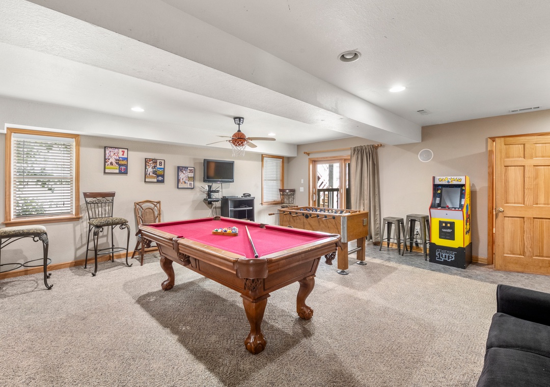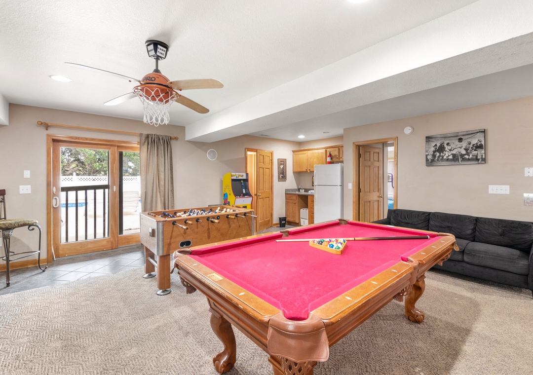 On the mid-level, a media room is equipped with a projection screen and tiered seating for an authentic theater experience without ever leaving the house. The fun continues downstairs in the rec room where guests can participate in some friendly competition. Choose between shooting pool, a foosball tournament, or try to beat the highest score on the arcade-style video game system. This action-packed entertainment space leads directly out to the pool area for effortless indoor/outdoor flow. There, you'll find a fully enclosed backyard oasis with a 26' x 14' private pool, hot tub and even a tiki bar! Back inside, a kitchenette with full-size fridge on the ground level makes it easy to keep the tiki bar stocked with poolside drinks and snacks. When you do need to make your way to the upper levels, skip the stairs and use the elevator - it's especially convenient for unpacking luggage and groceries.