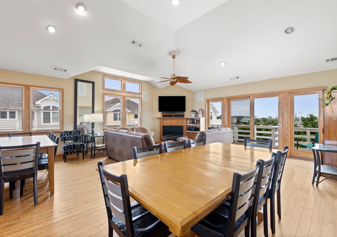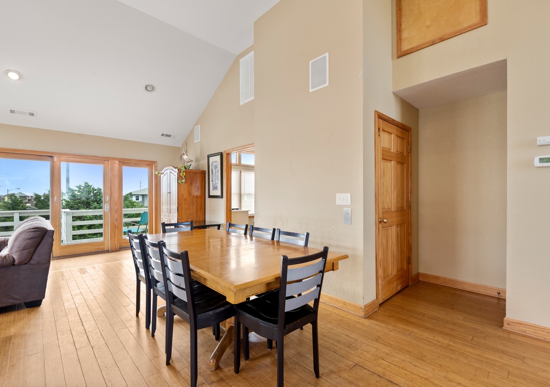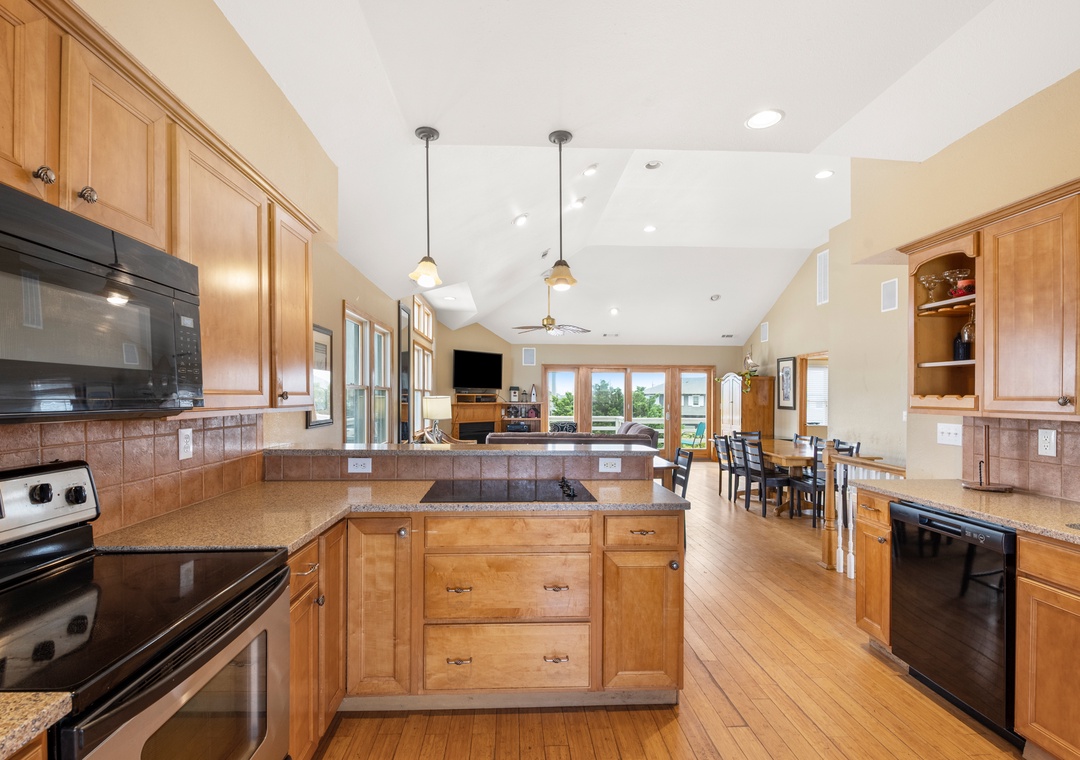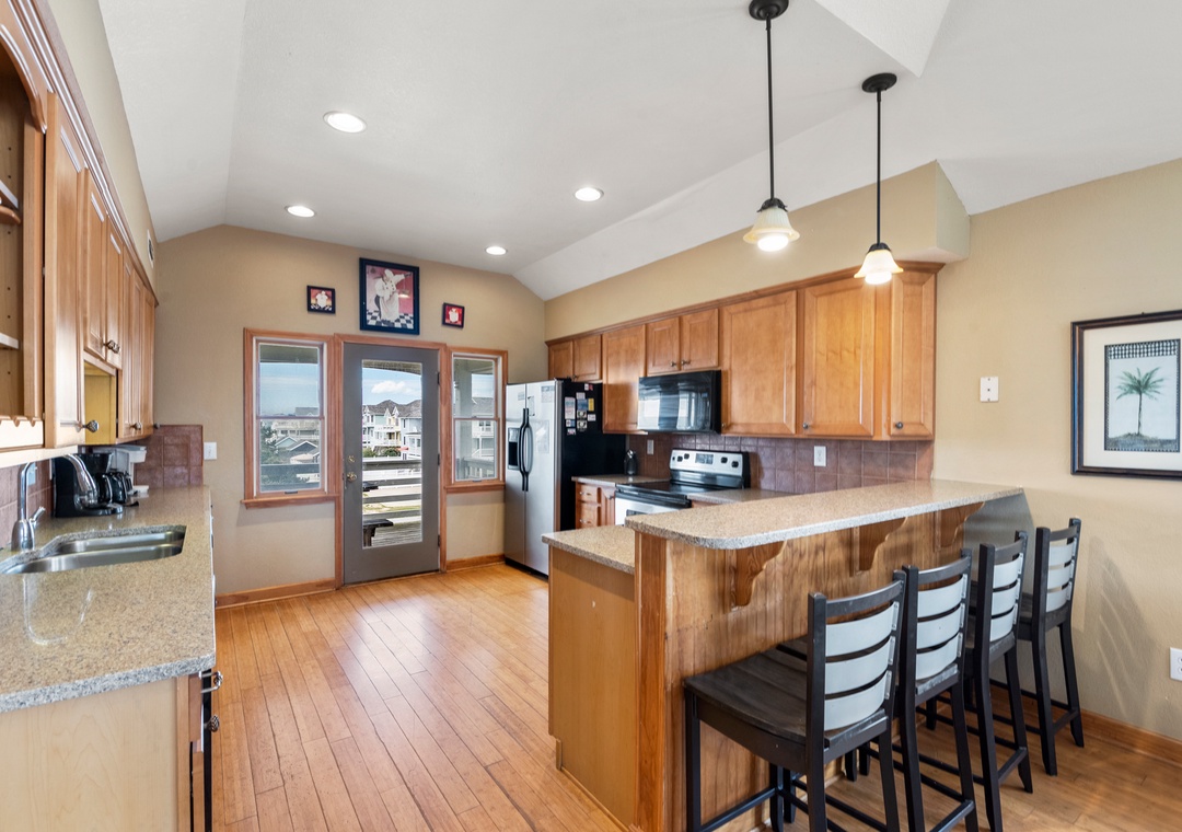 With over 4,200 square feet of indoor living, this spacious retreat provides plenty of room for spreading out while still being under one roof. Four of the eight bedrooms include ensuite baths, perfect for extended families or multiple groups vacationing together. Captain Jack's Landing is dog-friendly, so even your furry companions are welcome to join you. The open-concept great room can accommodate large gatherings and encourages quality time spent with loved ones. Hardwood floors flow throughout the top-level common areas, ideal for sandy feet and paws returning from the beach. In the kitchen, two cooktops, two sinks and two dishwashers make cooking and clean-up for large groups a breeze. With two dining tables that seat eight each and bar seating for four more, everyone can enjoy meals together. A separate nook also provides table seating, an ideal space for playing cards or board games.