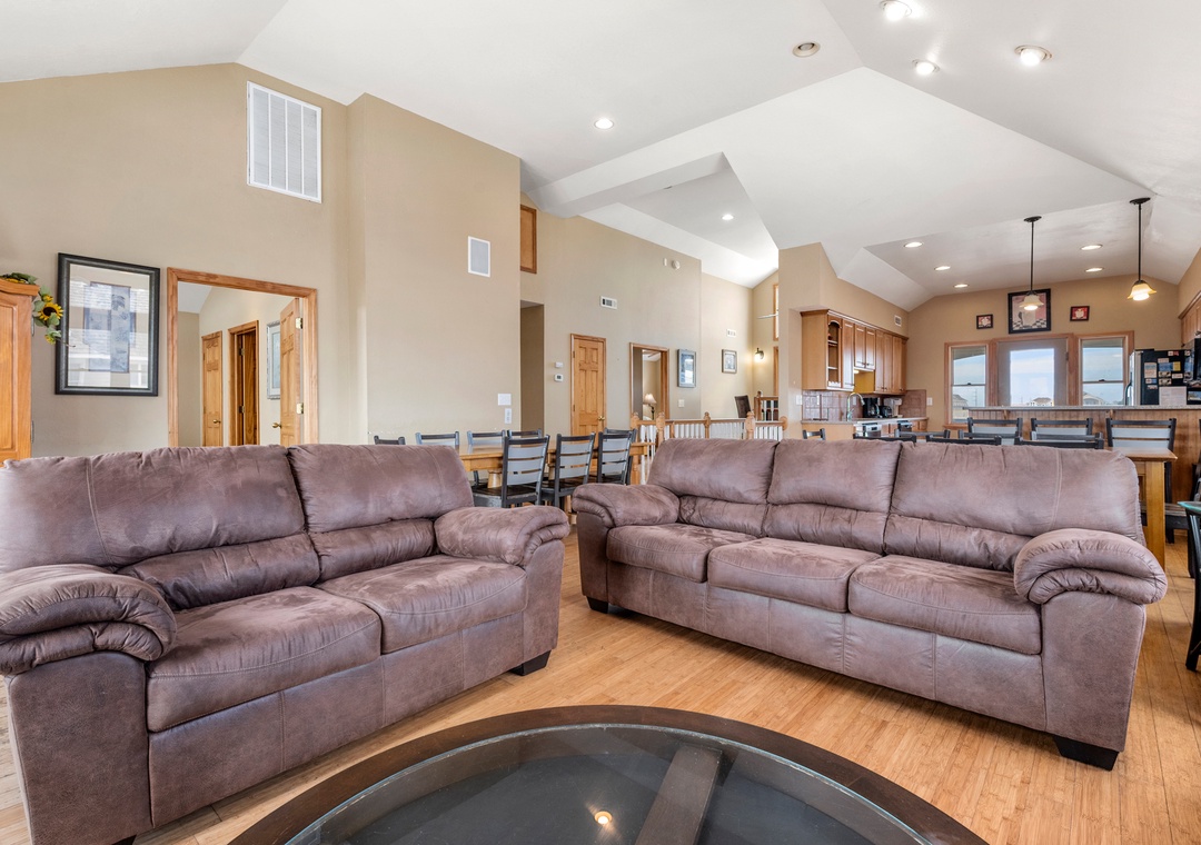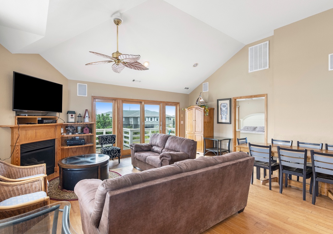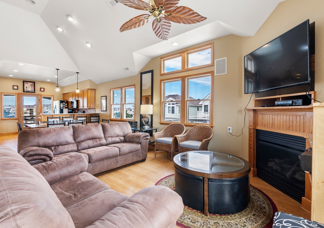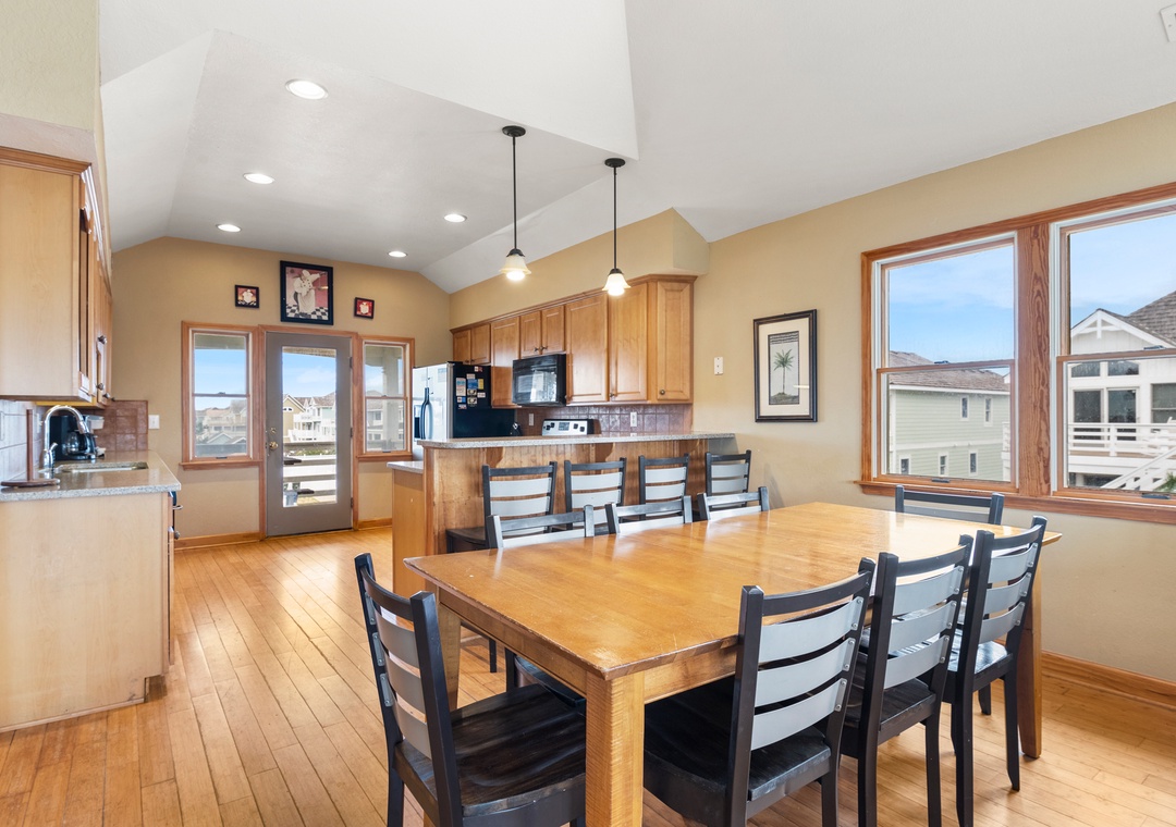 With over 4,200 square feet of indoor living, this spacious retreat provides plenty of room for spreading out while still being under one roof. Four of the eight bedrooms include ensuite baths, perfect for extended families or multiple groups vacationing together. Captain Jack's Landing is dog-friendly, so even your furry companions are welcome to join you. The open-concept great room can accommodate large gatherings and encourages quality time spent with loved ones. Hardwood floors flow throughout the top-level common areas, ideal for sandy feet and paws returning from the beach. In the kitchen, two cooktops, two sinks and two dishwashers make cooking and clean-up for large groups a breeze. With two dining tables that seat eight each and bar seating for four more, everyone can enjoy meals together. A separate nook also provides table seating, an ideal space for playing cards or board games.