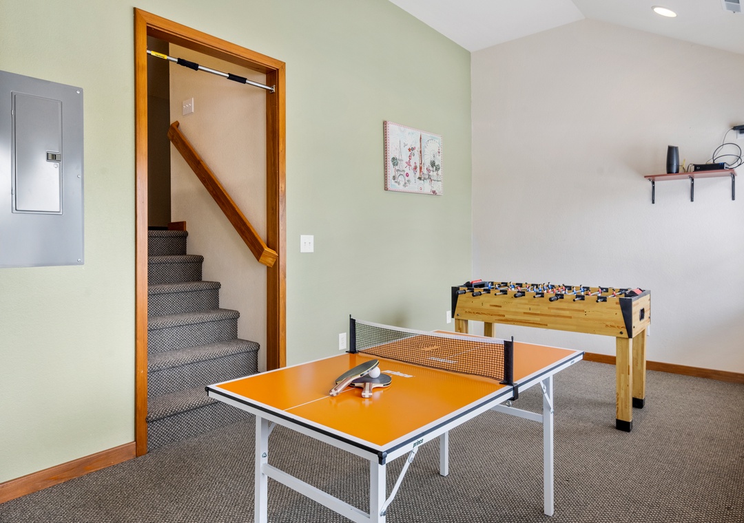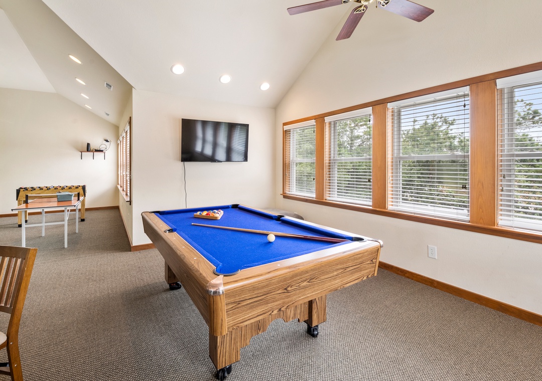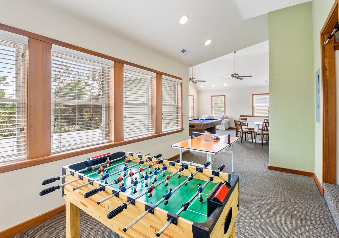 When you're not dining out or cooking out, prepare meals in the spacious and well-equipped kitchen. A peninsula with bar seating overlooks the living area so the chef in your group can still socialize while cooking. Sit everyone down together in the formal dining room with a table for eight and a full bar where happy hour can start anytime! The primary suite is generously sized and features soaring ceilings and an ensuite bath. Three additional bedrooms will comfortably accommodate family and friends. Upstairs, a massive rec room provides plenty of bonus space and can serve as an additional living area. Between the pool table, foosball table and ping pong table, there are a variety of options for friendly competition and indoor entertainment.