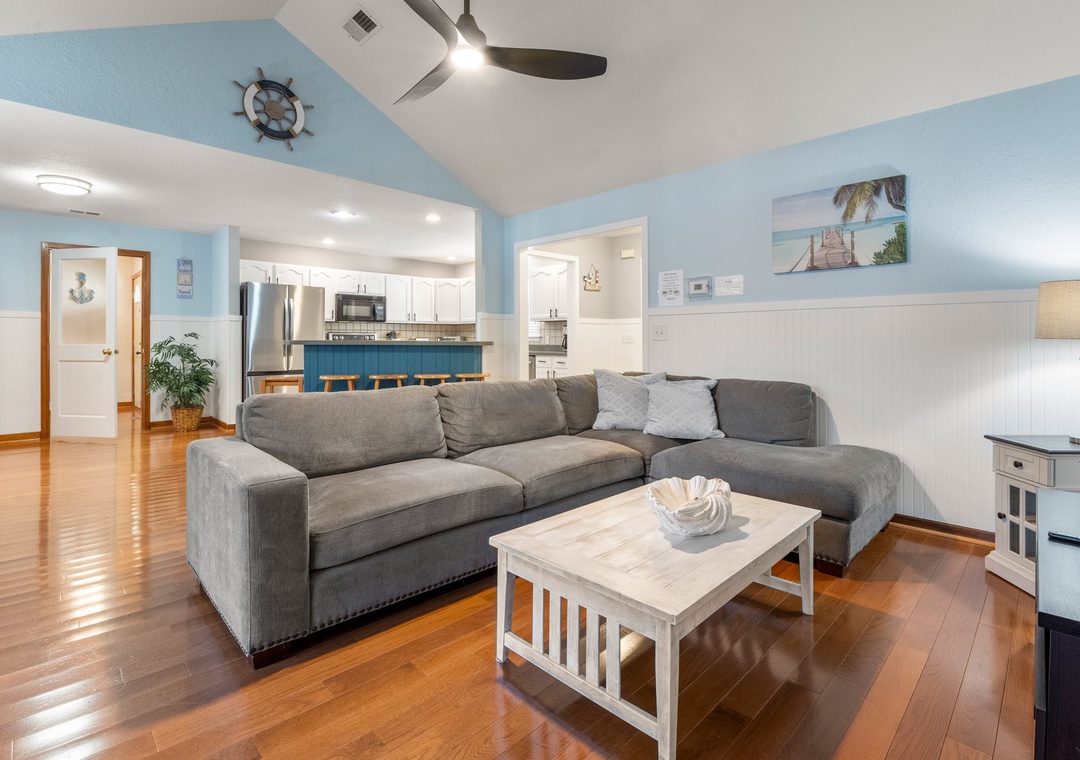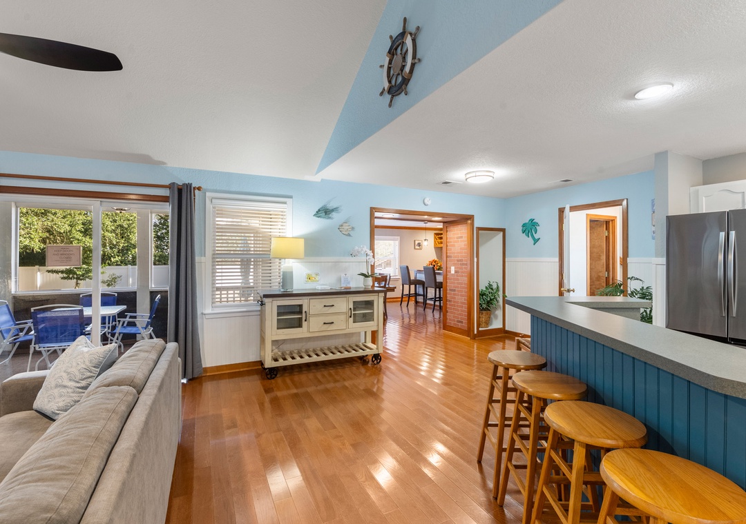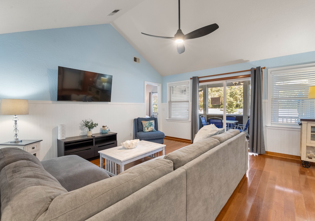Anchor's Aweigh is a lovely home situated in the highly sought-after and family-friendly community of Nags Head Acres. Enjoy the peace and seclusion of this residential soundside neighborhood while still being within walking or biking distance to shopping, dining and best of all - the beach! After a day of fun in the sun, come home and gather in the open-concept great room with hardwood floors and vaulted ceilings. A sliding door connects the space to a charming screened porch that opens up onto an expansive sun deck. This outdoor oasis includes a hot tub for soaking away the day and a grill for cookouts. The entire backyard is enclosed with privacy fencing and features a barefoot-friendly lawn perfect for kids, pets and yard games.