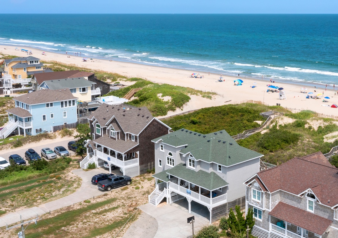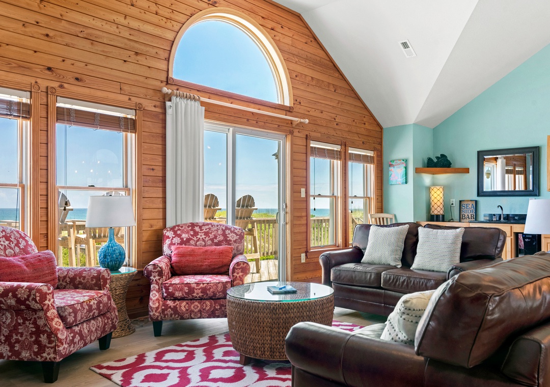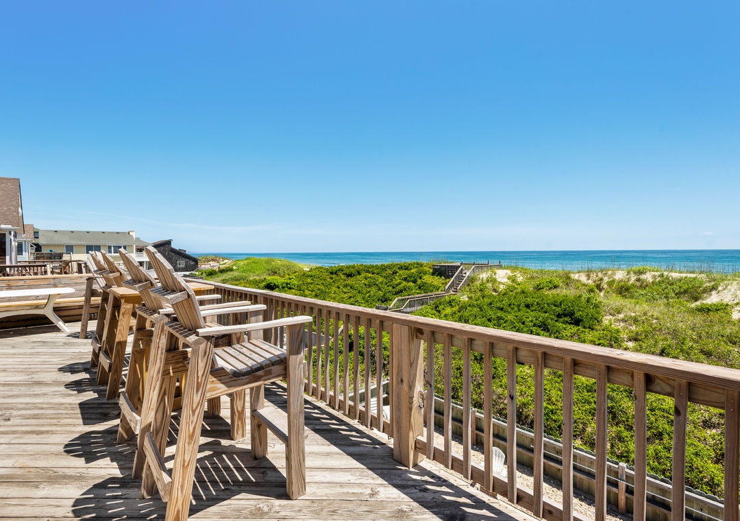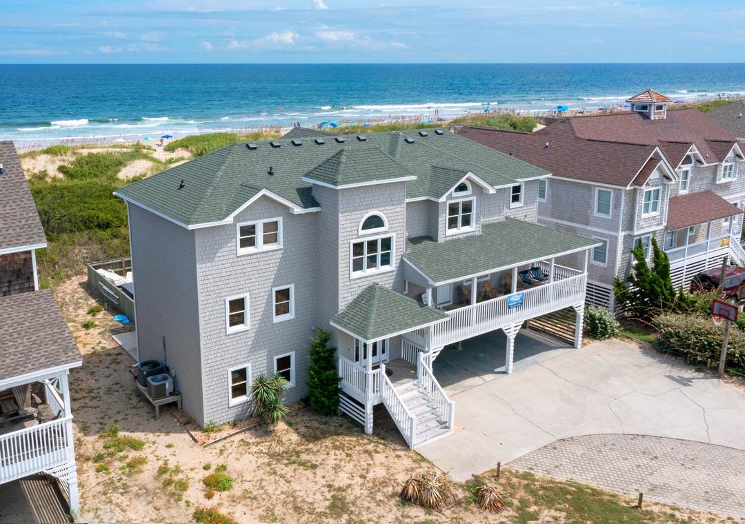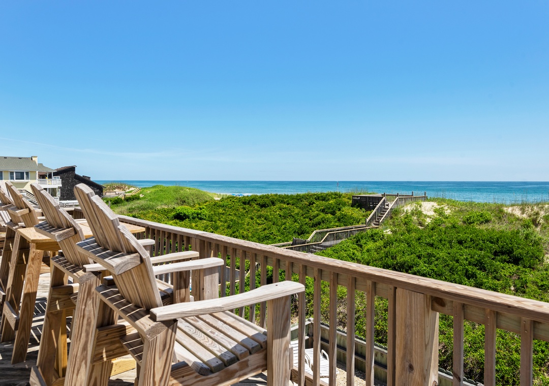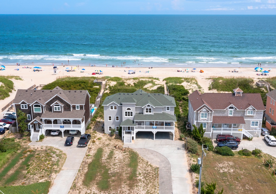 Escape reality and get carried away at Sunswept, an oceanfront retreat in Nags Head that has everything you've been looking for. This well-maintained home boasts a private pool, hot tub, rec room, and unobstructed ocean views. For non-stop fun in the sun, easily transition from the pool to the beach using the private walkway with dunetop deck. Inside, Sunswept provides 3,400 square feet of comfortably furnished living space, ideal for extended families or multiple groups vacationing together. The open-concept great room features vaulted ceilings, a wet bar with mini fridge, and a wall of east-facing windows showcasing the panoramic ocean views. The living area opens up onto an oceanfront deck for effortless indoor/outdoor living. It's the perfect spot to watch the sunrise with your morning coffee or simply enjoy the salty ocean breezes.