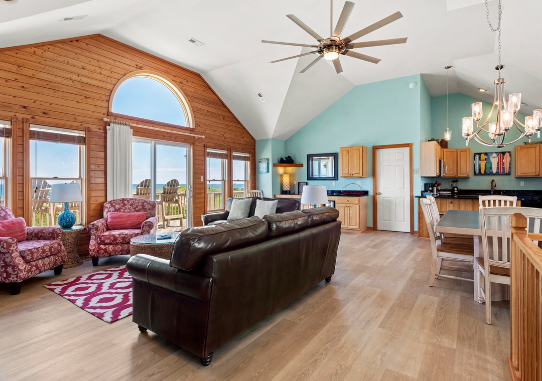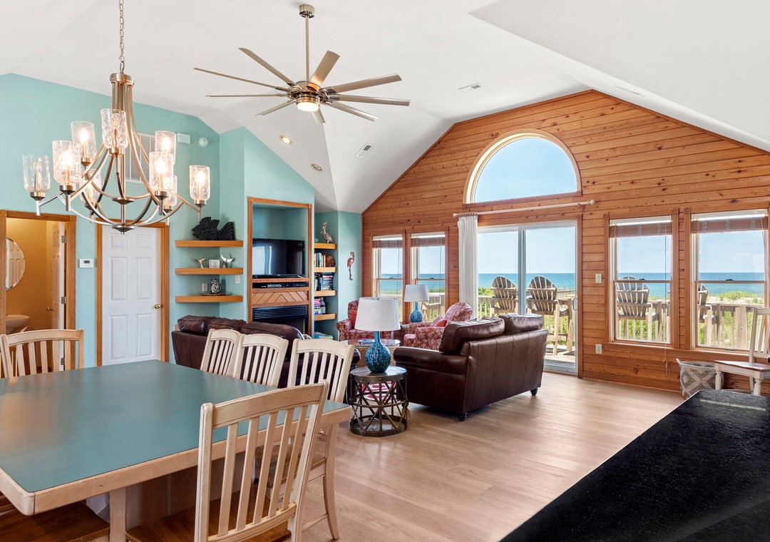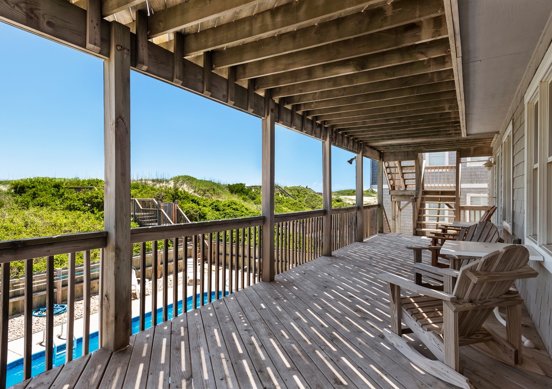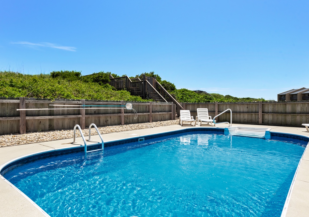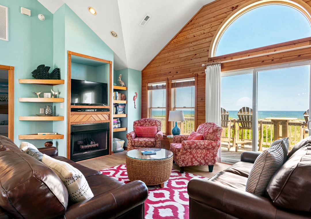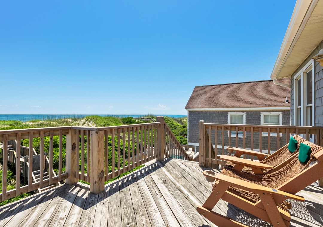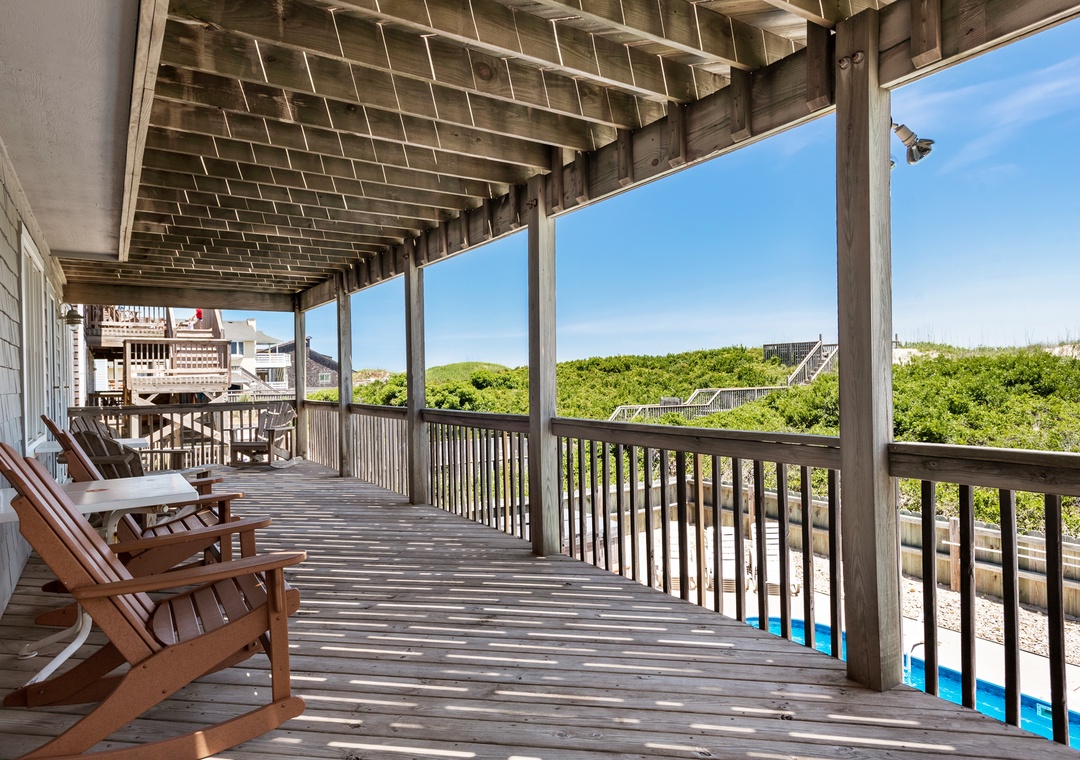 Escape reality and get carried away at Sunswept, an oceanfront retreat in Nags Head that has everything you've been looking for. This well-maintained home boasts a private pool, hot tub, rec room, and unobstructed ocean views. For non-stop fun in the sun, easily transition from the pool to the beach using the private walkway with dunetop deck. Inside, Sunswept provides 3,400 square feet of comfortably furnished living space, ideal for extended families or multiple groups vacationing together. The open-concept great room features vaulted ceilings, a wet bar with mini fridge, and a wall of east-facing windows showcasing the panoramic ocean views. The living area opens up onto an oceanfront deck for effortless indoor/outdoor living. It's the perfect spot to watch the sunrise with your morning coffee or simply enjoy the salty ocean breezes.
