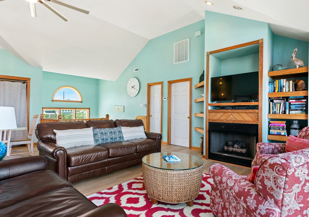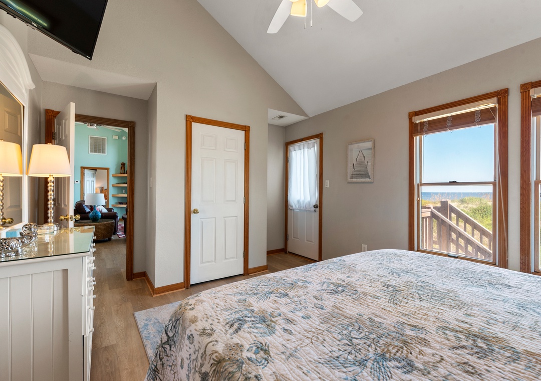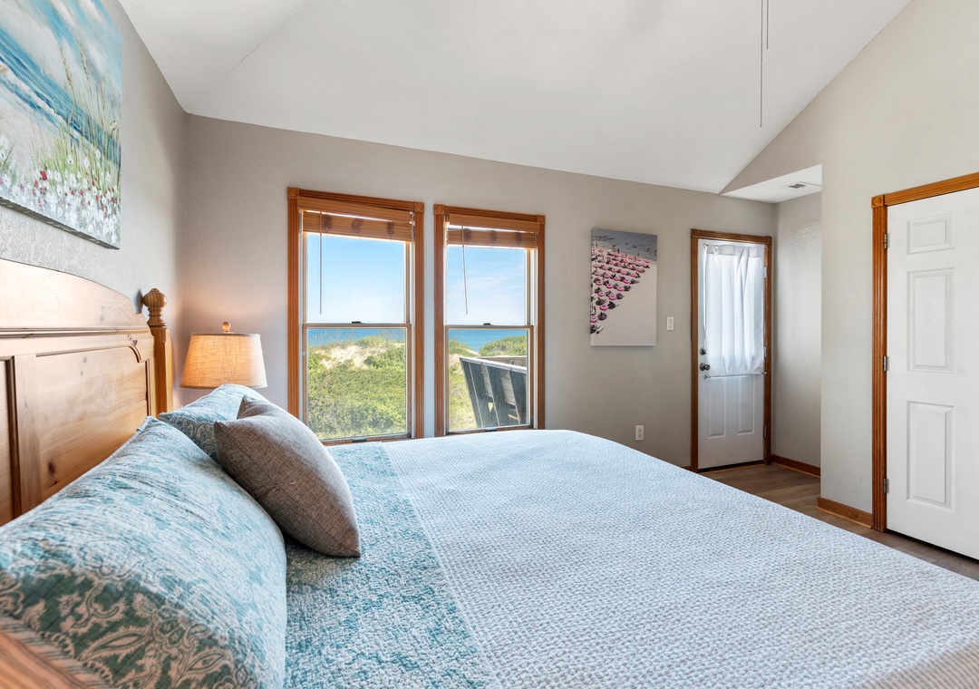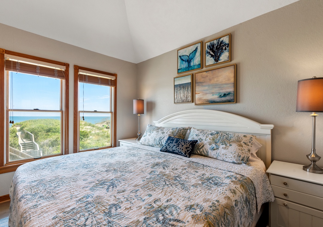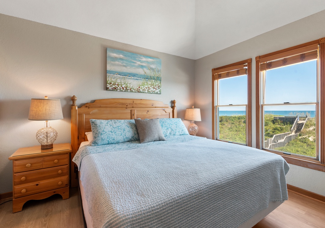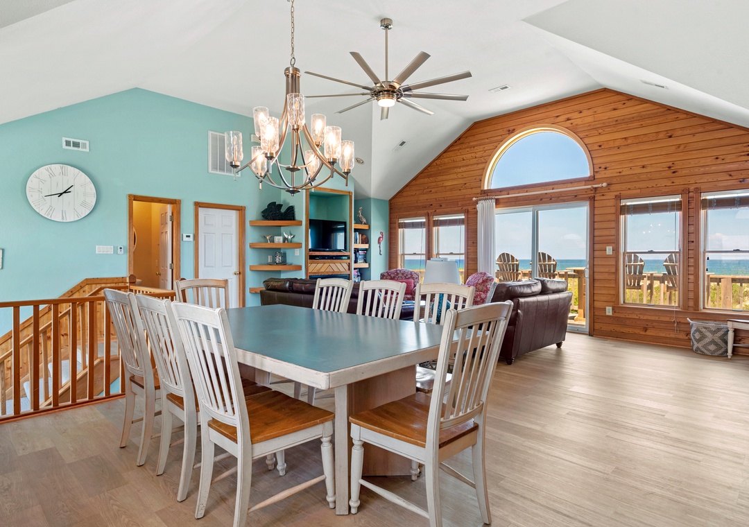 Escape reality and get carried away at Sunswept, an oceanfront retreat in Nags Head that has everything you've been looking for. This well-maintained home boasts a private pool, hot tub, rec room, and unobstructed ocean views. For non-stop fun in the sun, easily transition from the pool to the beach using the private walkway with dunetop deck. Inside, Sunswept provides 3,400 square feet of comfortably furnished living space, ideal for extended families or multiple groups vacationing together. The open-concept great room features vaulted ceilings, a wet bar with mini fridge, and a wall of east-facing windows showcasing the panoramic ocean views. The living area opens up onto an oceanfront deck for effortless indoor/outdoor living. It's the perfect spot to watch the sunrise with your morning coffee or simply enjoy the salty ocean breezes.
