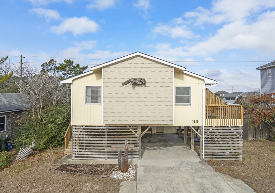 All living space is on one convenient level, featuring a bright and open living room and kitchen ideal for gathering. The home includes a room with twin-over-twin bunk beds, two rooms with queen beds, and a spacious king bedroom. There is a full hallway bath, and a Jack-and-Jill shared bath between two bedrooms for added convenience. Step outside to enjoy the furnished deck, perfect for relaxing after a day at the beach. Downstairs, you’ll find a carport and laundry area. Located in the desirable Old Nags Head Cove community, this home is close to local dining, shopping, and the beautiful Outer Banks beaches, your coastal getaway starts here!