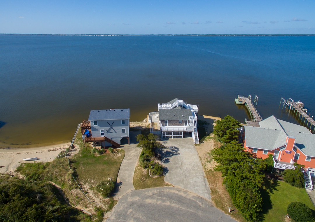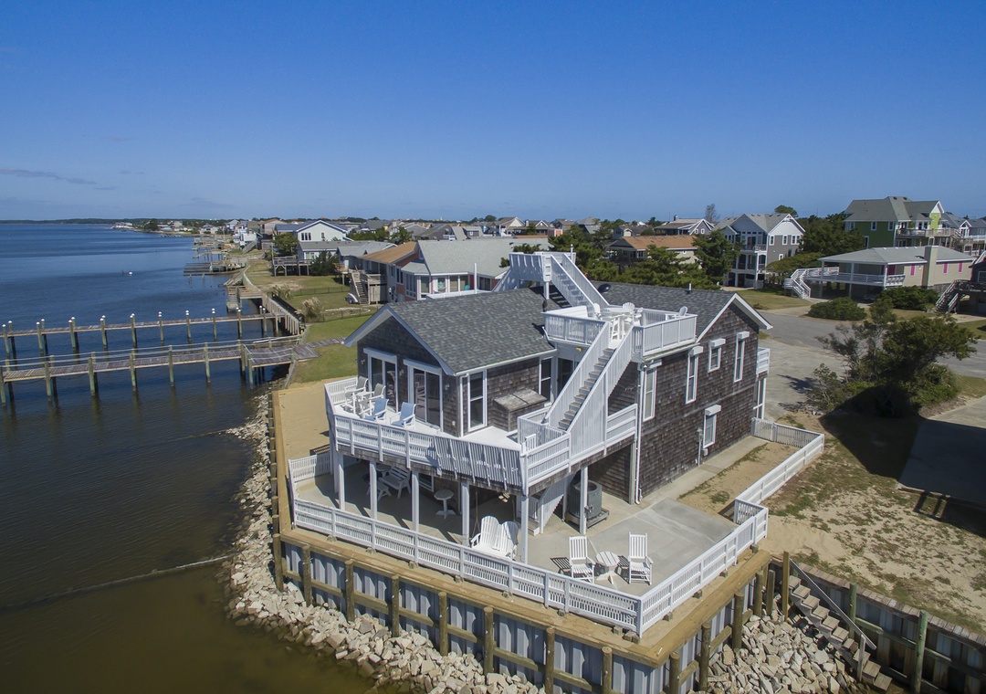All Decked Out with water views and mesmerizing sunsets! This cute four-bedroom home is located on the sound front in Old Nags Head Cove. Grab your morning coffee or favorite evening beverage and head to the multi-level decks where you can take in the 180-degree views of the sound and watch watersports enthusiast kayaking, paddle boarding, windsurfing and make sure you have your camera ready to capture the most beautiful sunsets in the evening. This OBX Rental Home also features a spacious and well-landscaped yard for outside activities, while the immediate water access allows for fishing and crabbing. The great room with gorgeous water views is the perfect spot to end your day with a delicious meal and a movie. Downstairs, you'll find a second living area, kitchenette, and a fourth bedroom. This ground level suite has access to a semi-private bath with handicap-friendly features, ideal for guests with mobility needs.