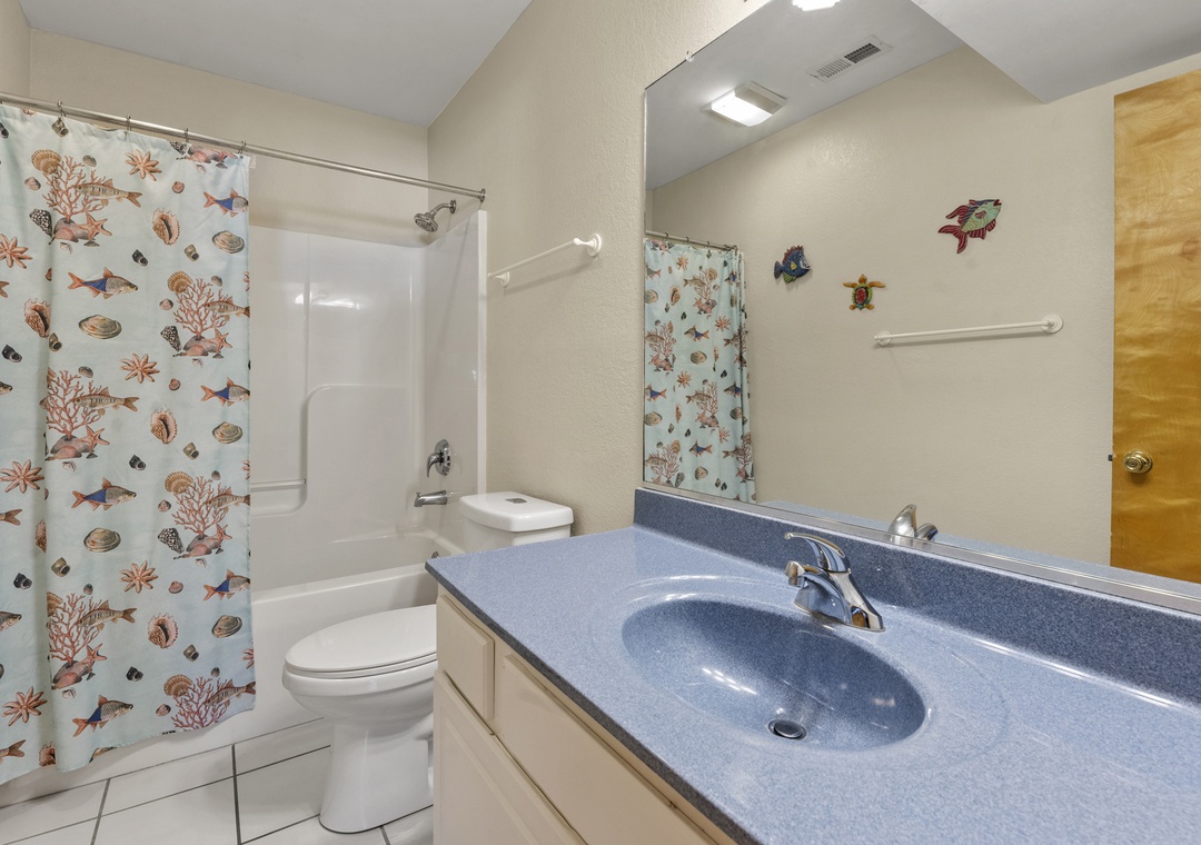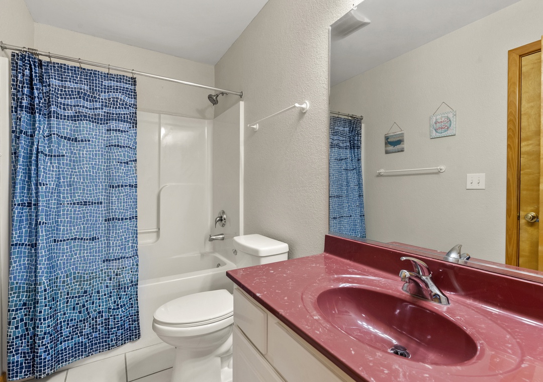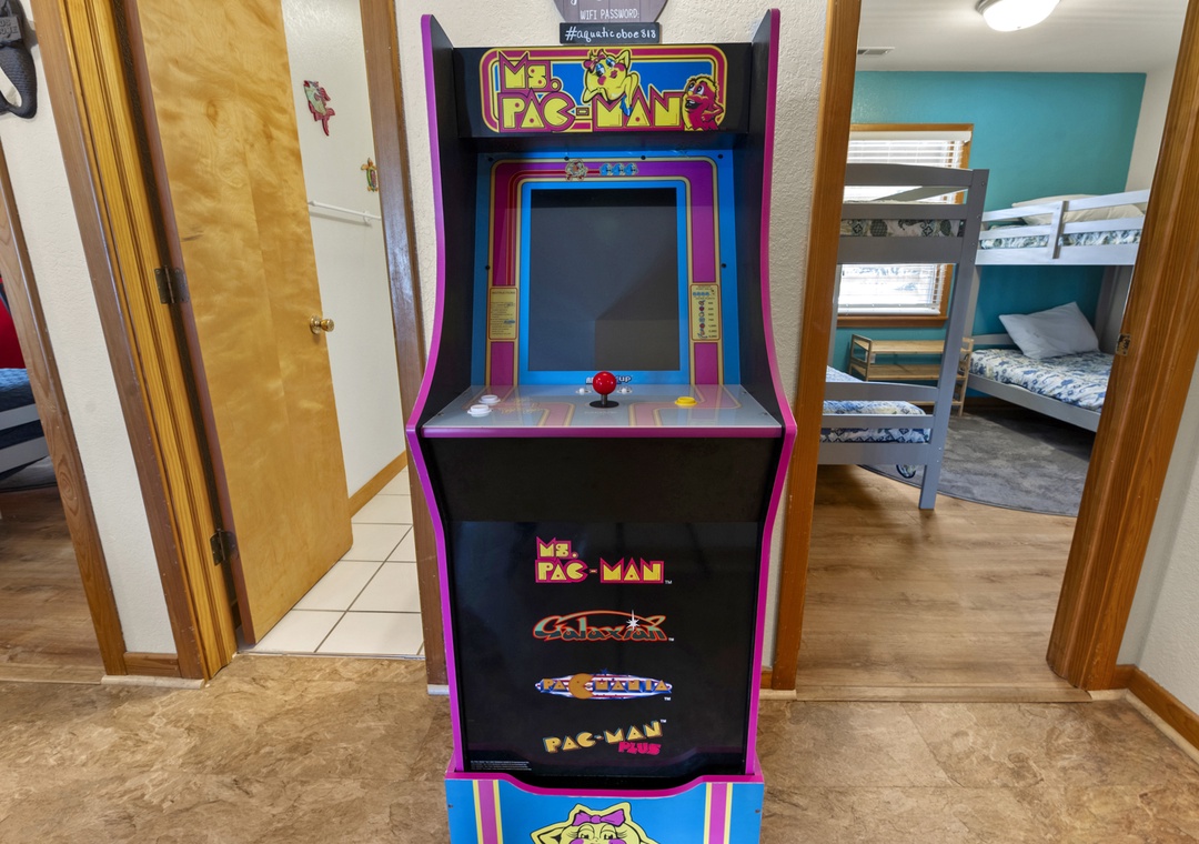 Upon entering the ground level, you'll find a lively game room complete with a pool table and wet bar, perfect for entertaining. This level also features a queen ensuite bedroom with an attached full bath, a bedroom with two bunk bed sets, and another with a pyramid bunk bed. Conveniently located on this level is also a full hall bath and laundry area. Step outside and dive into the fun! Rinse off in the refreshing outdoor shower after a sun-soaked beach day, shoot some hoops at the basketball goal, or gather around the picnic tables for laid-back outdoor meals and games. Whether you're soaking in the hot tub or splashing in the private pool, the outdoor amenities at Anchors Away promise endless enjoyment and relaxation for everyone.