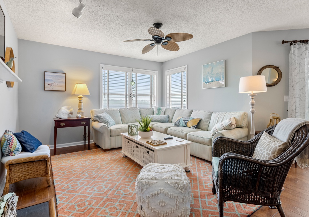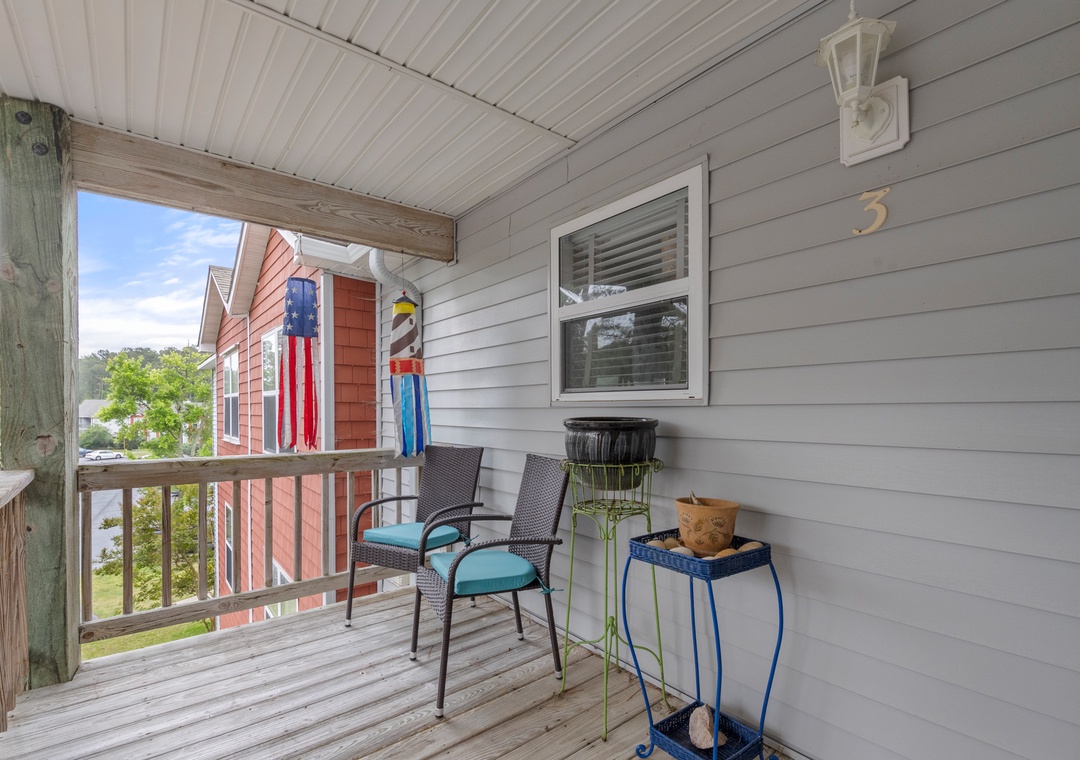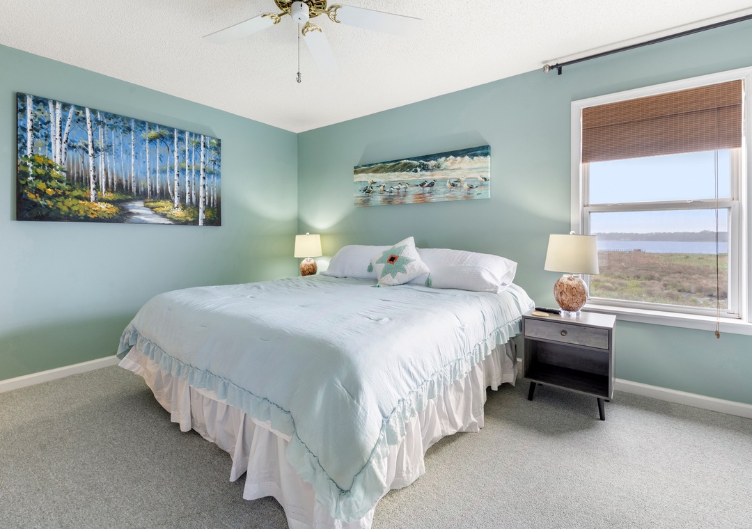 If serenity and nature are top priorities for your next Outer Banks vacation, Oyster Pointe E3 delivers both and then some! Located on the third floor, this gorgeous waterfront condo offers panoramic sound and sunset views. A comfortably furnished living and dining area opens up onto a private west-facing sun deck overlooking the sound. The interior has been fully renovated with upgrades that include hardwood flooring, stainless steel appliances, granite countertops and coastal-inspired decor throughout. Oyster Pointe is a hidden gem nestled among mature trees and features a community pool conveniently located directly across from Building E. Guests will also have access to a tennis court, and nature-lovers will appreciate the walking and biking paths that run throughout the complex. The nearby public sound access on Canal Drive is the perfect place for launching kayaks to explore the marshes and wildlife of Colington Creek. The public beach access at 1st Street is only a 6-minute bike ride away, and also provides free parking for guests who'd prefer to drive.