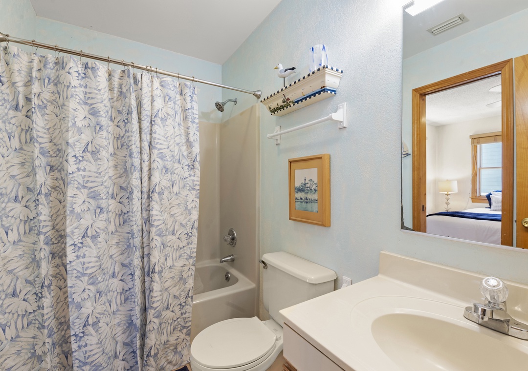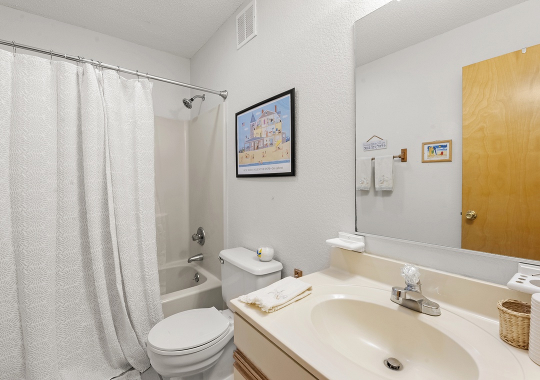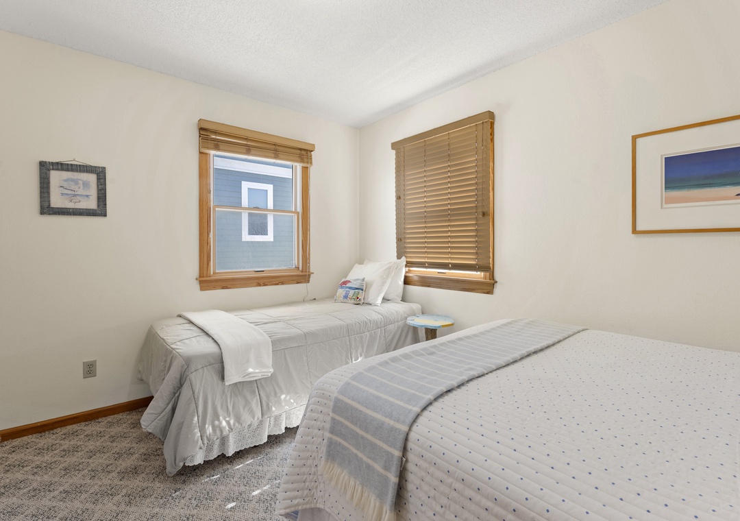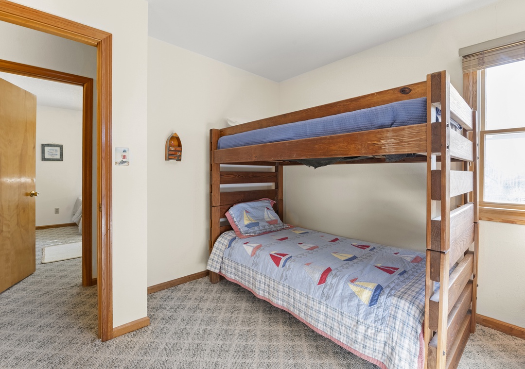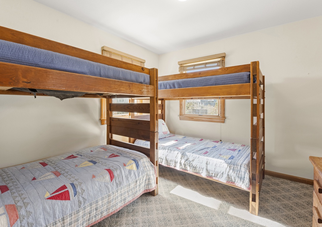 Moving back inside on the middle level, you’ll discover a cozy queen bedroom with a TV and access to a covered deck, another queen bedroom, and a third bedroom featuring two twin bunk beds. This level also includes a full hall bathroom for easy access.