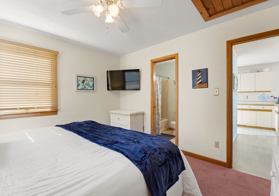 On the top level there is a spacious great room with a large TV and direct access to the sun deck. The fully equipped kitchen offers a breakfast bar for two, while the dining area seats six comfortably. A sunroom with a pub-style table for four adds extra space for relaxing or dining. This level also includes a bedroom with a king bedroom with, a TV and a bathroom!