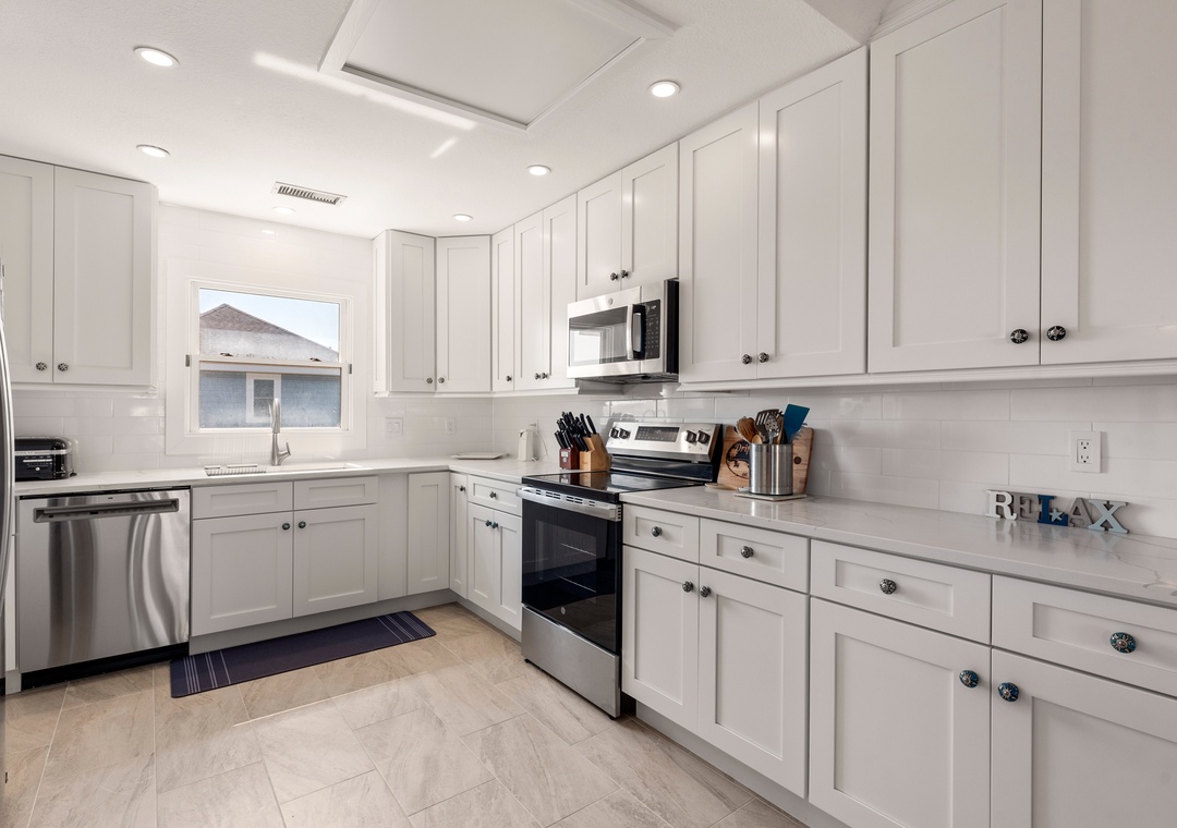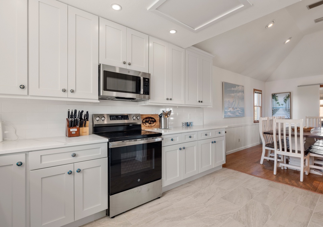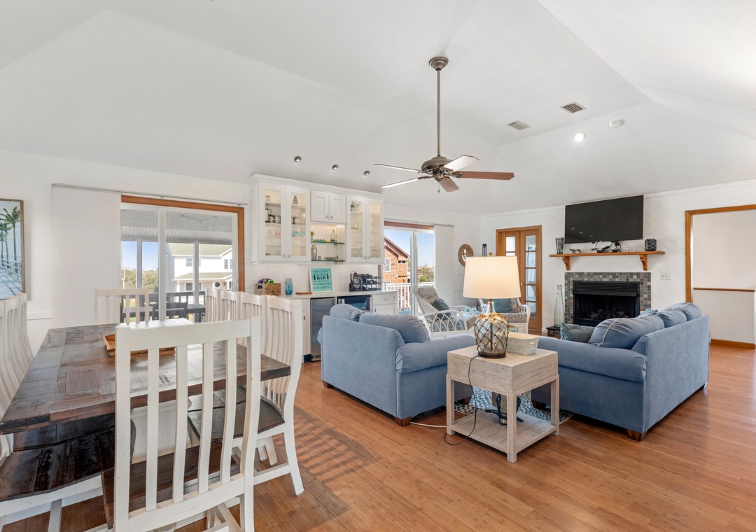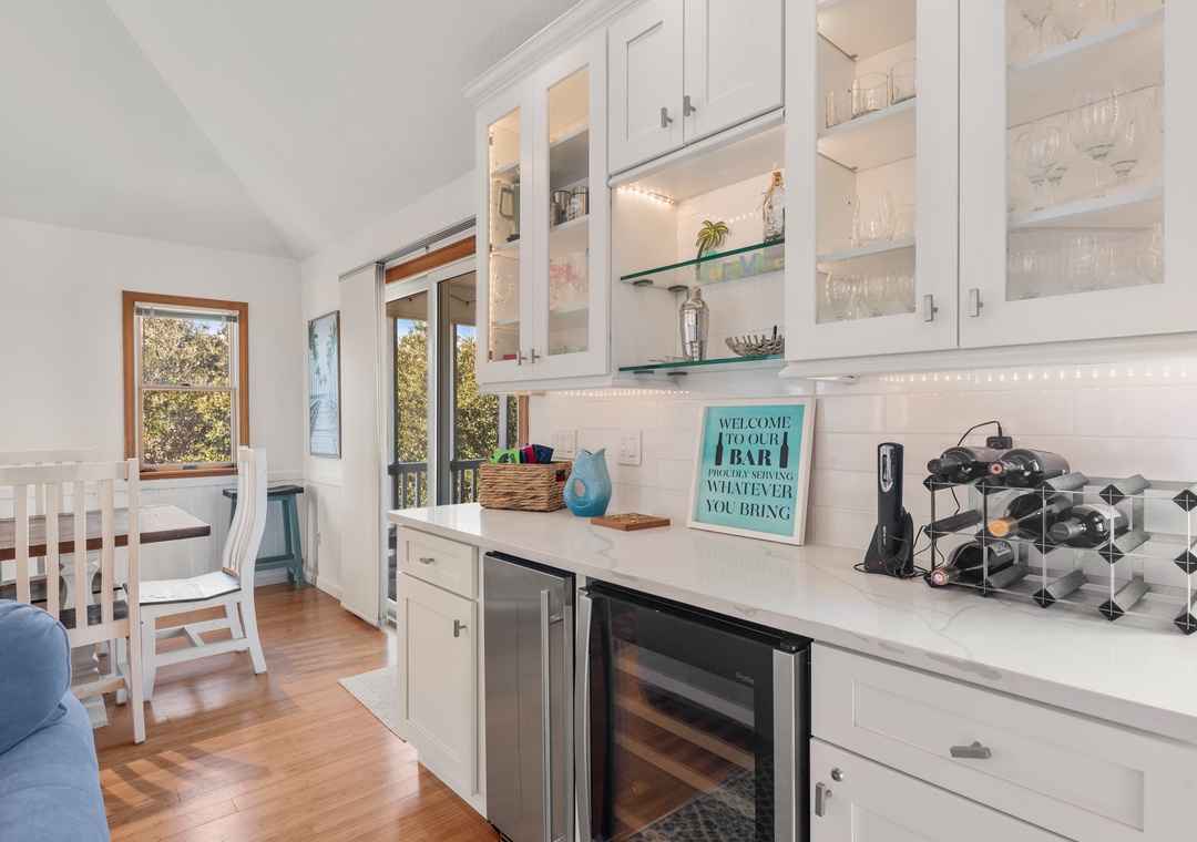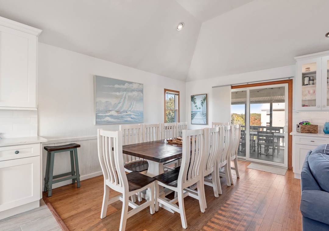 Drift Away makes the most of outdoor living, with a private pool, two levels of decking and a fenced-in side yard. The pool area includes a unique screened-in gazebo and convenient access to a full bathroom on the ground level. Use the elevator to make unpacking luggage and groceries hassle-free. The top level living, dining and kitchen areas feature vaulted ceilings, beach-friendly LVT flooring throughout and an open-concept layout that encourages quality time spent together. A separate office space with built-in desk is ideal for guests who need to keep up with work or school remotely. The large dining table seats 10, so everyone can enjoy meals together. Three master suites ensure that everyone has the space and privacy they need.