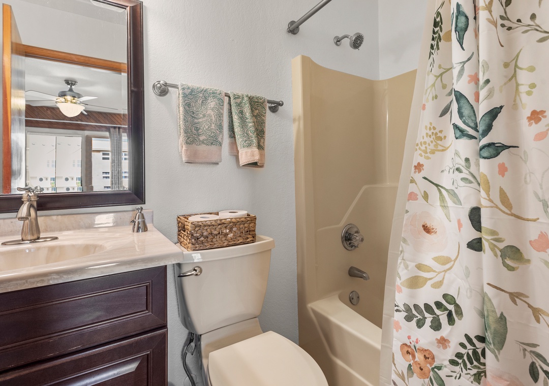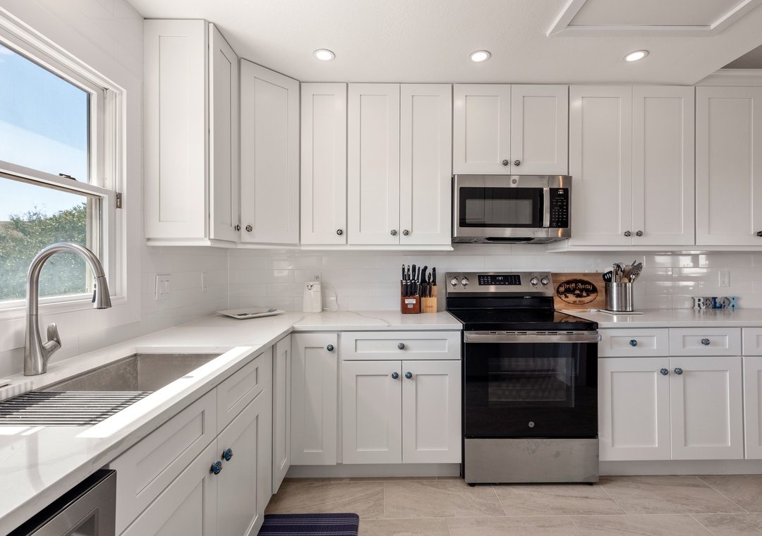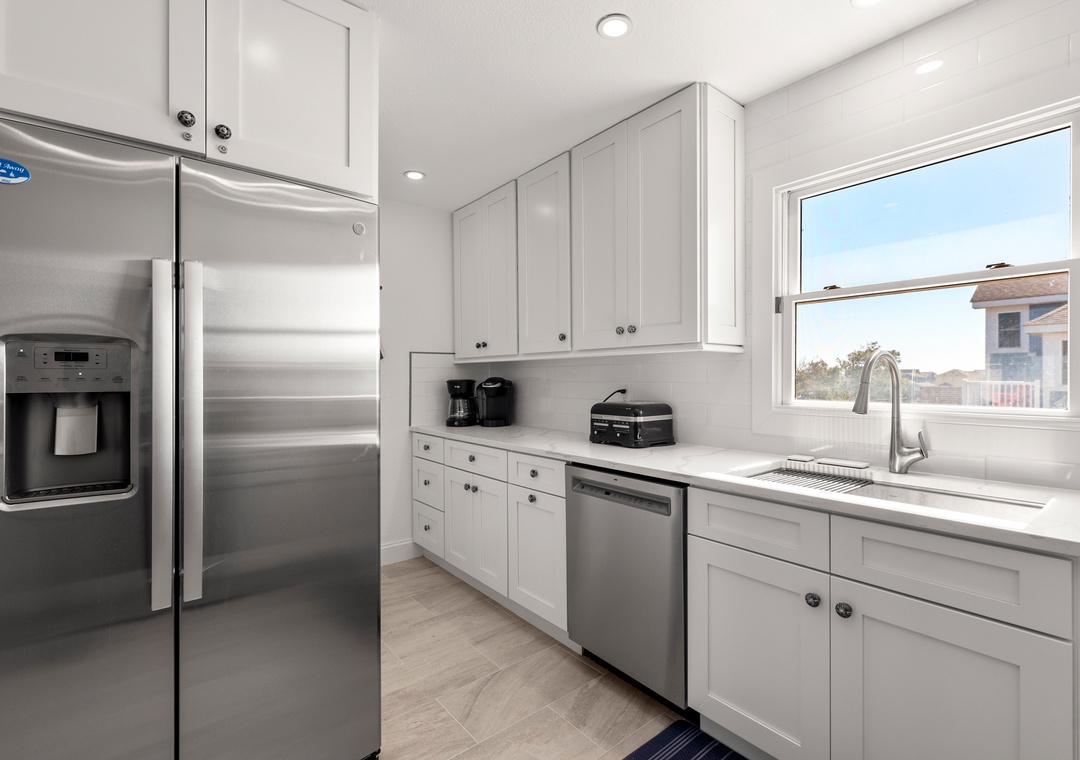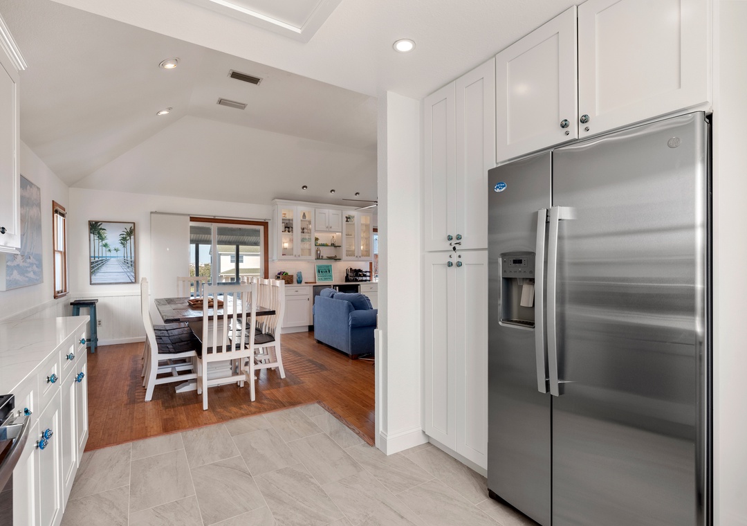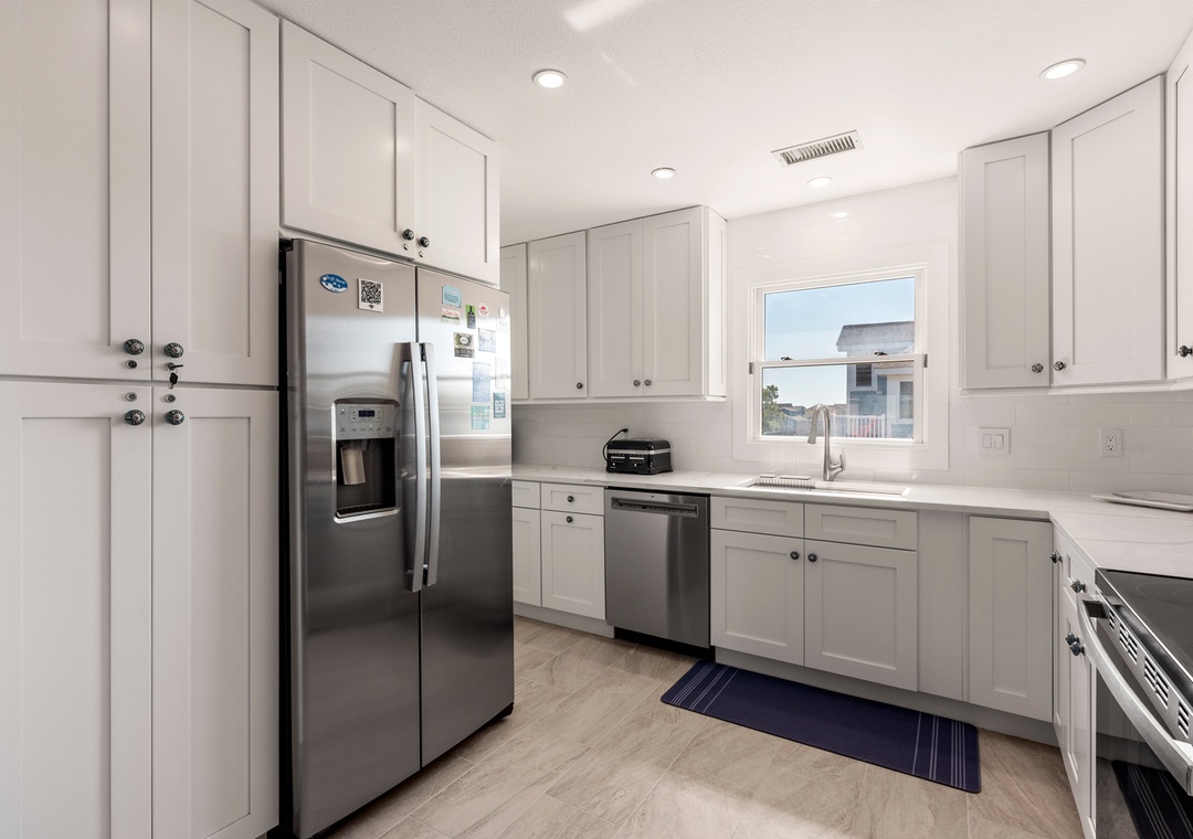 Drift Away makes the most of outdoor living, with a private pool, two levels of decking and a fenced-in side yard. The pool area includes a unique screened-in gazebo and convenient access to a full bathroom on the ground level. Use the elevator to make unpacking luggage and groceries hassle-free. The top level living, dining and kitchen areas feature vaulted ceilings, beach-friendly LVT flooring throughout and an open-concept layout that encourages quality time spent together. A separate office space with built-in desk is ideal for guests who need to keep up with work or school remotely. The large dining table seats 10, so everyone can enjoy meals together. Three master suites ensure that everyone has the space and privacy they need.