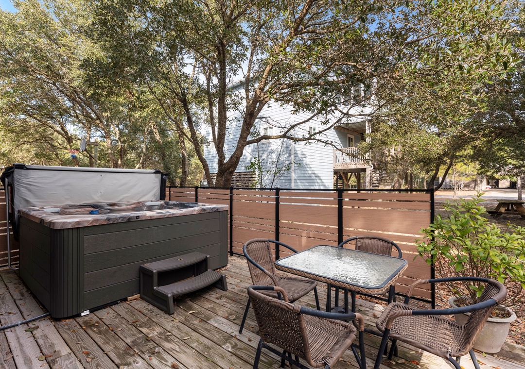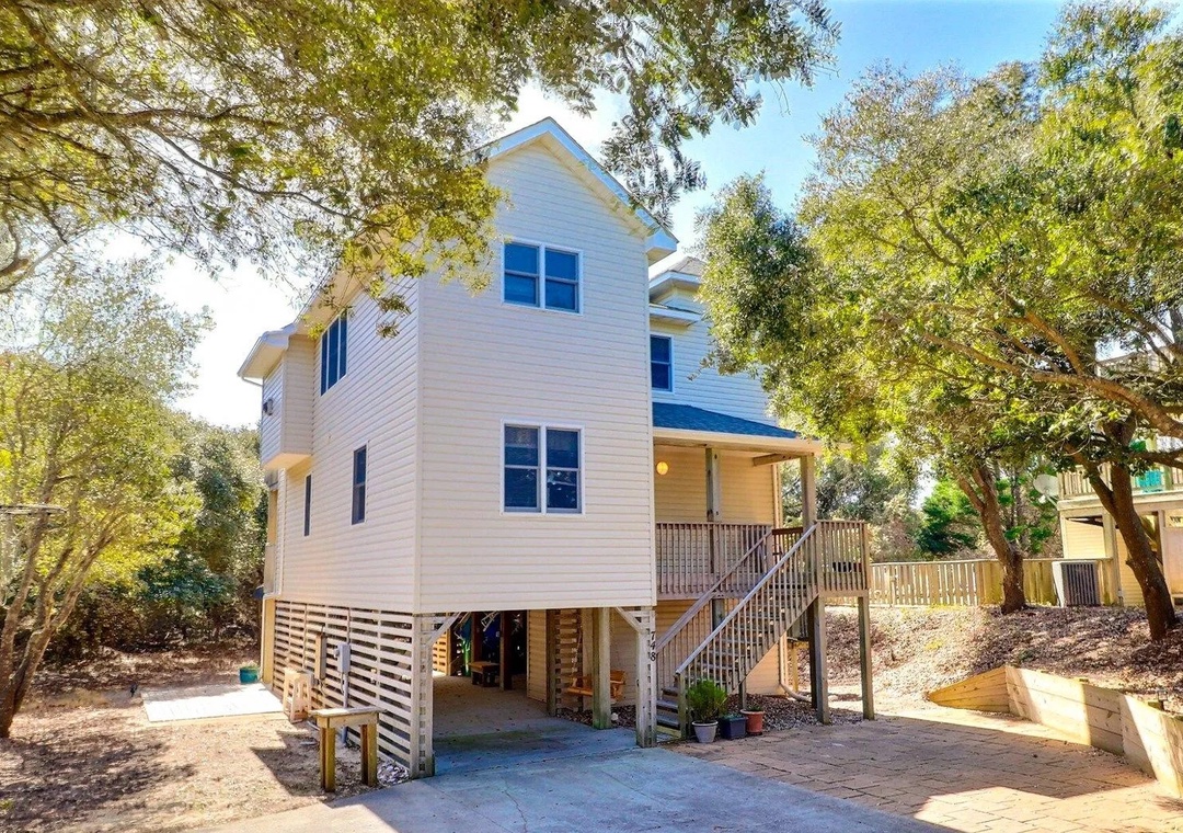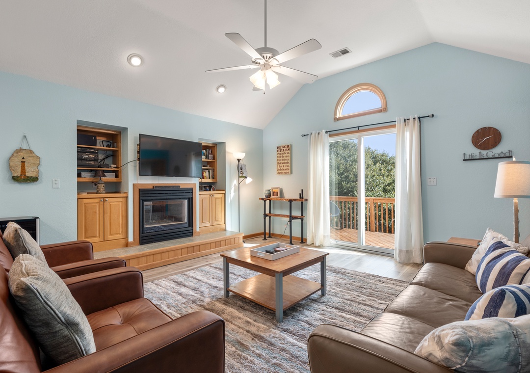 Inside, you'll find a casual and family-friendly living area with vaulted ceilings and abundant natural light. In the off-season, use the gas fireplace for staying cozy during cooler Spring and Fall evenings. This comfortably furnished gathering space leads out to a spacious sun deck for plenty of Vitamin D and salty coastal breezes. The chef in the group will appreciate the well-equipped kitchen and open-concept layout, where they can prepare meals while still being part of the action. The top-level primary bedroom also provides deck access and includes a private bath. Downstairs you'll find three additional bedrooms, including a queen ensuite with private bath and deck access.
