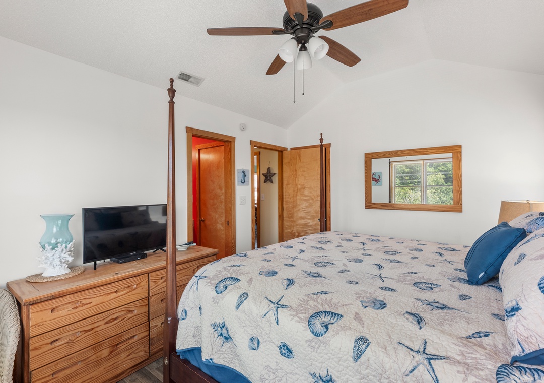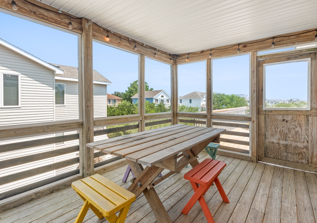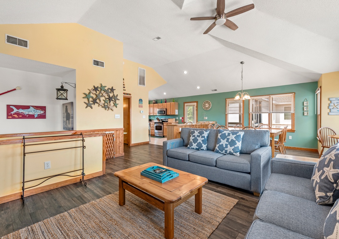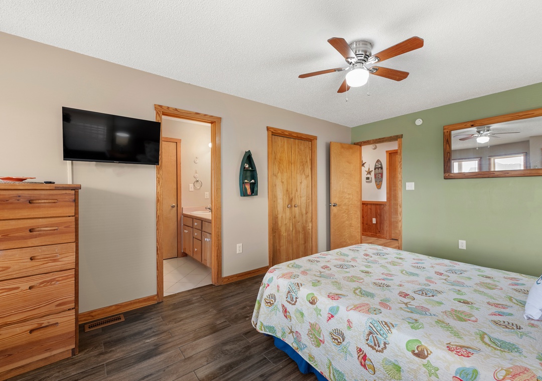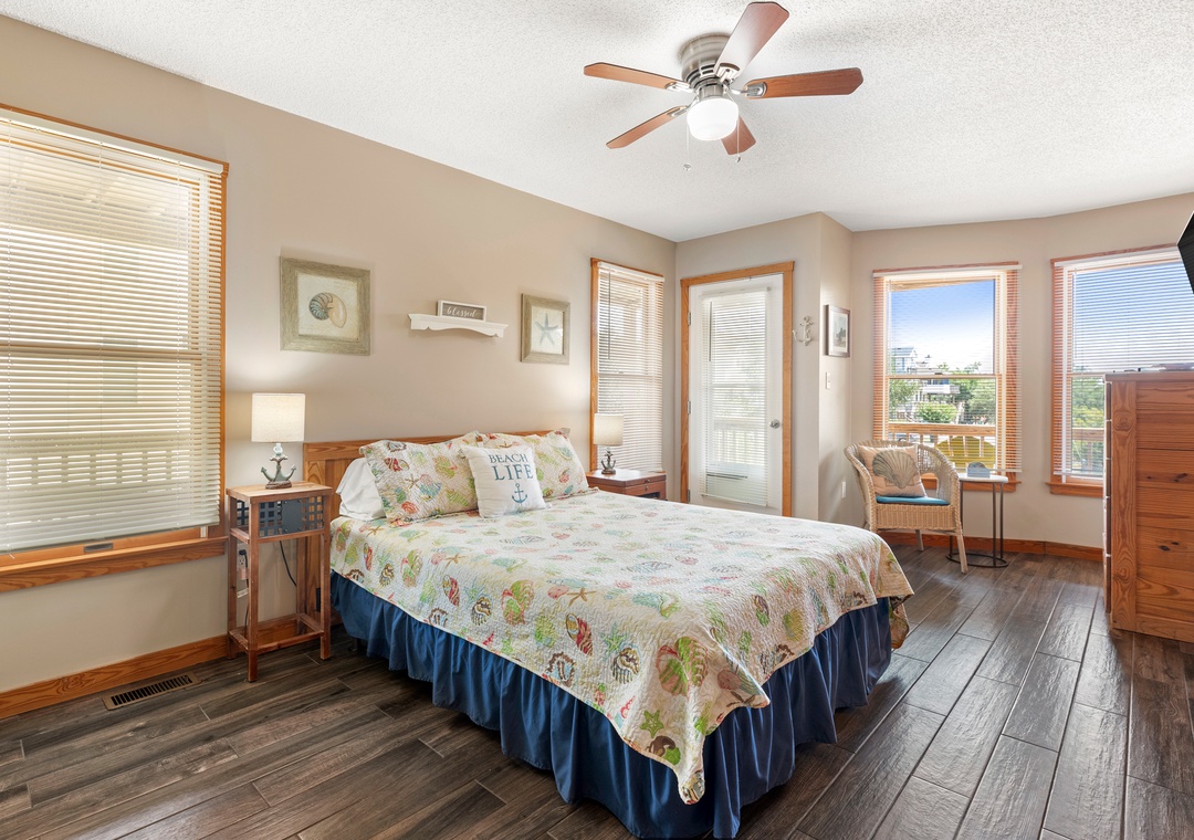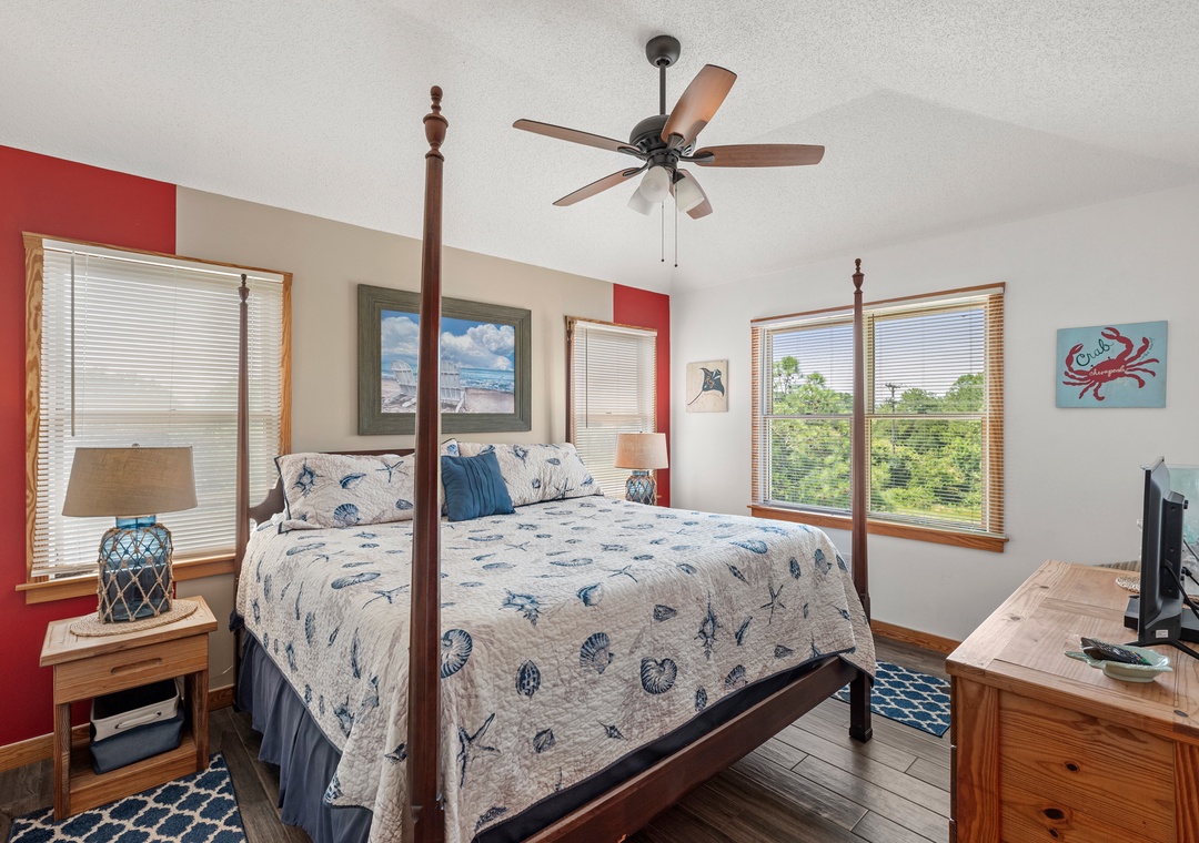 Head upstairs to the heart of the home—an open great room where beachy breezes meet modern comfort. Kick back with a movie on the flat-screen TV and gather for the best movie nights with the surround sound. The kitchen is fully equipped and ready for your crew, with counter seating for four and easy access to a screened porch for morning coffee or evening cocktails. The dining room seats ten, so there’s always room for one more at the table. The king bedroom on this level offers a peaceful retreat with its own flat-screen TV and a semi-private full bath that also connects to the main living area.