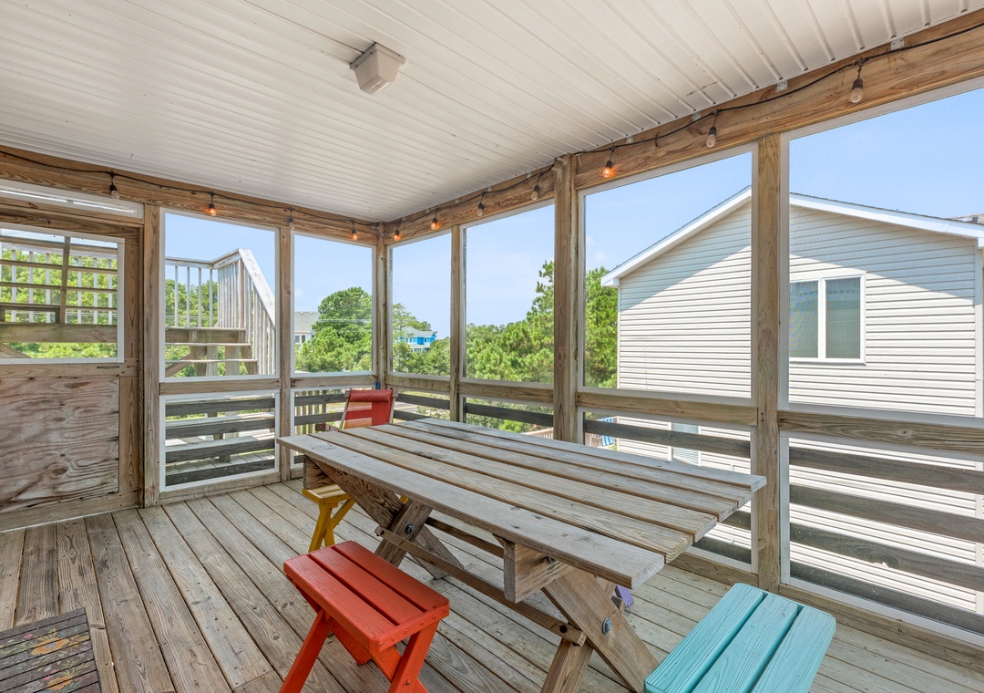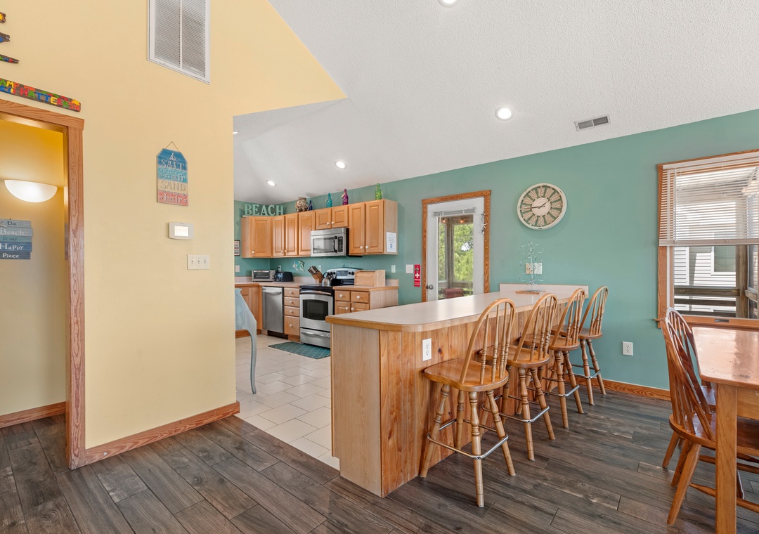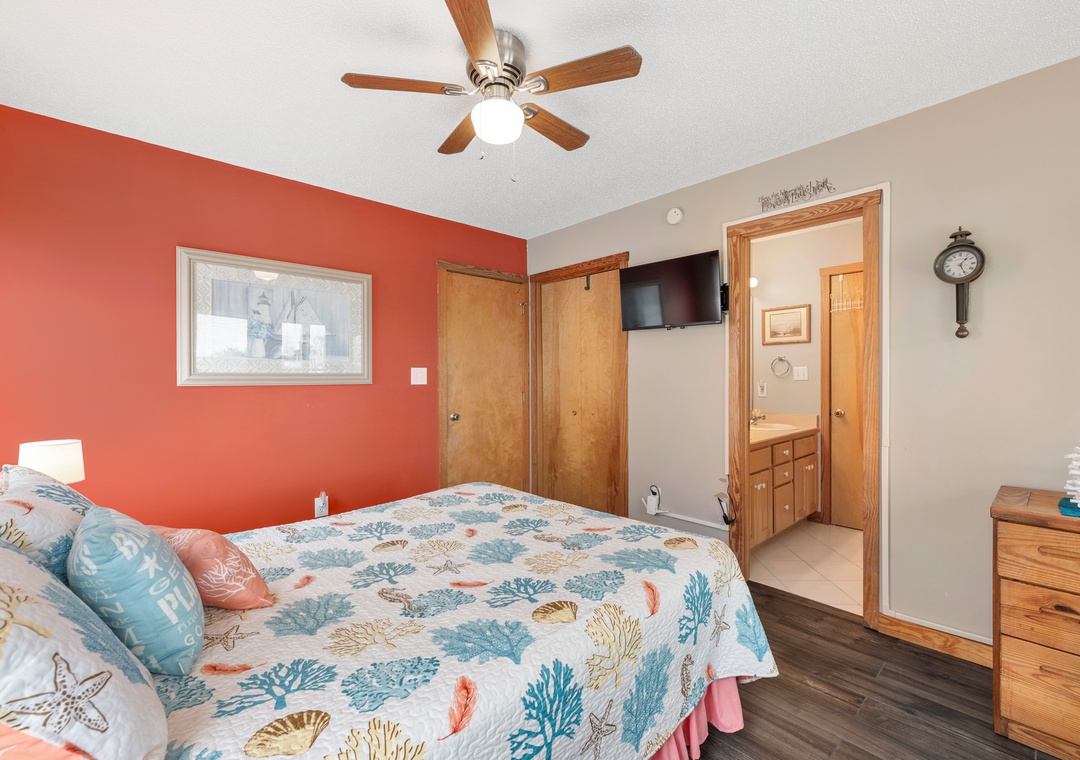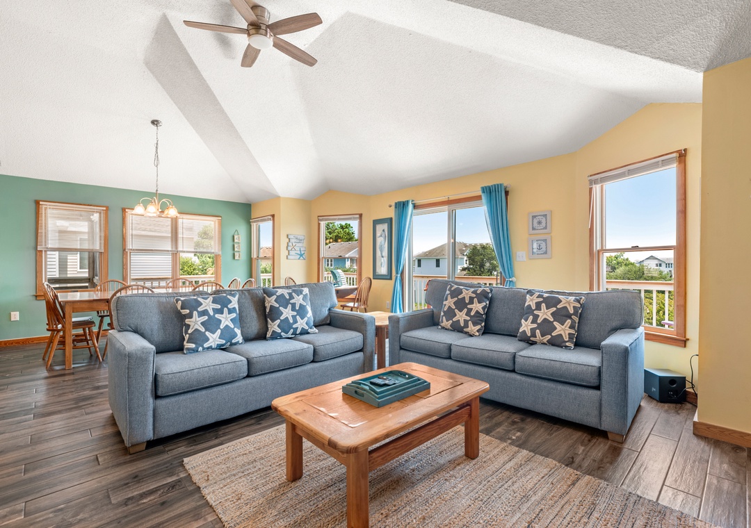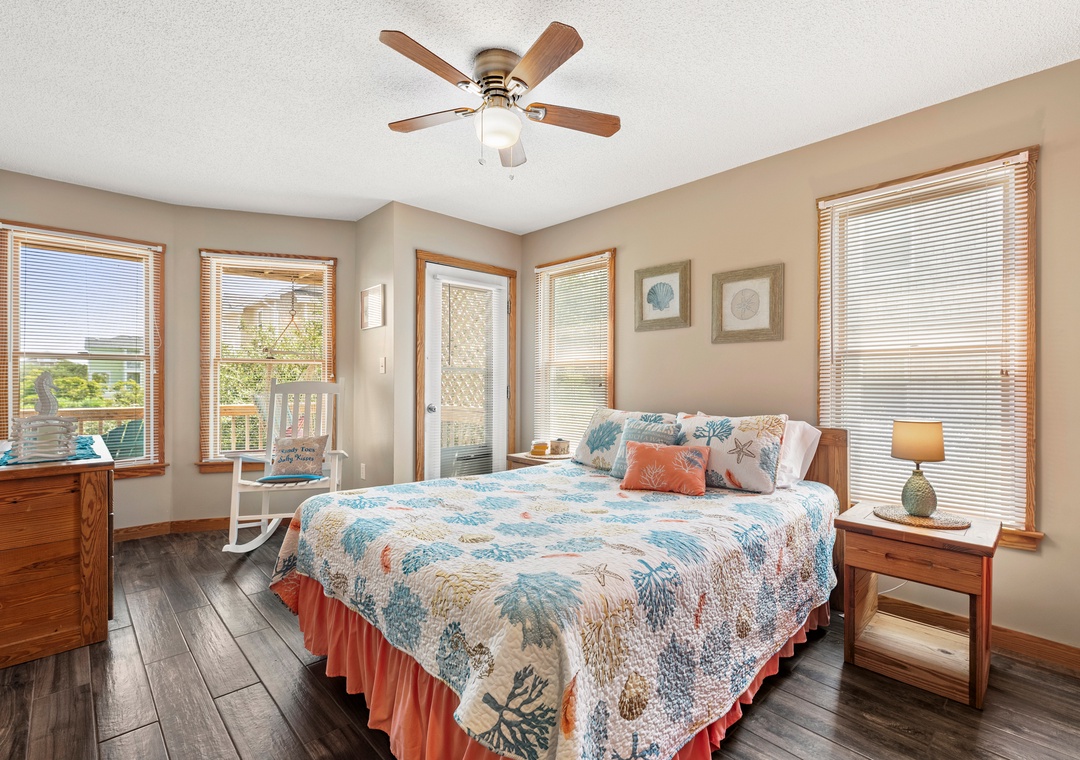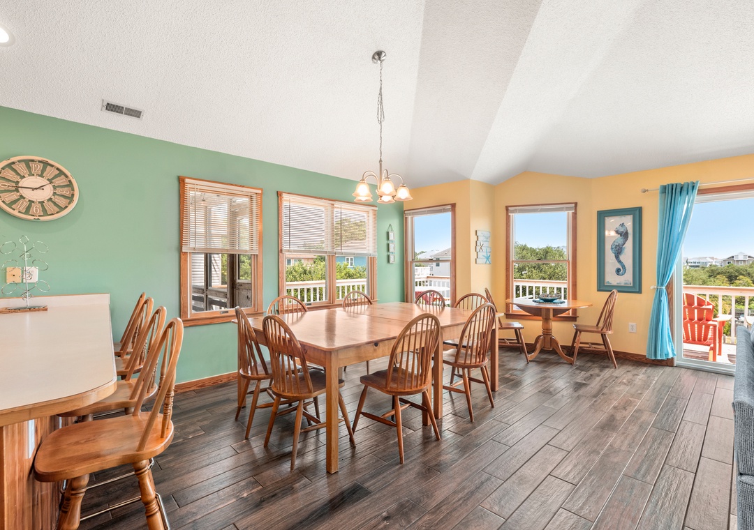 Head upstairs to the heart of the home—an open great room where beachy breezes meet modern comfort. Kick back with a movie on the flat-screen TV and gather for the best movie nights with the surround sound. The kitchen is fully equipped and ready for your crew, with counter seating for four and easy access to a screened porch for morning coffee or evening cocktails. The dining room seats ten, so there’s always room for one more at the table. The king bedroom on this level offers a peaceful retreat with its own flat-screen TV and a semi-private full bath that also connects to the main living area.