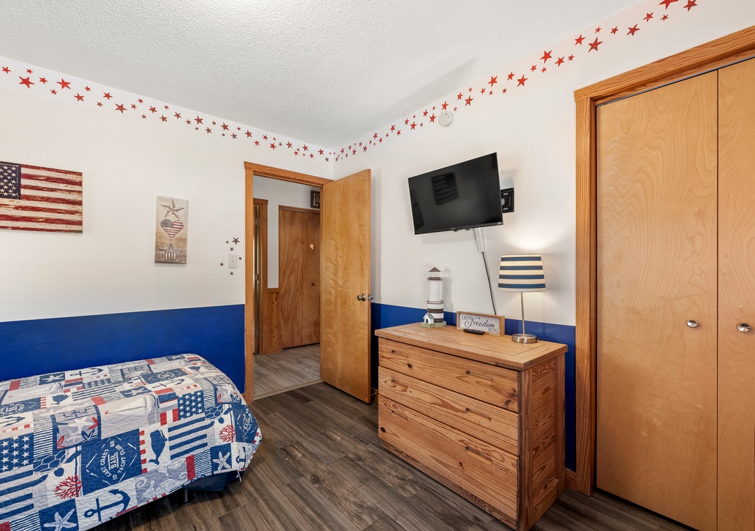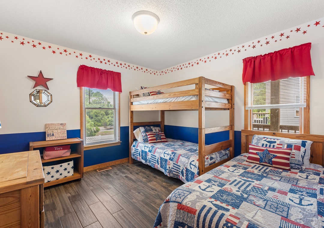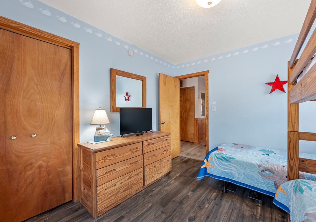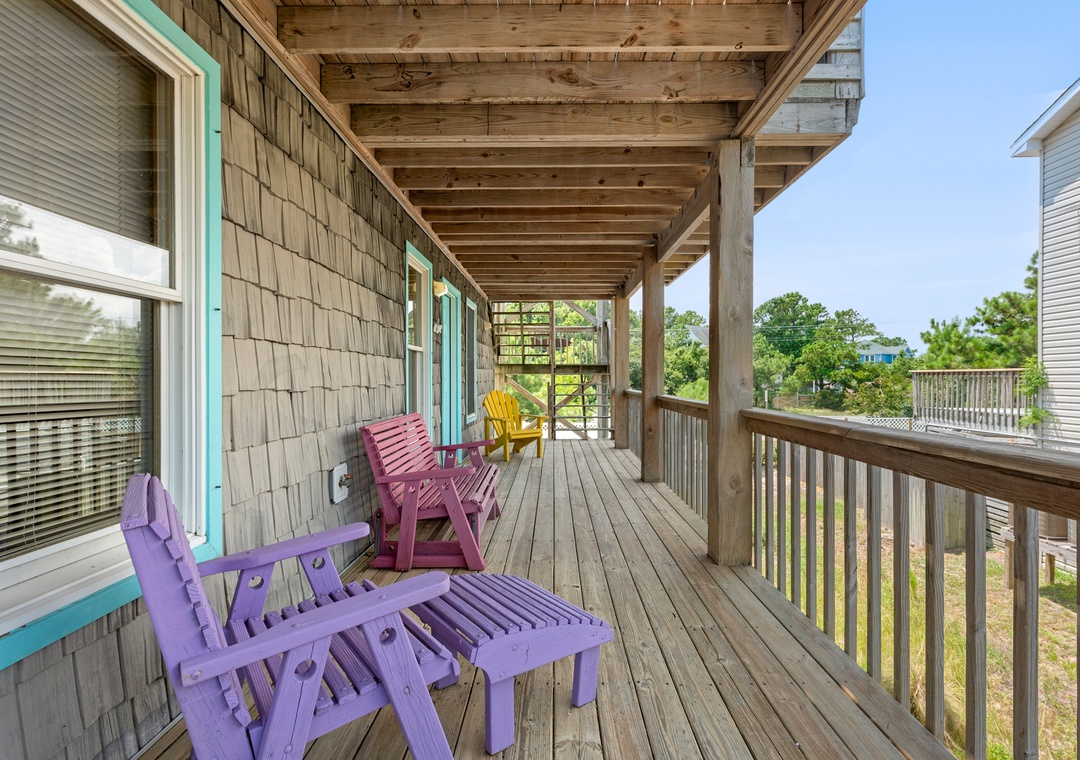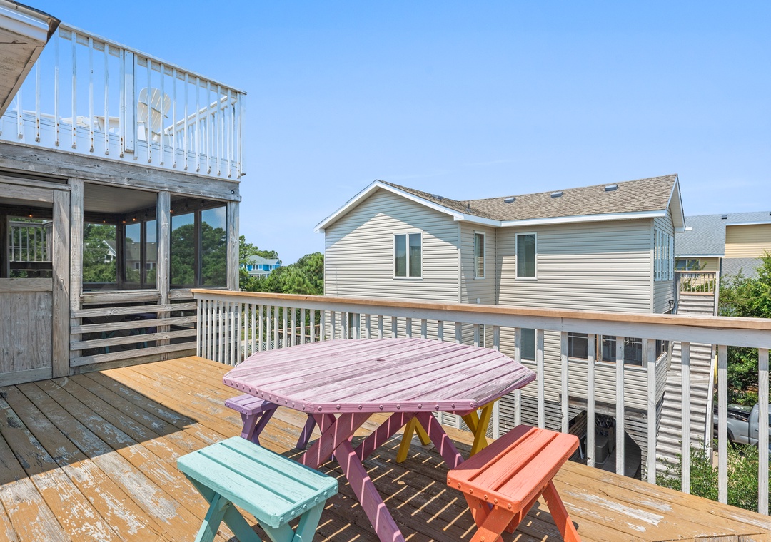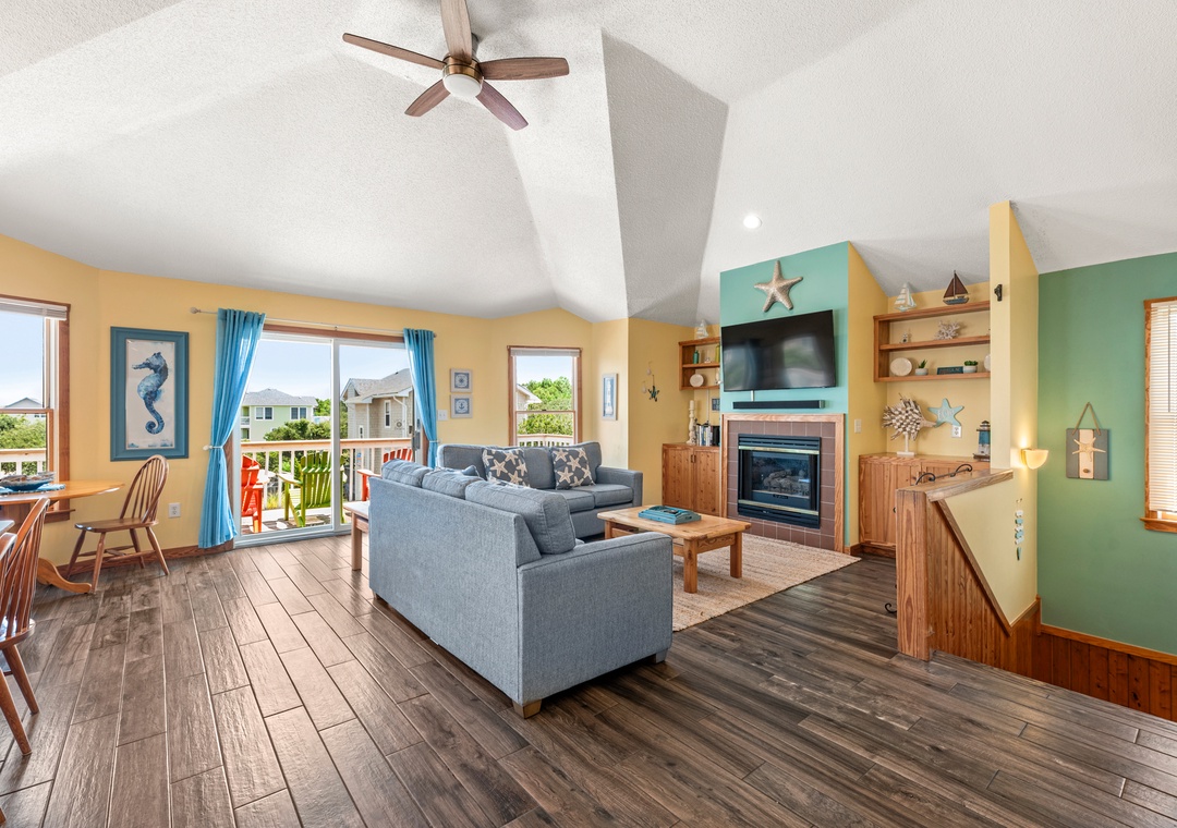 Head upstairs to the heart of the home—an open great room where beachy breezes meet modern comfort. Kick back with a movie on the flat-screen TV and gather for the best movie nights with the surround sound. The kitchen is fully equipped and ready for your crew, with counter seating for four and easy access to a screened porch for morning coffee or evening cocktails. The dining room seats ten, so there’s always room for one more at the table. The king bedroom on this level offers a peaceful retreat with its own flat-screen TV and a semi-private full bath that also connects to the main living area.